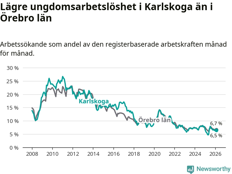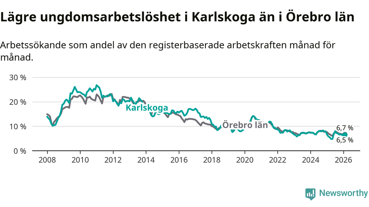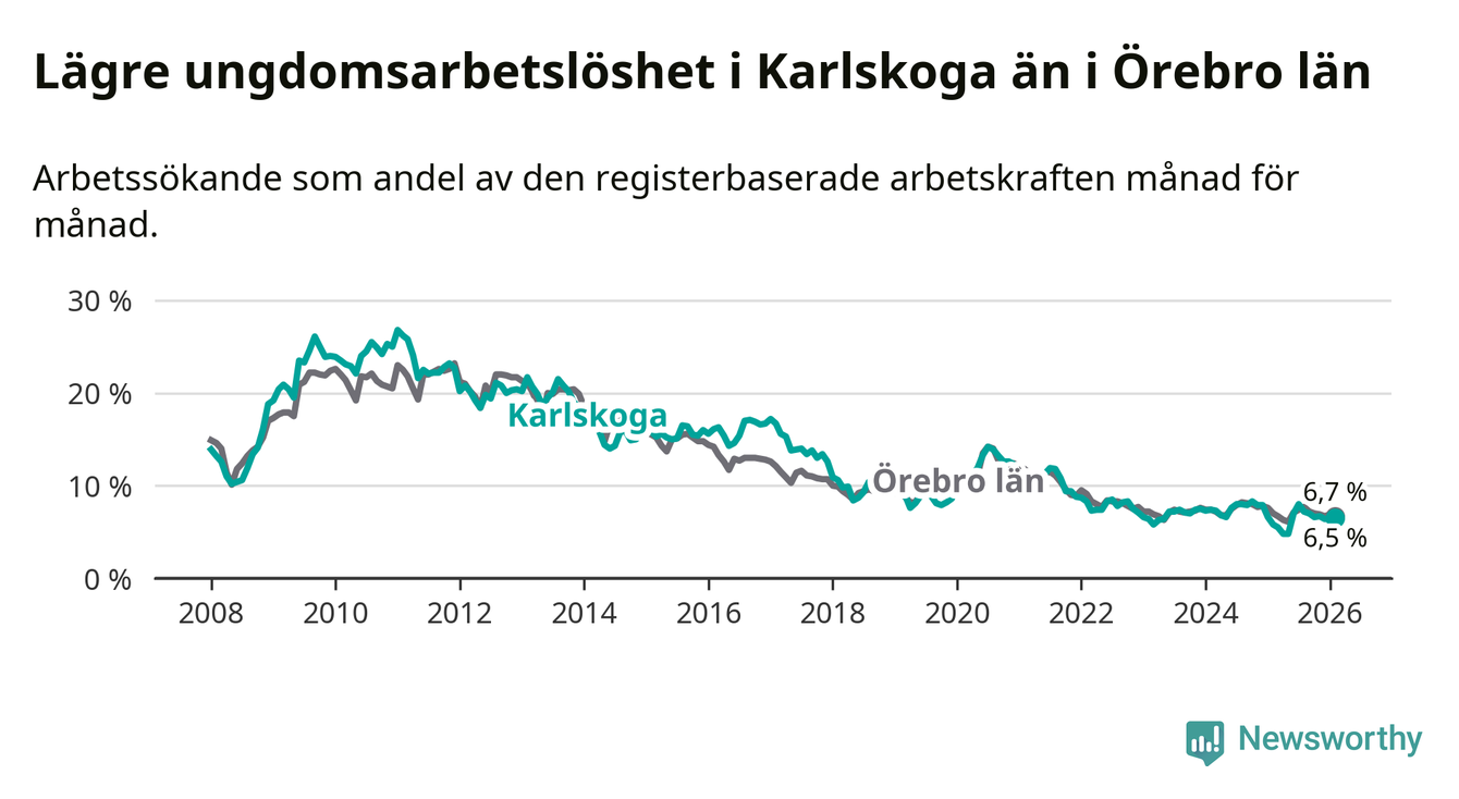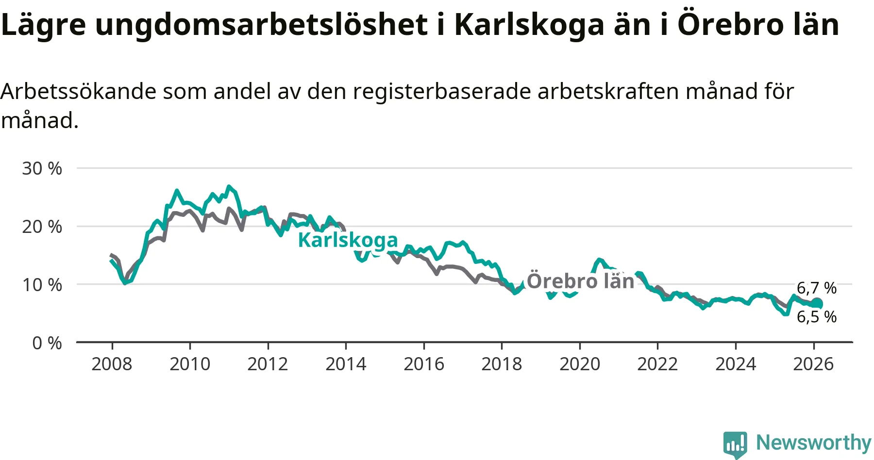 Precis som den totala arbetslösheten ligger ungdomsarbetslösheten i Karlskoga lägre än i Örebro som helhet. Skillnaden mellan kommunen och länet är 0,2 procentenheter.