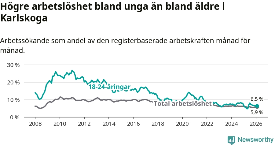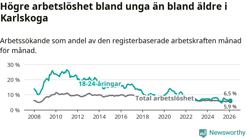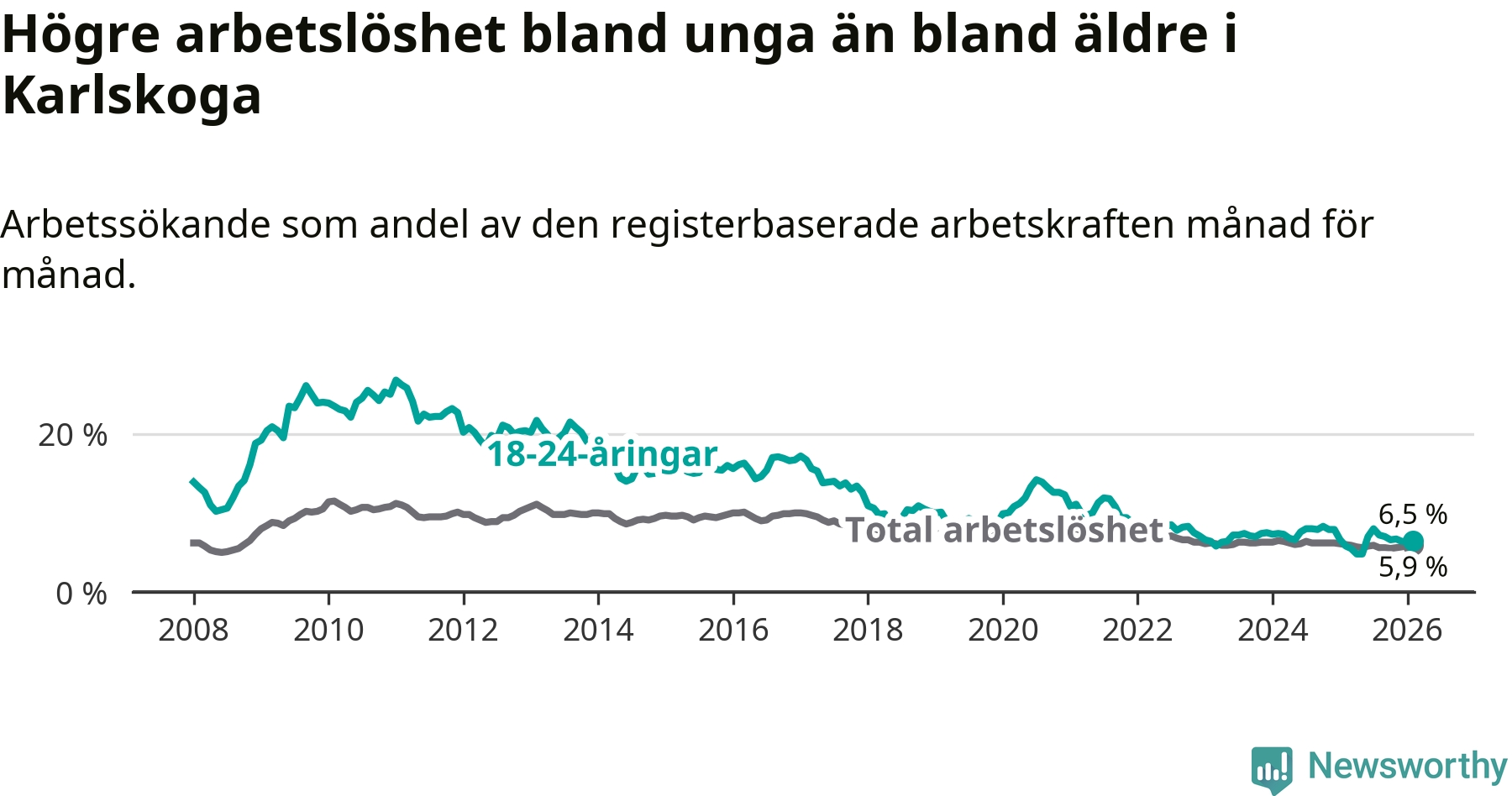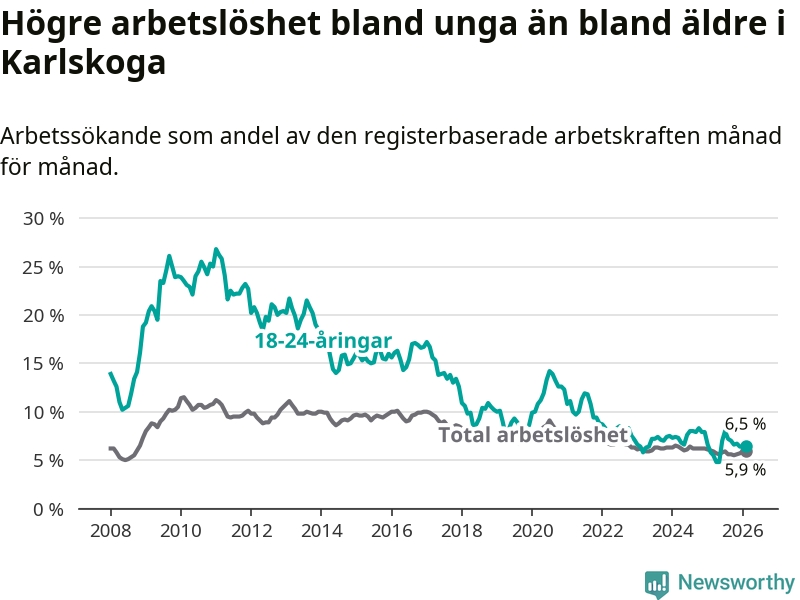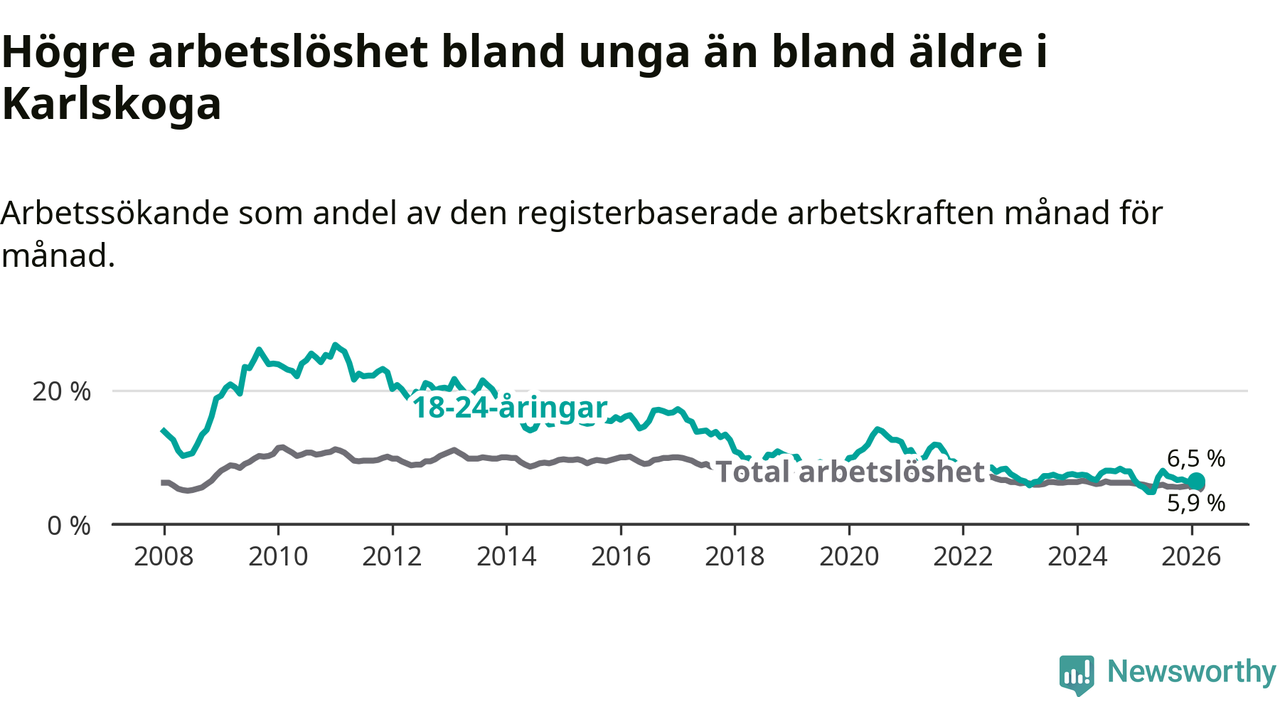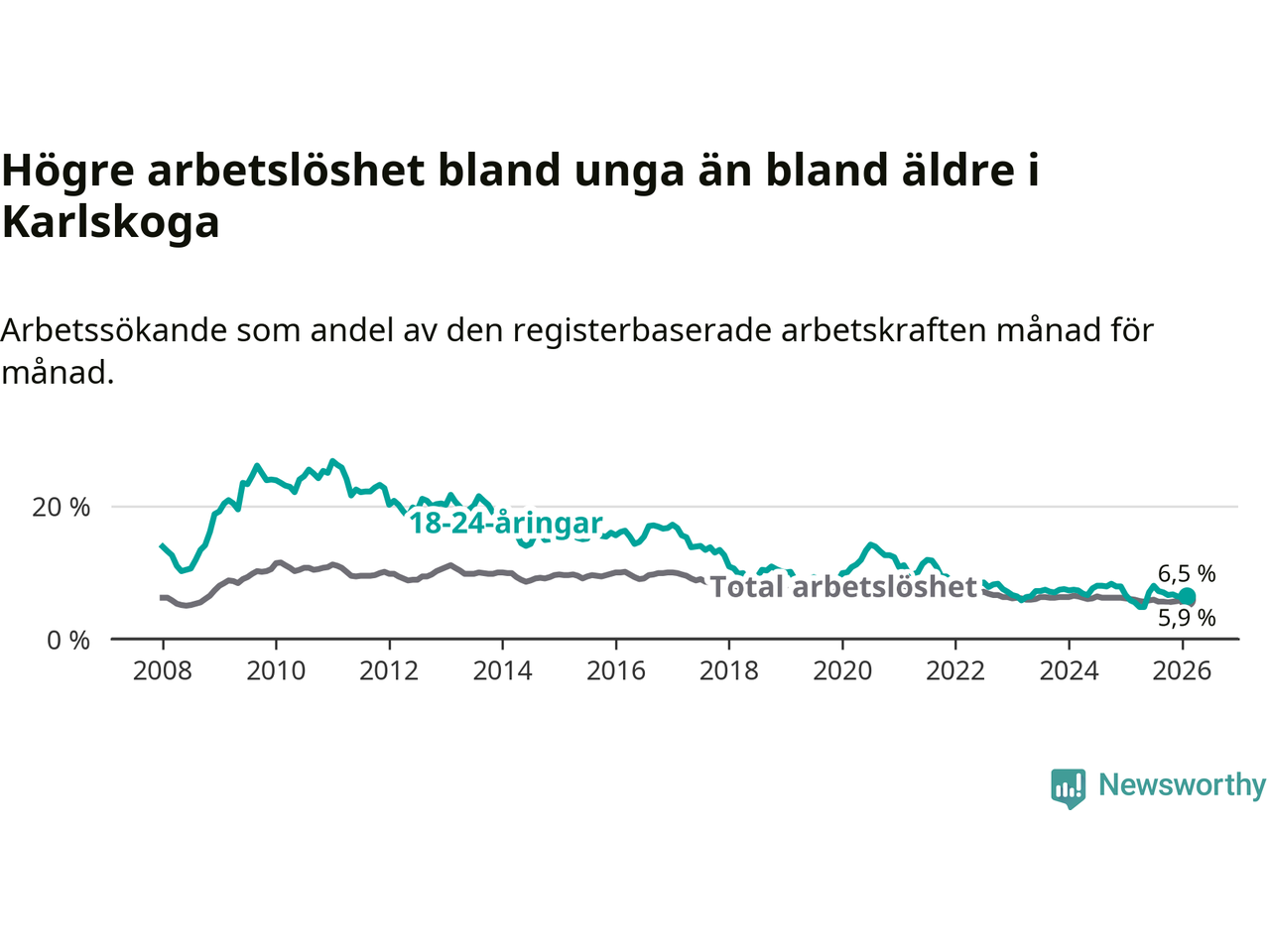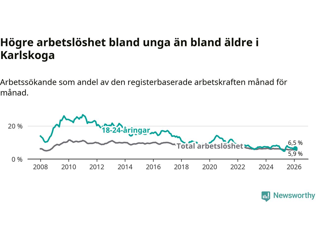 Till skillnad från den totala arbetslösheten stiger arbetslösheten bland unga (+0,7 procentenheter). I februari var 6,5 procent av 18–24-åringarna inskrivna som arbetssökande (motsvarande 98 personer). Mäter vi antalet inskrivna ser vi en ökning med elva personer på ett års sikt.