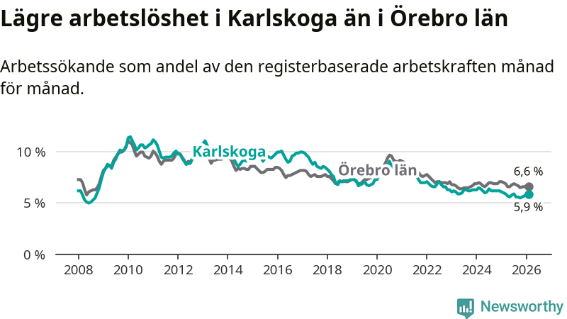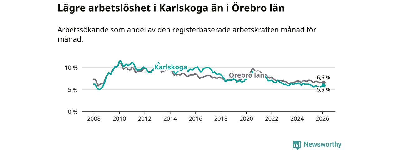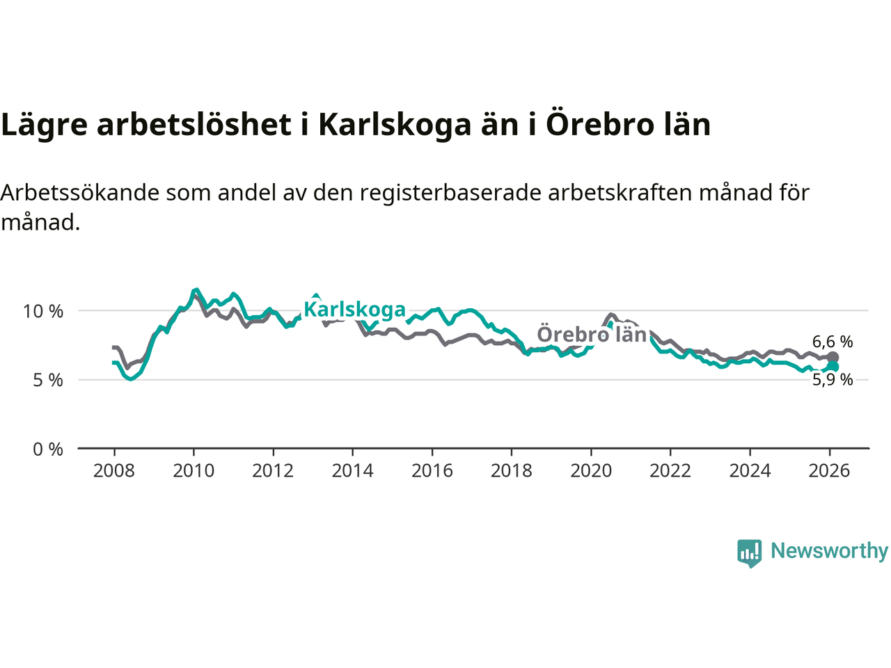 Karlskoga hade redan tidigare lägre arbetslöshet än snittet i hela Örebro län och nu växer klyftan (5,9 procent i kommunen, jämfört med 6,6 procent i hela länet). Askersund och Lekeberg har den lägsta arbetslösheten i länet (4,1 procent), medan Ljusnarsberg och Örebro har den högsta (7,4 procent). För att Karlskoga skulle komma ner i samma arbetslöshetsnivå som Askersund och Lekeberg skulle 262 personer behöva sysselsättas.