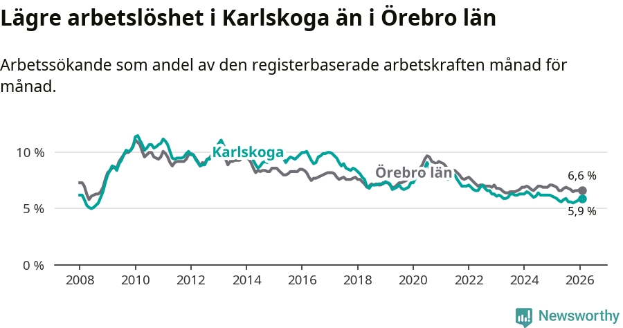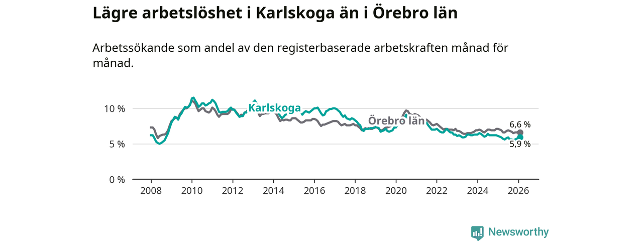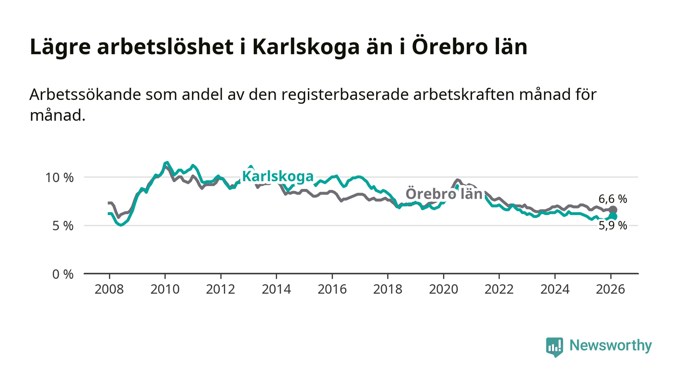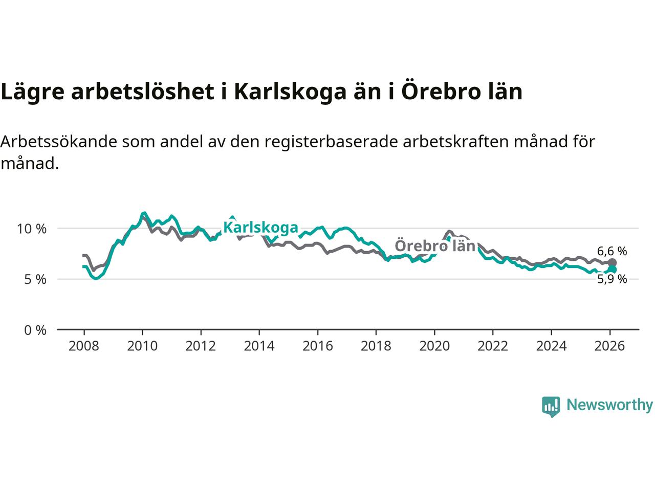 Under februari månad rapporterade Karlskoga kommun en total arbetslöshet på 5,9 procent. Det är en minskning jämfört med samma tidpunkt i fjol (−0,1 procentenheter). Även i Örebro län sjunker arbetslösheten .