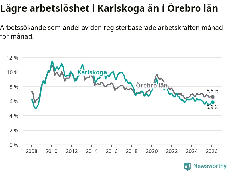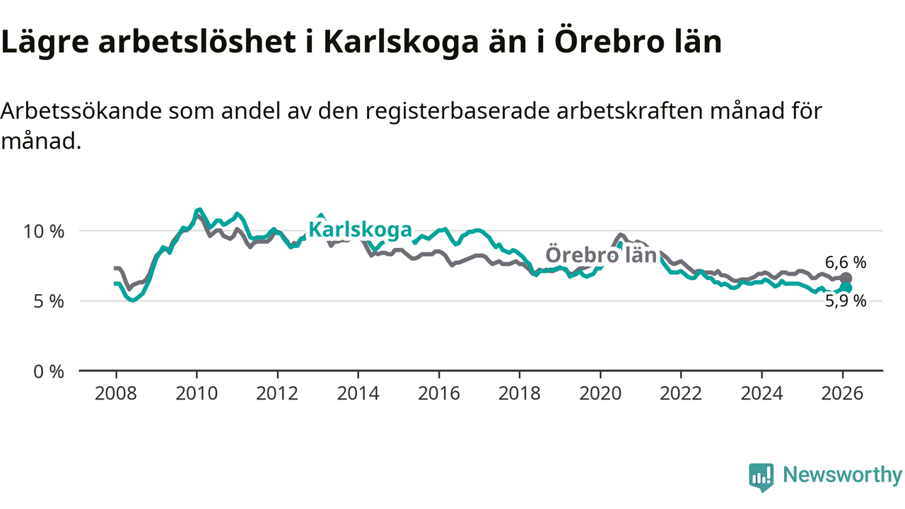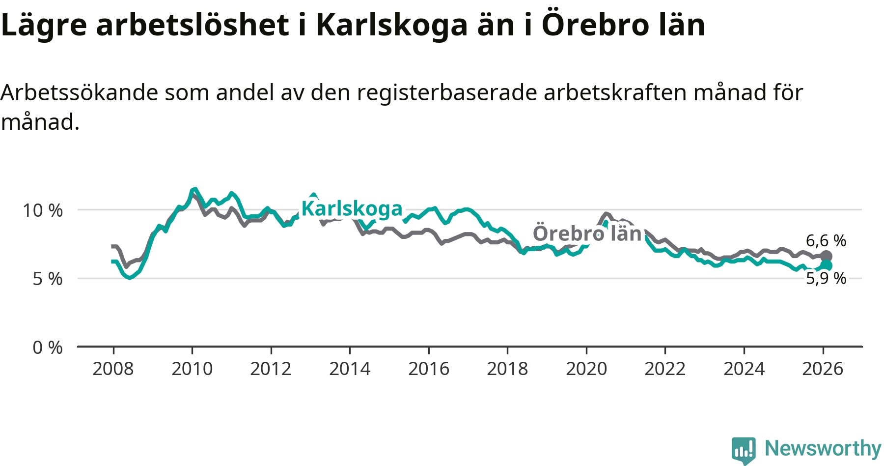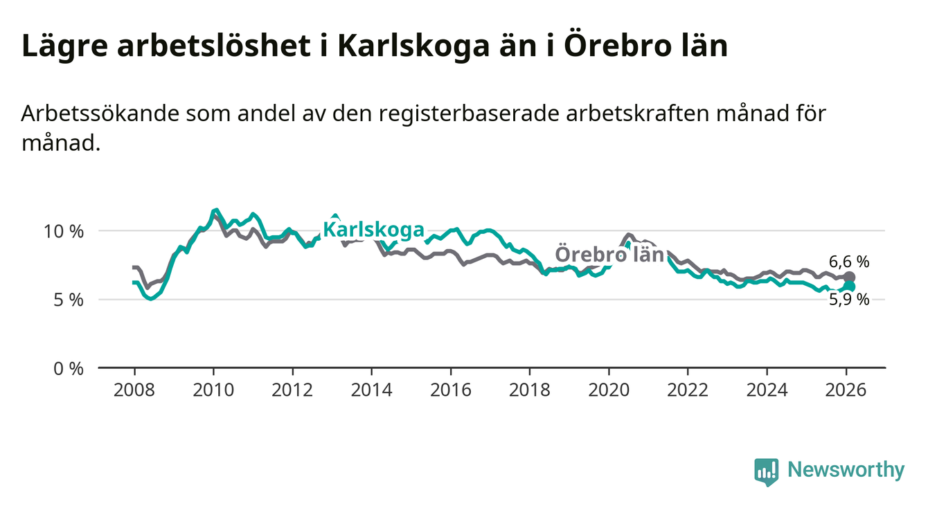 Under februari månad rapporterade Karlskoga kommun en total arbetslöshet på 5,9 procent. Det är en minskning jämfört med samma tidpunkt i fjol (−0,1 procentenheter). Även i Örebro län sjunker arbetslösheten .