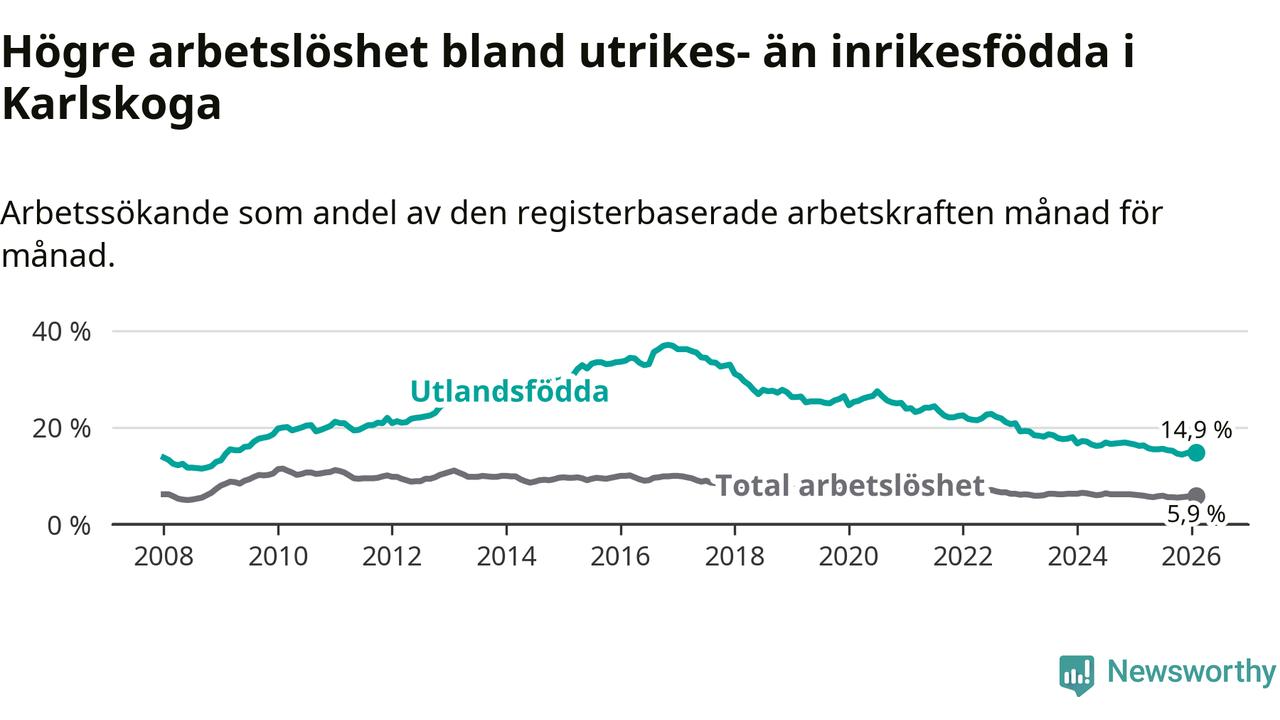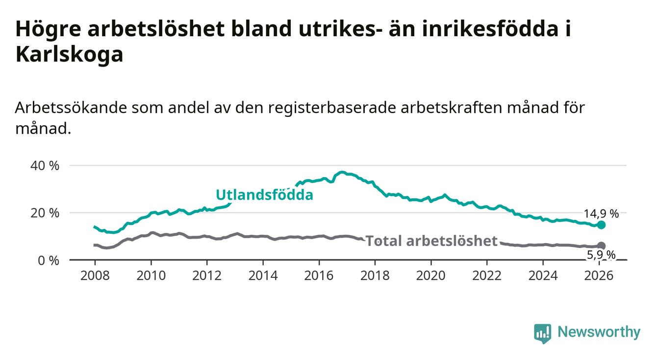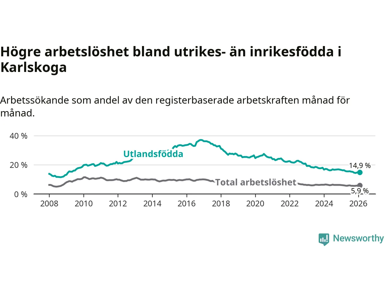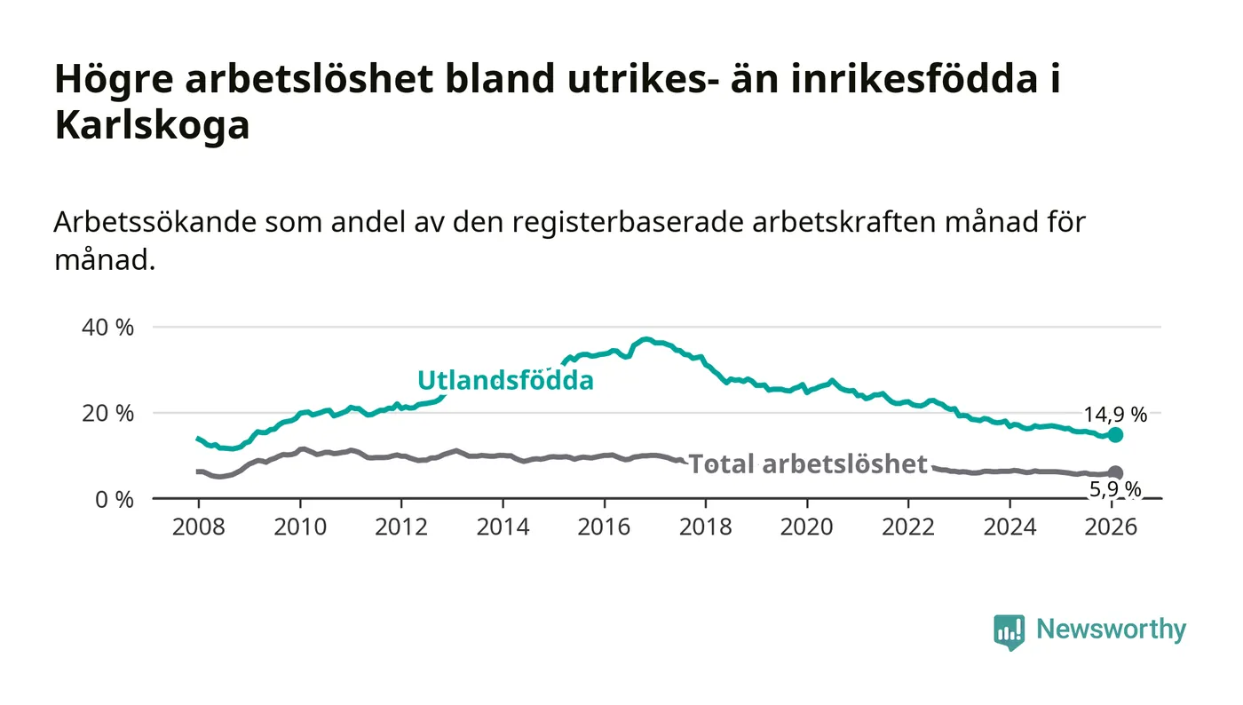 Arbetslösheten bland utlandsfödda var 14,9 procent i Karlskoga under februari månad, motsvarande 408 av 2 738 personer. Det är 1,3 procentenheter färre än vid samma tidpunkt i fjol (−34 om man räknar personer). Därmed har de utlandsföddas arbetslöshet varit lägre än vid samma tidpunkt i fjol i över fem år i sträck. Sedan september 2020 har arbetslösheten bland utlandsfödda minskat från 25,6 till 14,9 procent.