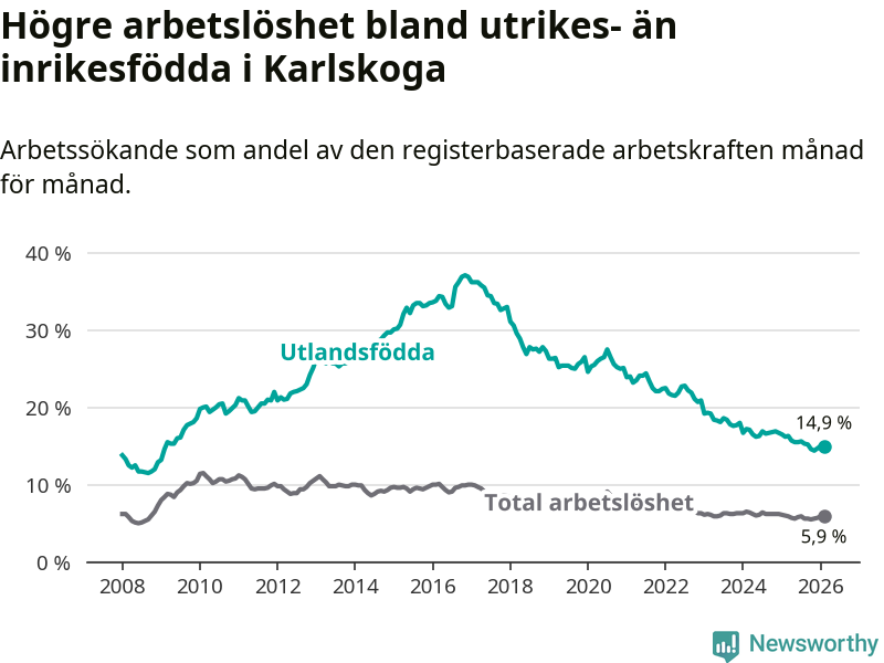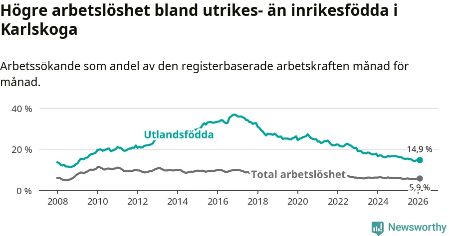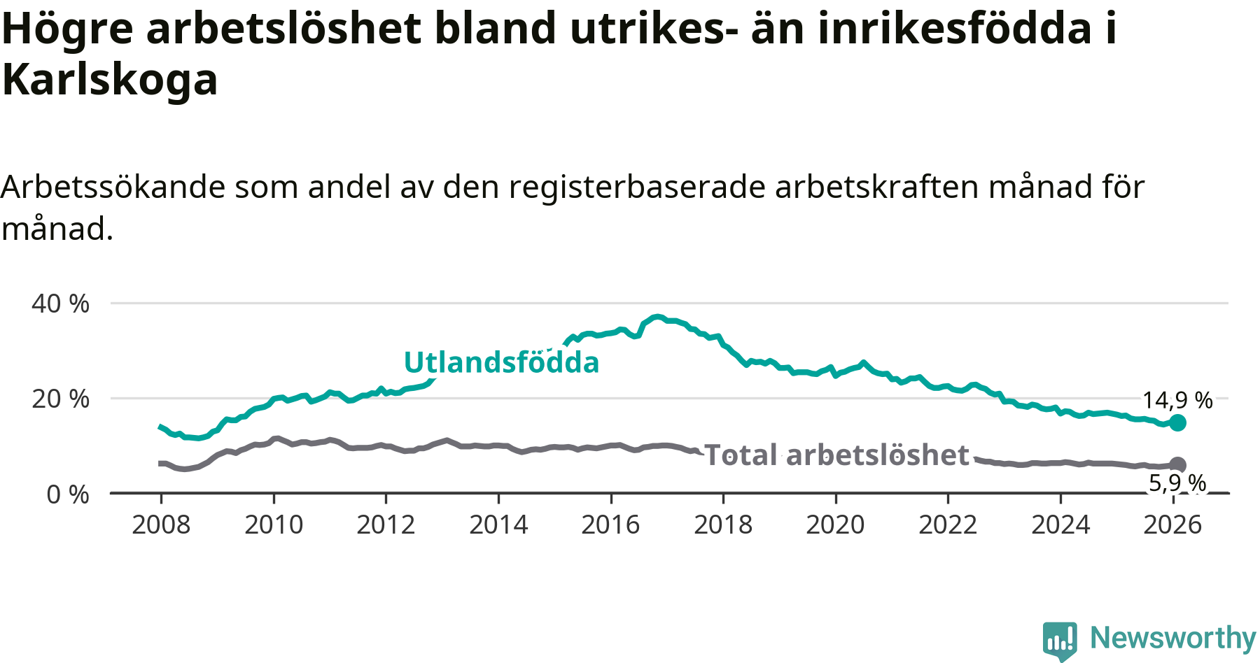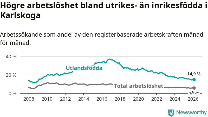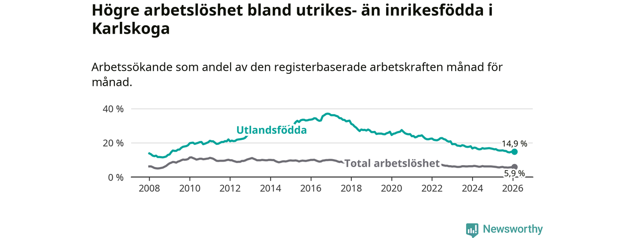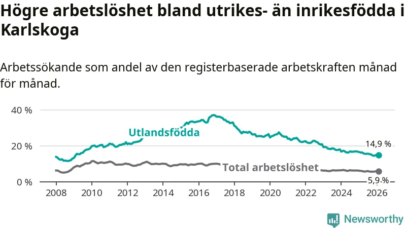 Arbetslösheten bland utlandsfödda var 14,9 procent i Karlskoga under februari månad, motsvarande 408 av 2 738 personer. Det är 1,3 procentenheter färre än vid samma tidpunkt i fjol (−34 om man räknar personer). Därmed har de utlandsföddas arbetslöshet varit lägre än vid samma tidpunkt i fjol i över fem år i sträck. Sedan september 2020 har arbetslösheten bland utlandsfödda minskat från 25,6 till 14,9 procent.