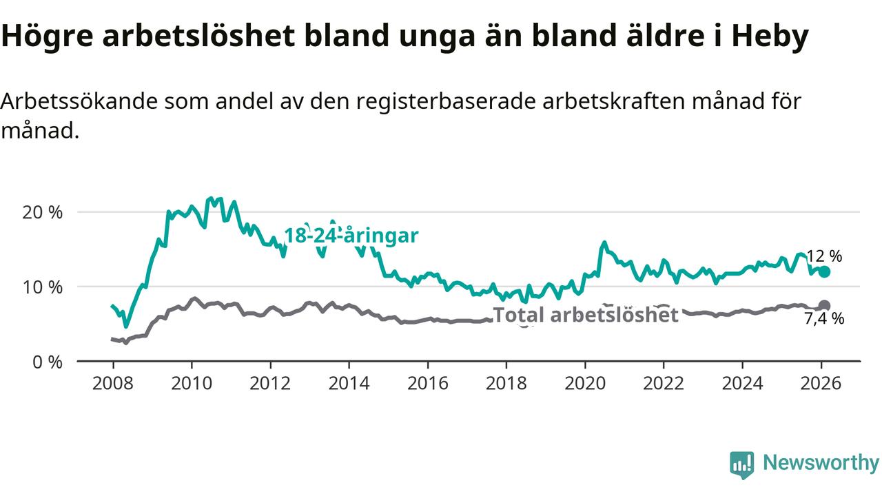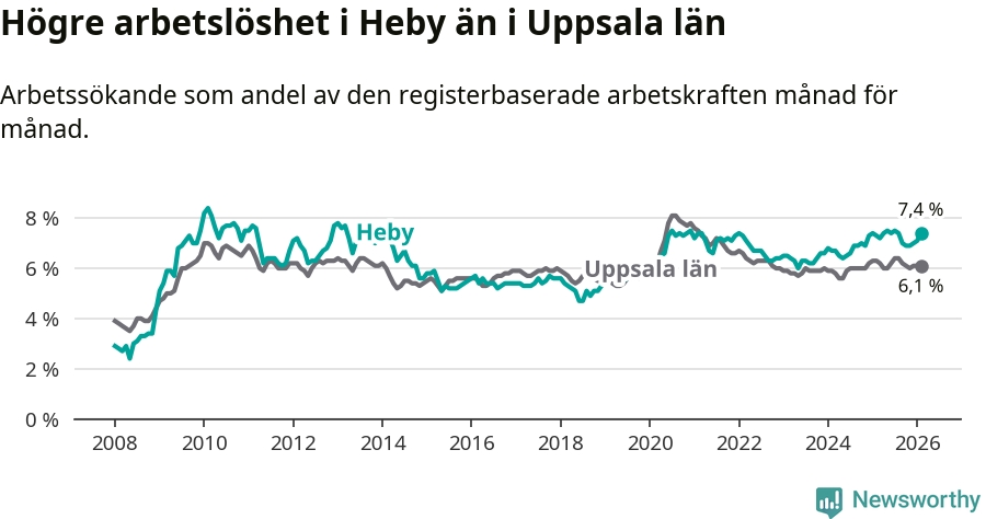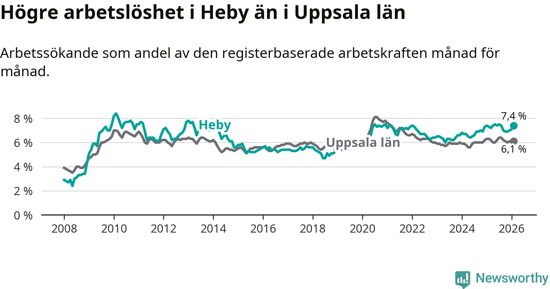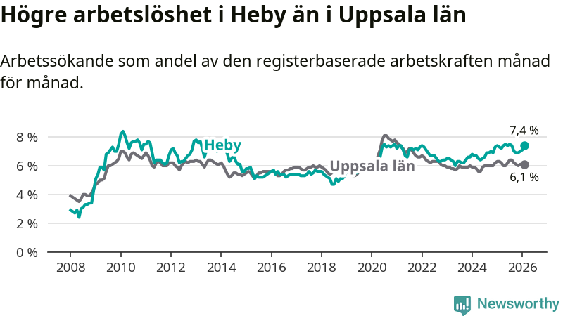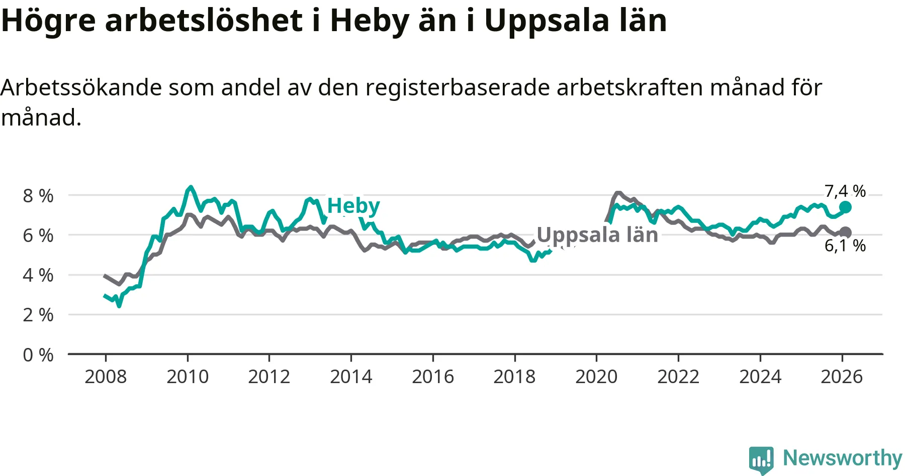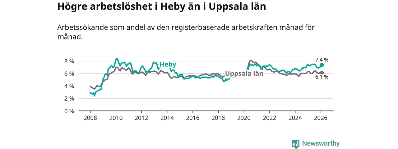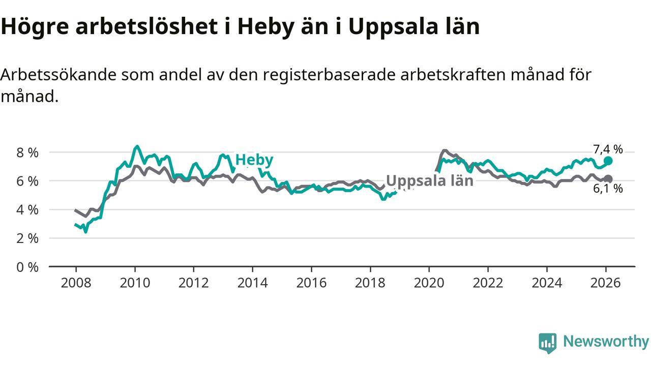 Under februari månad rapporterade Heby kommun en total arbetslöshet på 7,4 procent. Det är en ökning jämfört med samma tidpunkt i fjol (+0,1 procentenheter). I Uppsala län däremot sjunker arbetslösheten .