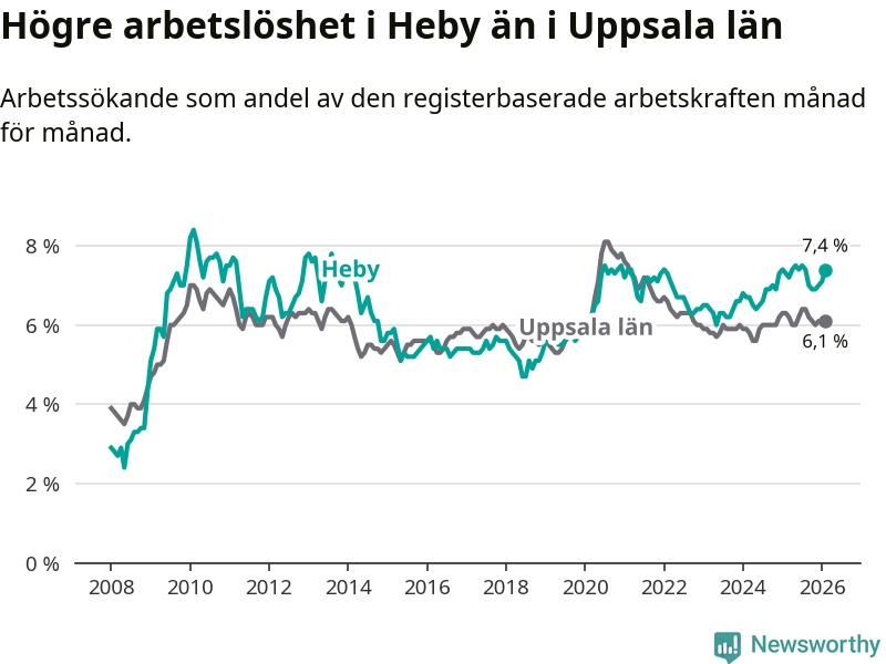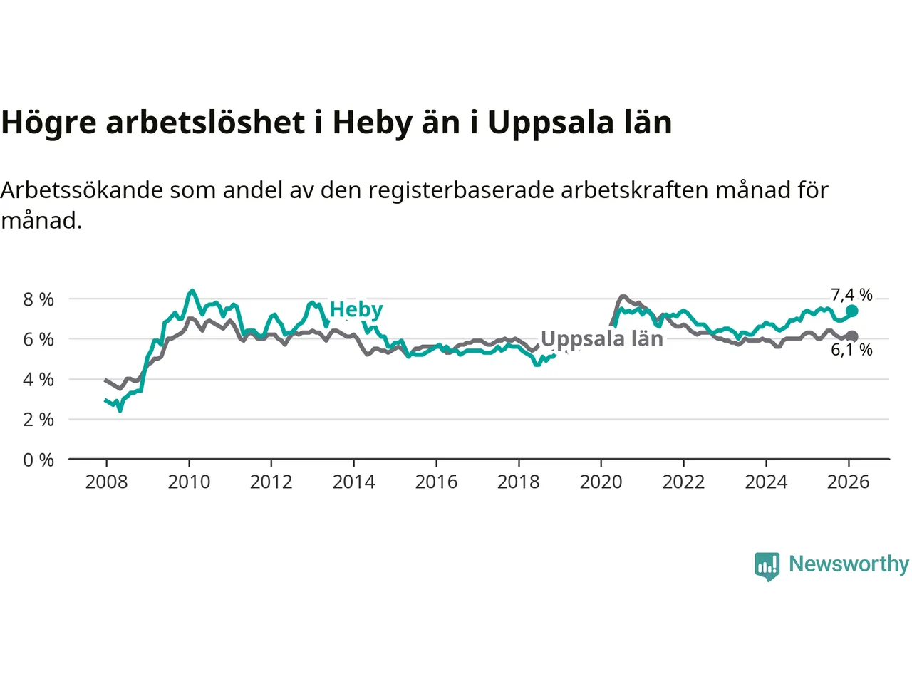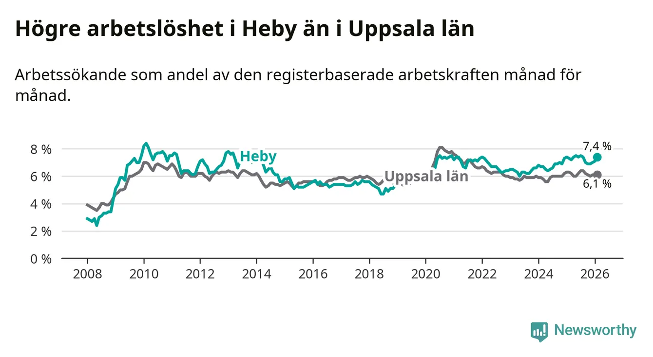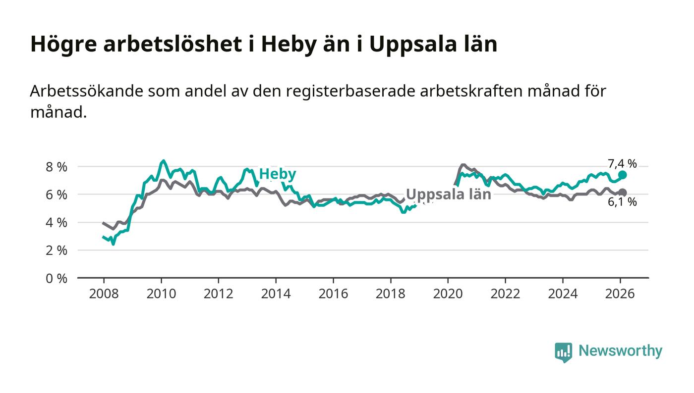 Heby hade redan tidigare högre arbetslöshet än snittet i hela Uppsala län och nu växer klyftan (7,4 procent i kommunen, jämfört med 6,1 procent i hela länet). Östhammar har den lägsta arbetslösheten i länet (4,3 procent), medan Älvkarleby har den högsta (7,9 procent). För att Heby skulle komma ner i samma arbetslöshetsnivå som Östhammar skulle 205 personer behöva sysselsättas.