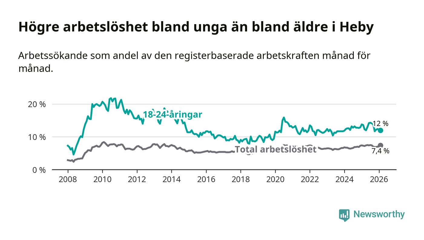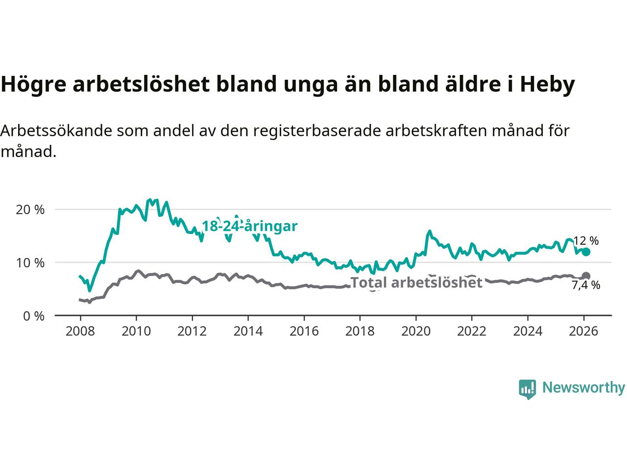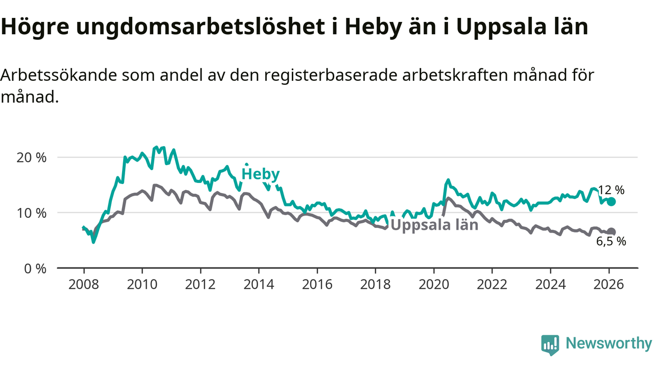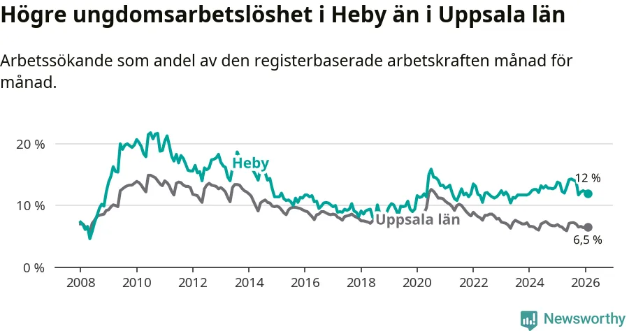 Precis som den totala arbetslösheten ligger ungdomsarbetslösheten i Heby högre än i Uppsala som helhet. Skillnaden mellan kommunen och länet är 5,5 procentenheter.