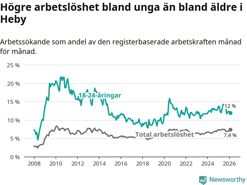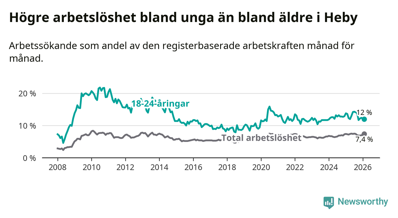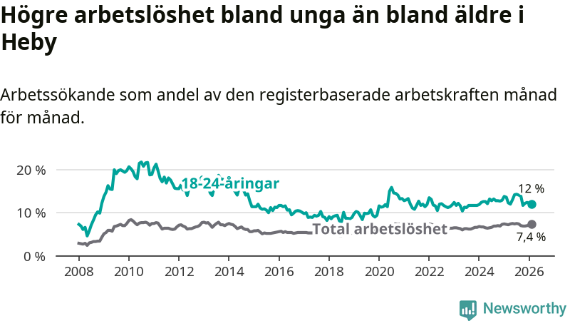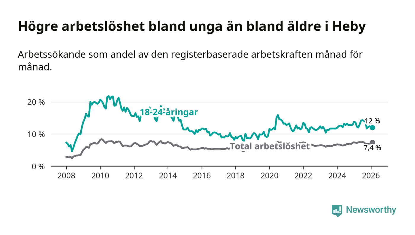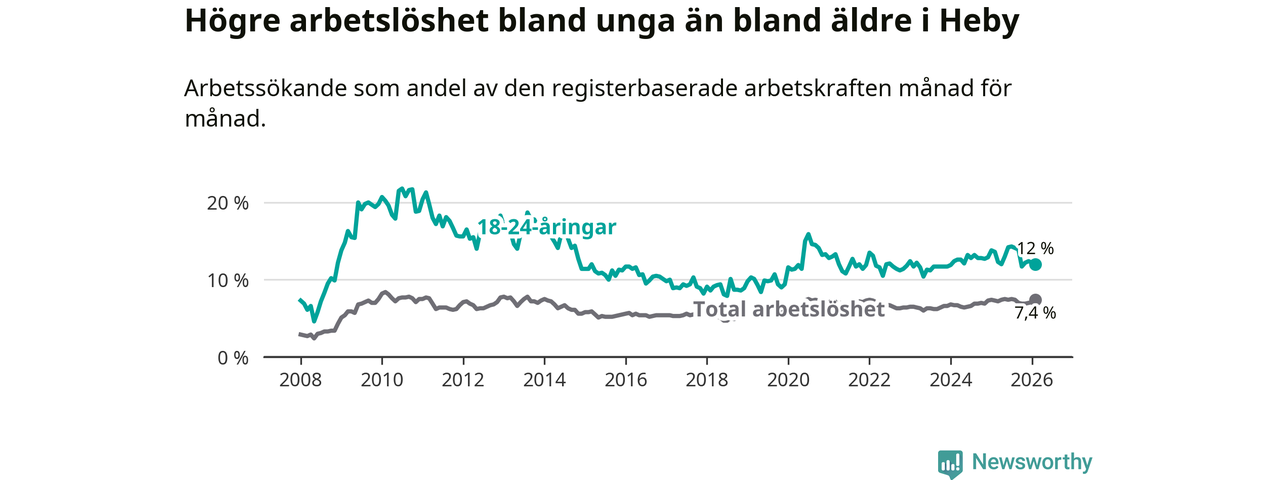 Precis som den totala arbetslösheten ligger ungdomsarbetslösheten i Heby högre än i Uppsala som helhet. Skillnaden mellan kommunen och länet är 5,5 procentenheter.