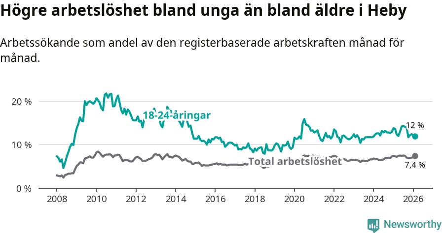 Till skillnad från den totala arbetslösheten sjunker arbetslösheten bland unga (−1,6 procentenheter). I februari var 12,0 procent av 18–24-åringarna inskrivna som arbetssökande (motsvarande 74 personer). Mäter vi antalet inskrivna ser vi en minskning med tolv personer på ett års sikt.