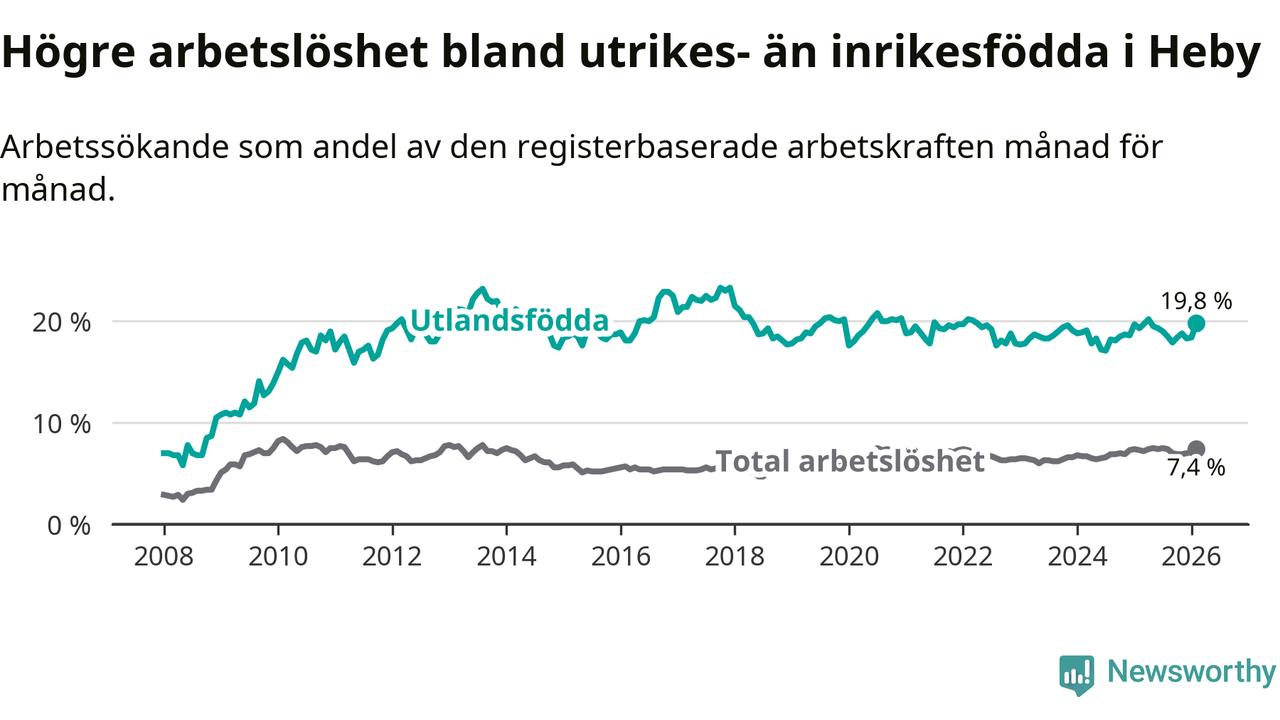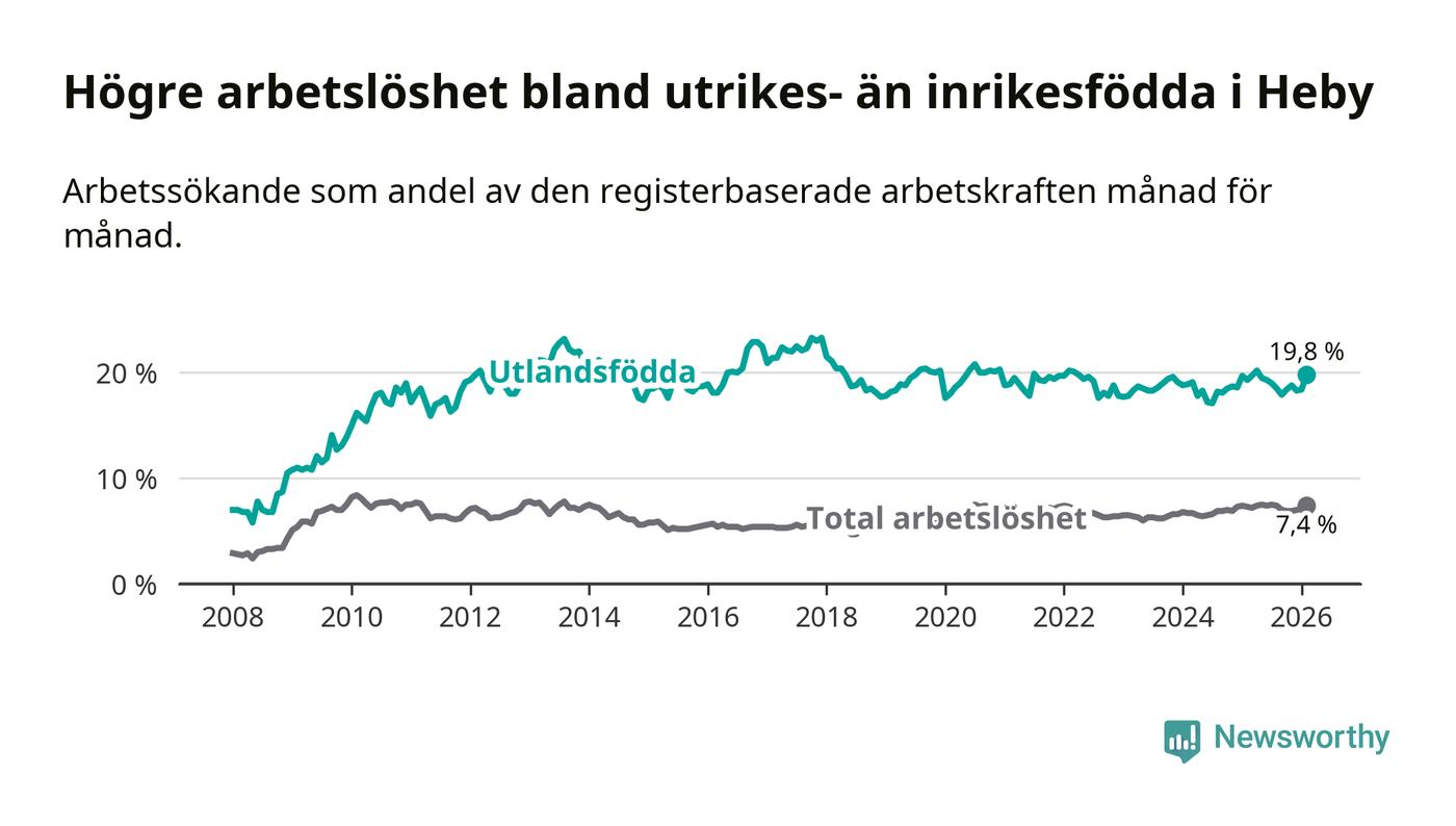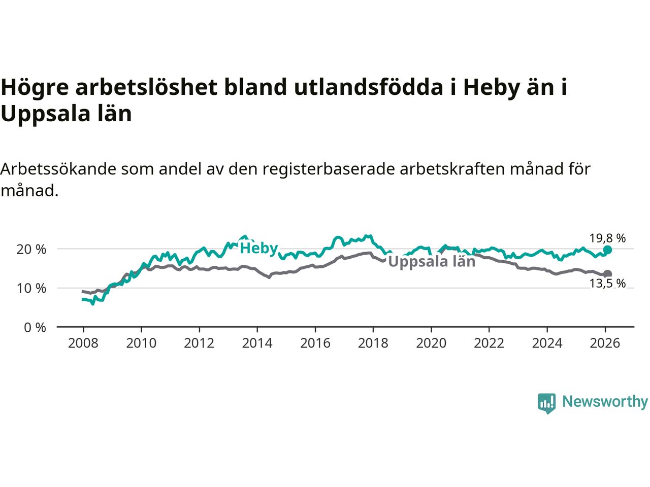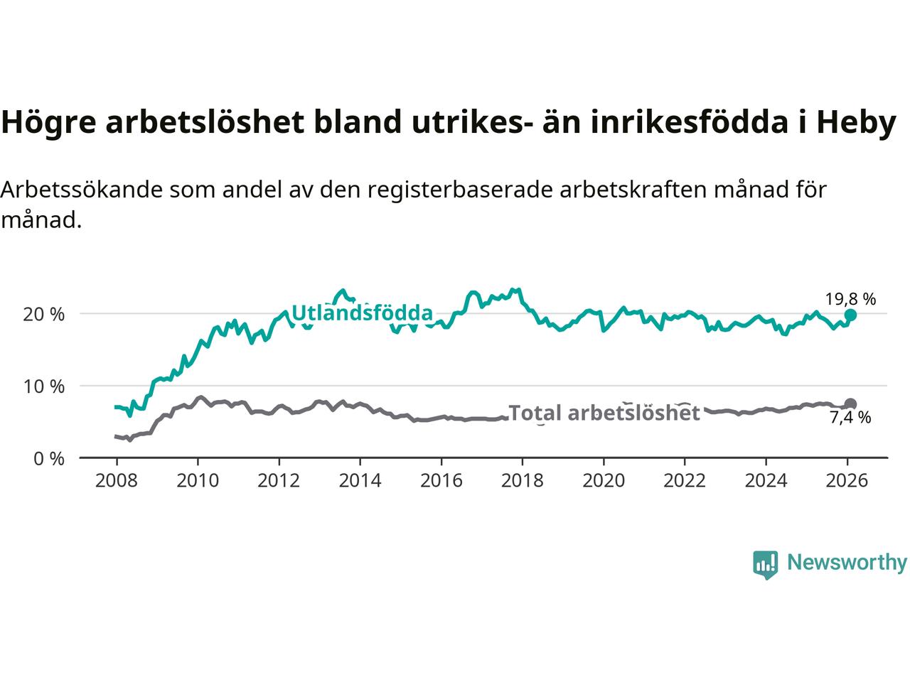 Arbetslösheten bland utlandsfödda var 19,8 procent i Heby under februari månad, motsvarande 209 av 1 056 personer. Det är 0,5 procentenheter fler än vid samma tidpunkt i fjol (+3 om man räknar personer). Den senaste månadens uppgång innebär ett trendbrott. Under de två föregående månaderna hade arbetslösheten bland utlandsfödda varit lägre än motsvarande tidpunkt året innan.