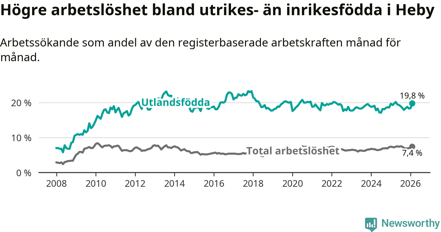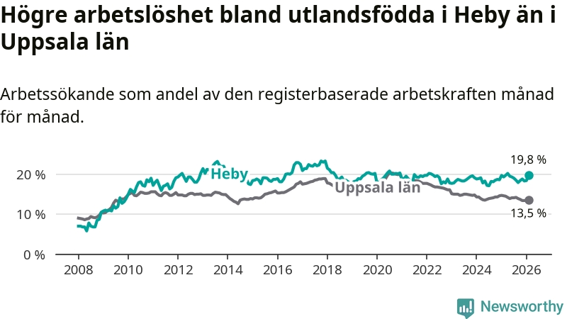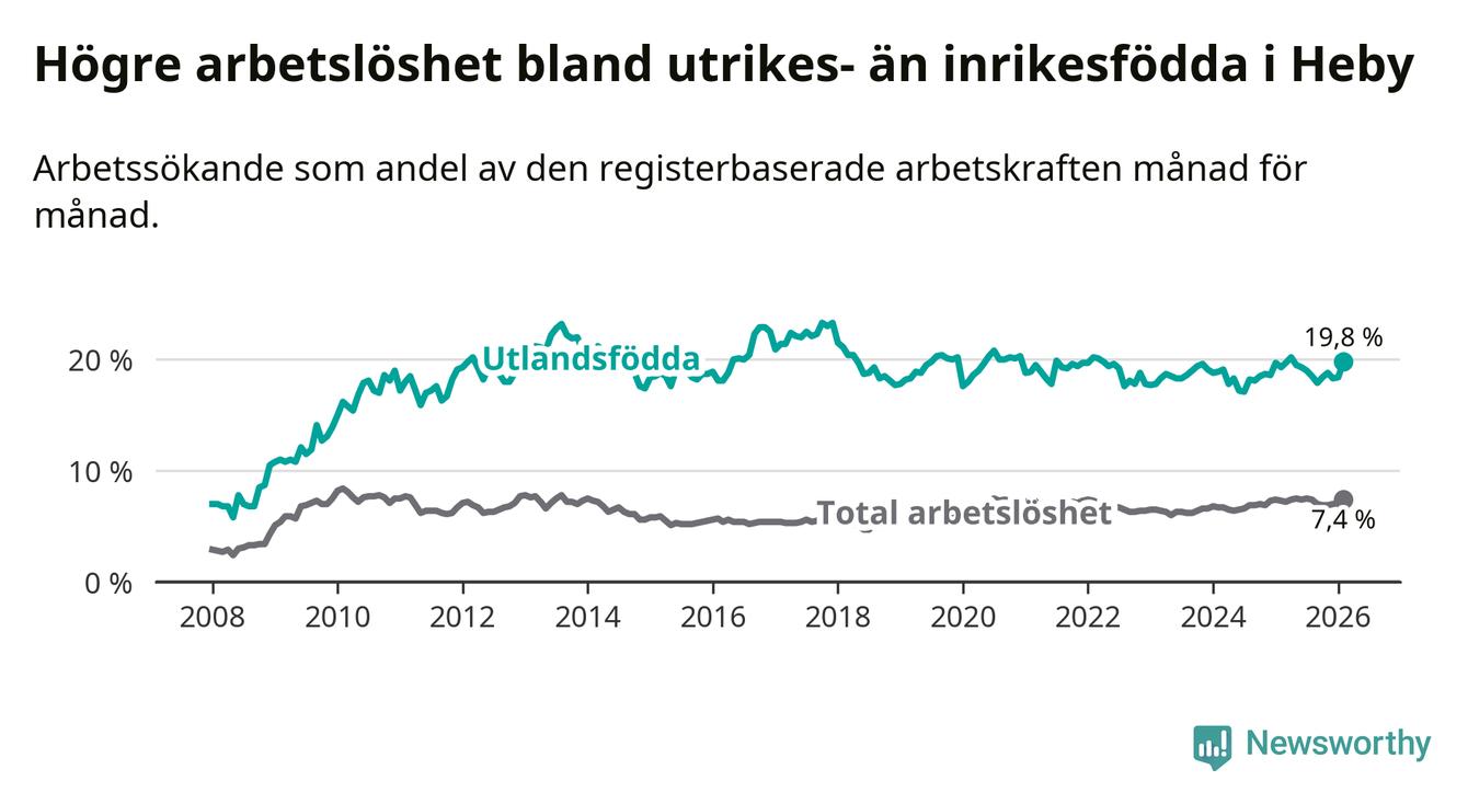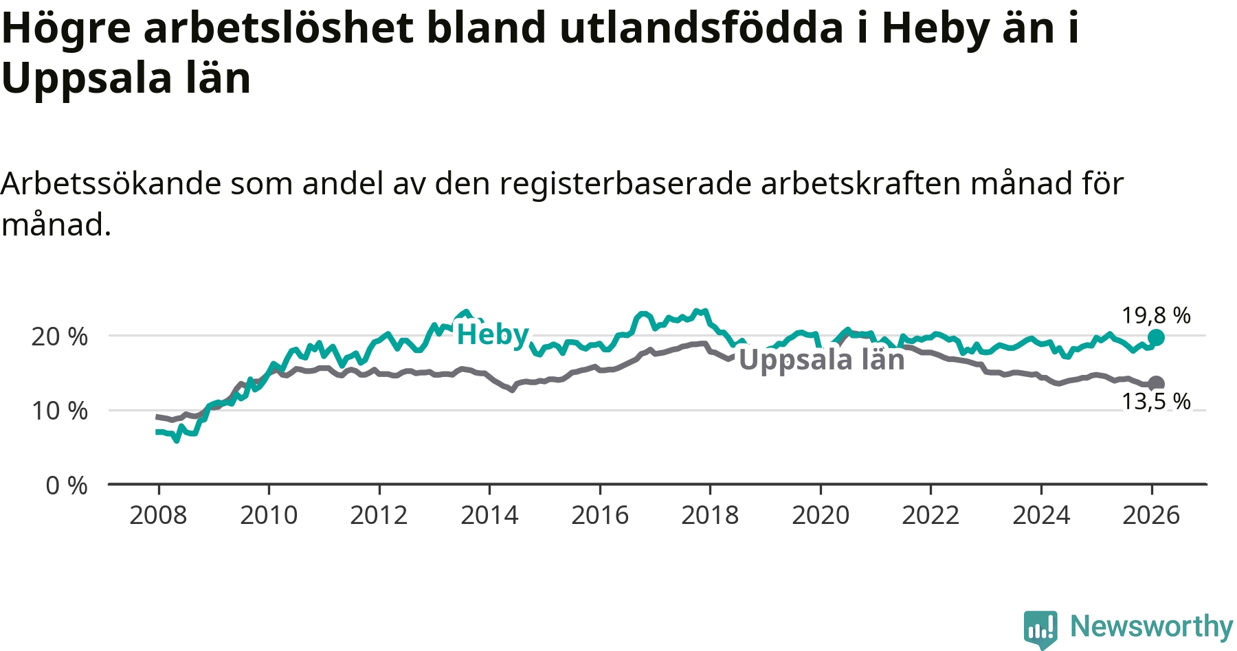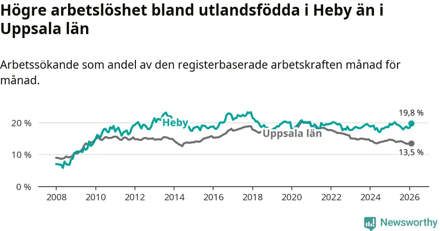 Arbetslösheten bland utlandsfödda var 19,8 procent i Heby under februari månad, motsvarande 209 av 1 056 personer. Det är 0,5 procentenheter fler än vid samma tidpunkt i fjol (+3 om man räknar personer). Den senaste månadens uppgång innebär ett trendbrott. Under de två föregående månaderna hade arbetslösheten bland utlandsfödda varit lägre än motsvarande tidpunkt året innan.