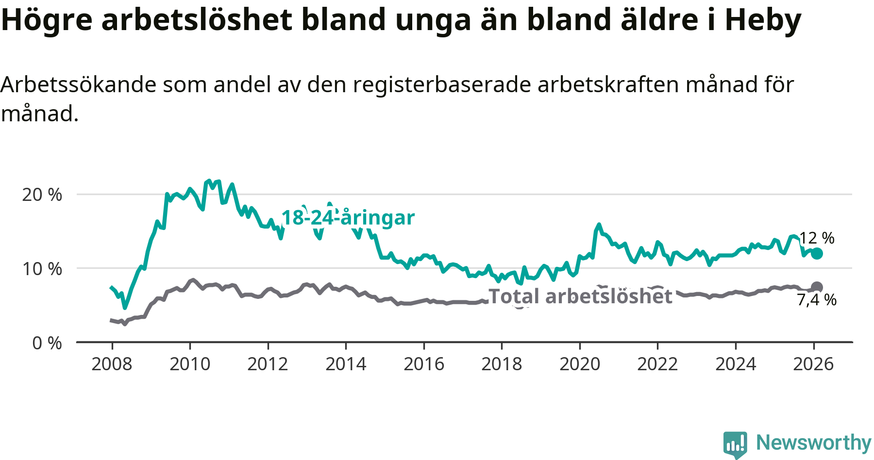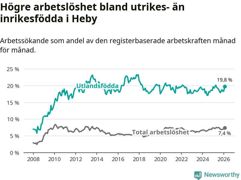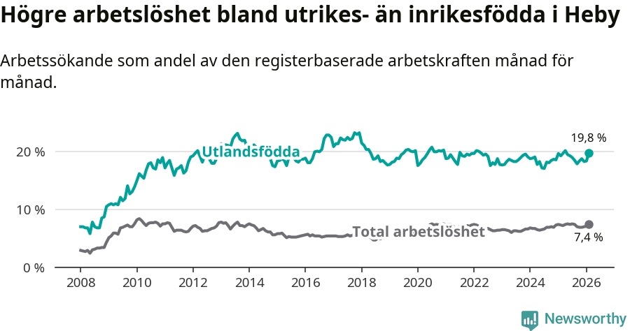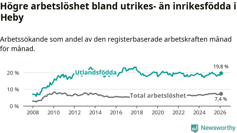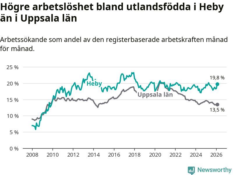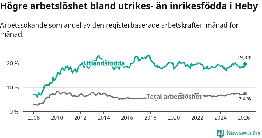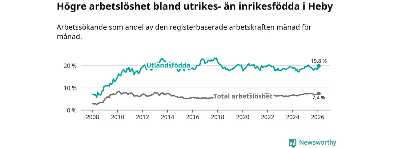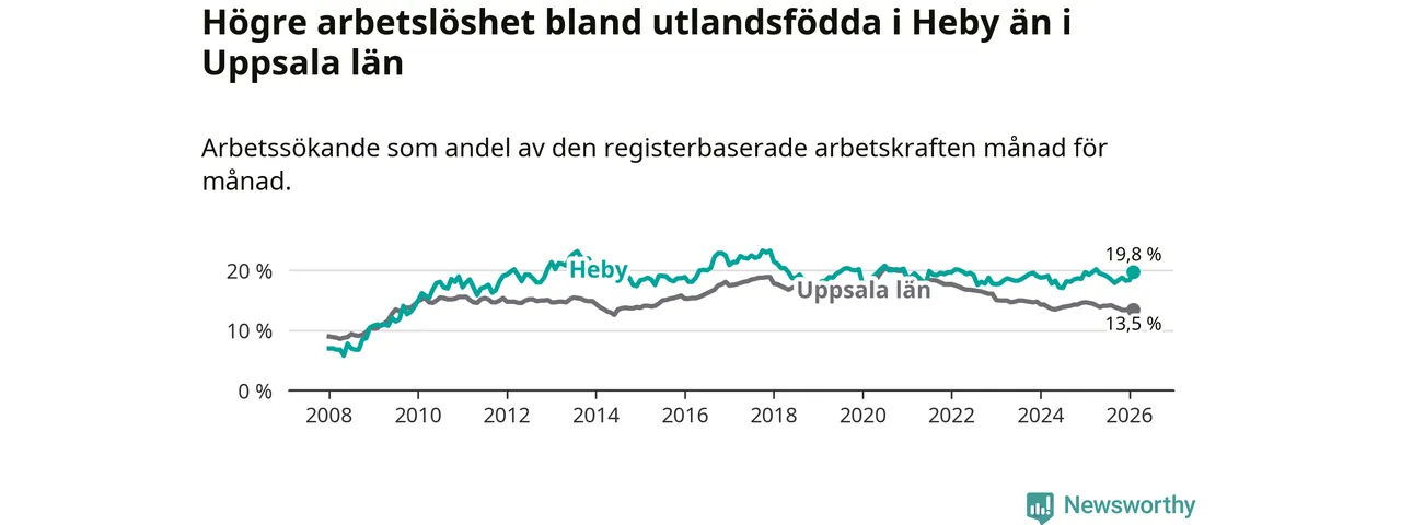 Arbetslösheten bland utlandsfödda var 19,8 procent i Heby under februari månad, motsvarande 209 av 1 056 personer. Det är 0,5 procentenheter fler än vid samma tidpunkt i fjol (+3 om man räknar personer). Den senaste månadens uppgång innebär ett trendbrott. Under de två föregående månaderna hade arbetslösheten bland utlandsfödda varit lägre än motsvarande tidpunkt året innan.