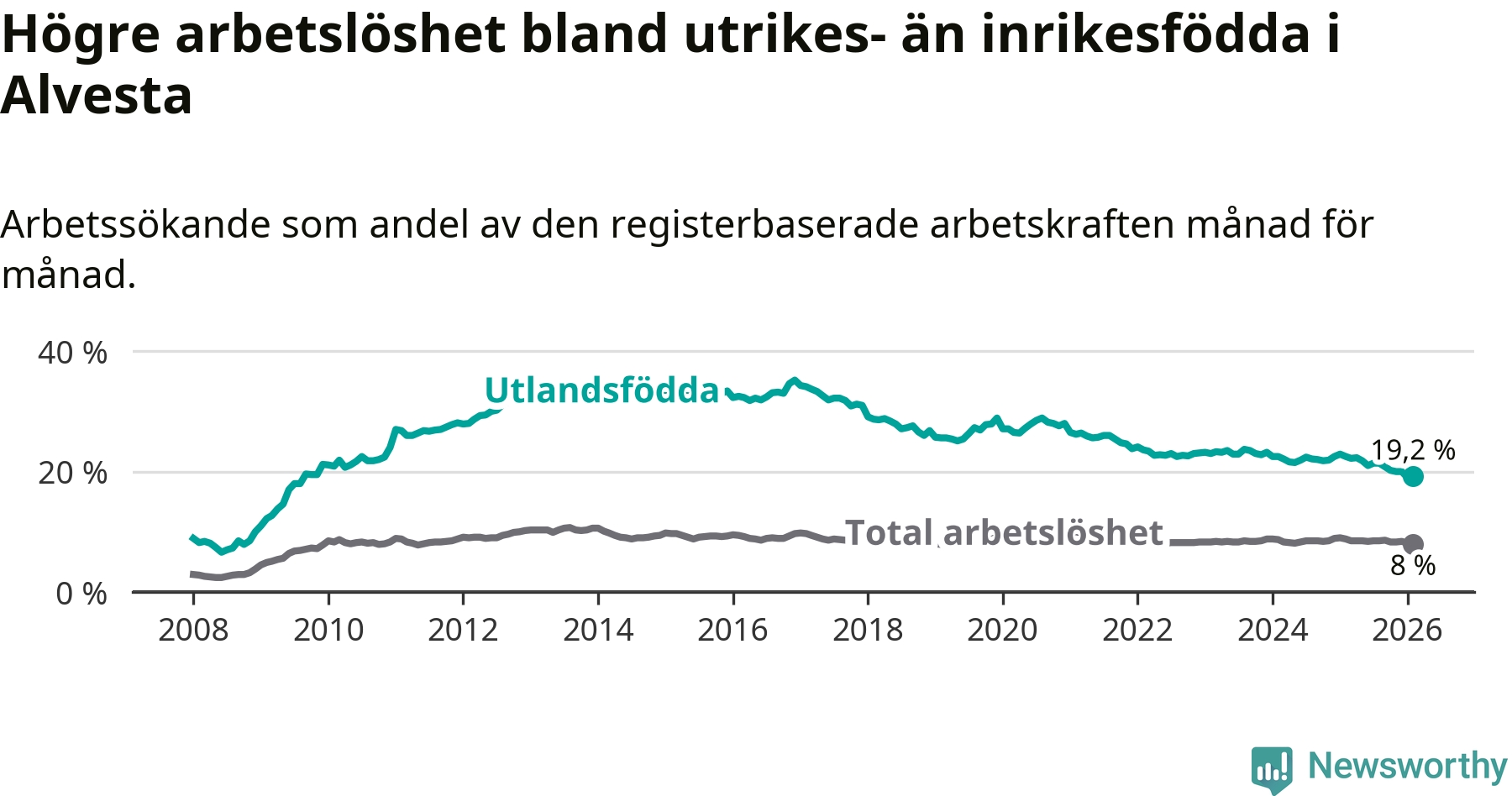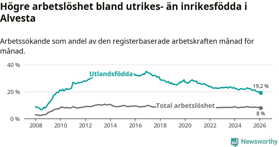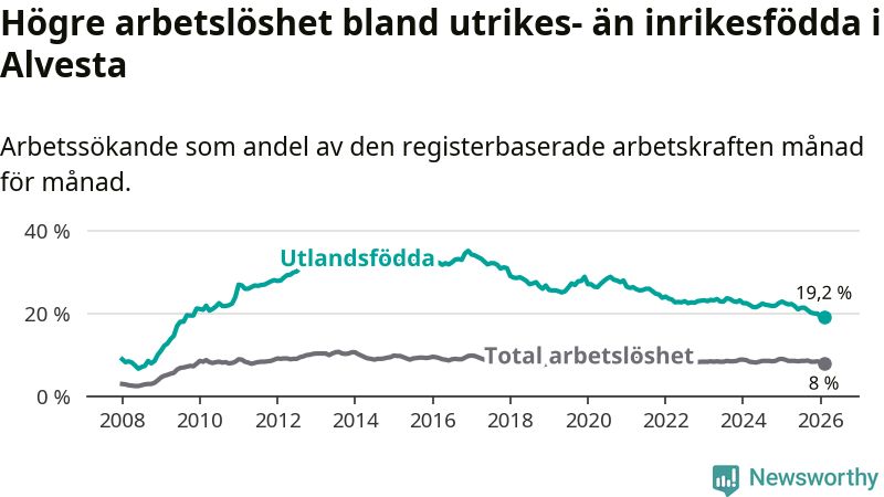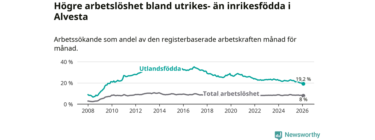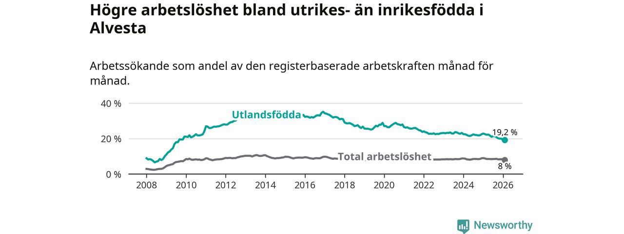 Arbetslösheten bland utlandsfödda var 19,2 procent i Alvesta under februari månad, motsvarande 467 av 2 432 personer. Det är 3,3 procentenheter färre än vid samma tidpunkt i fjol (−79 om man räknar personer). Därmed är de utlandsföddas arbetslöshet lägre än vid samma tidpunkt i fjol för nionde månaden i följd. Sedan maj 2025 har arbetslösheten bland utlandsfödda minskat från 21,8 till 19,2 procent.
