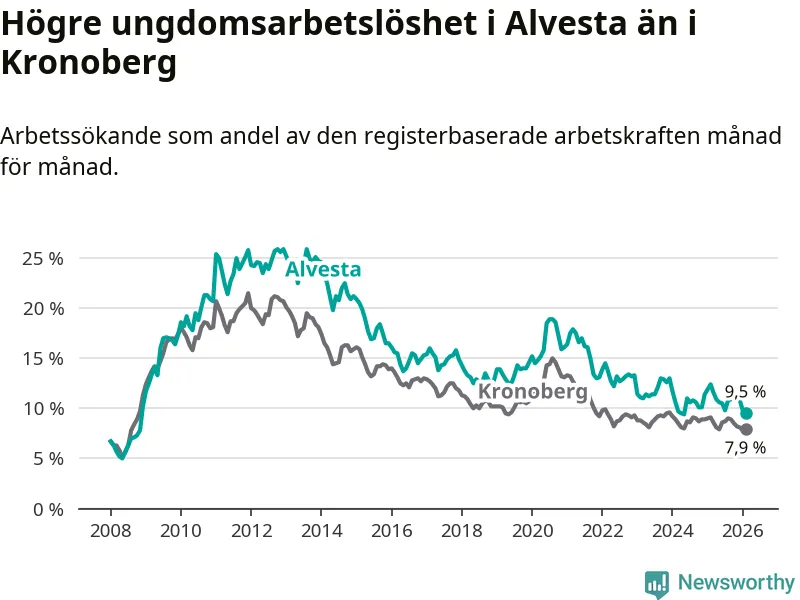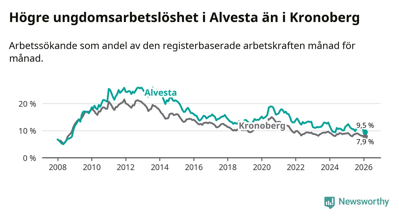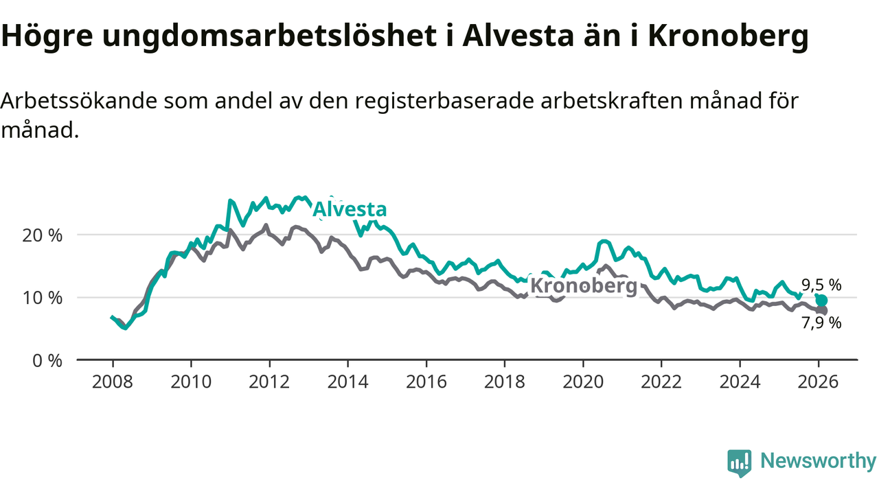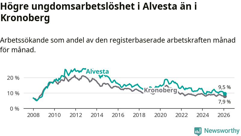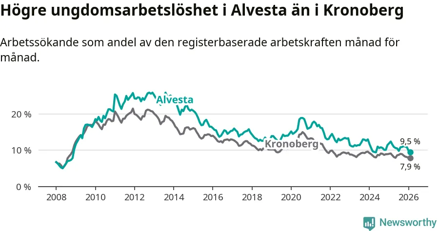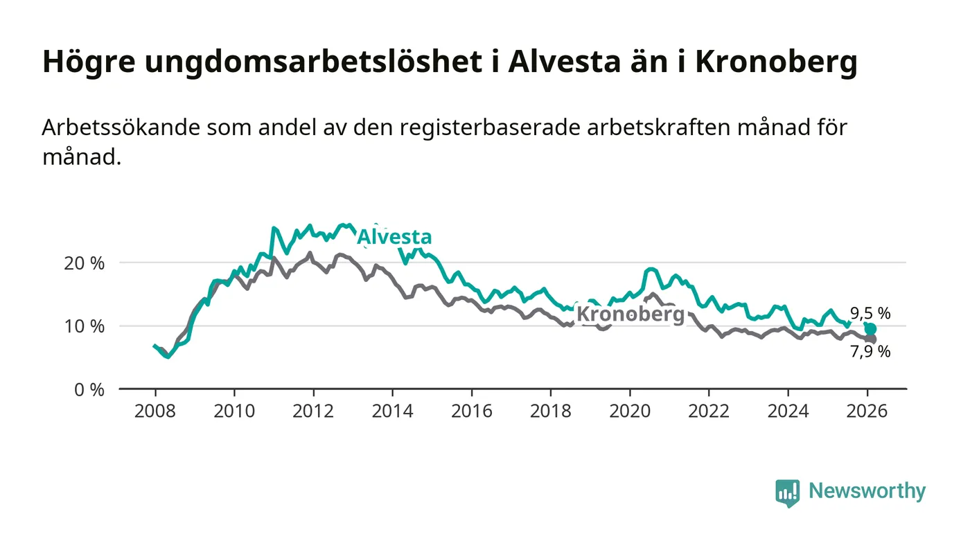 Precis som den totala arbetslösheten ligger ungdomsarbetslösheten i Alvesta högre än i Kronoberg som helhet. Skillnaden mellan kommunen och länet är 1,6 procentenheter.