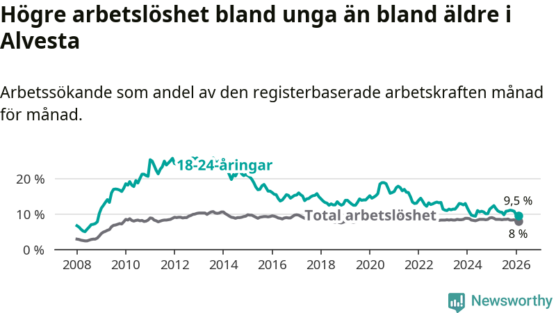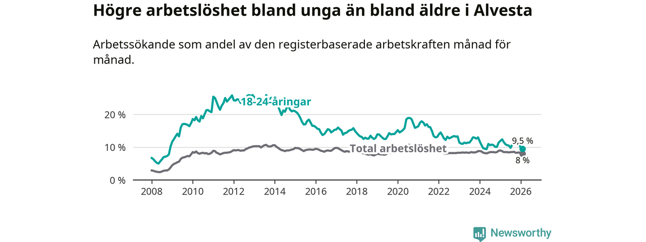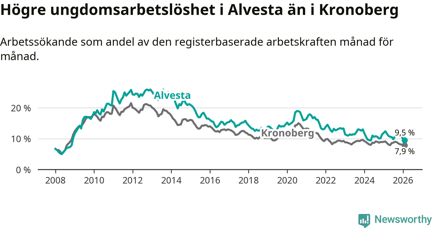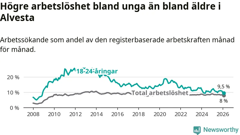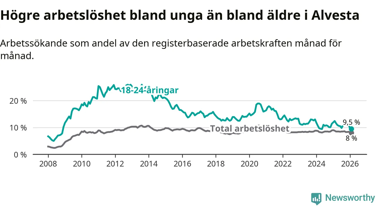 Precis som den totala arbetslösheten ligger ungdomsarbetslösheten i Alvesta högre än i Kronoberg som helhet. Skillnaden mellan kommunen och länet är 1,6 procentenheter.