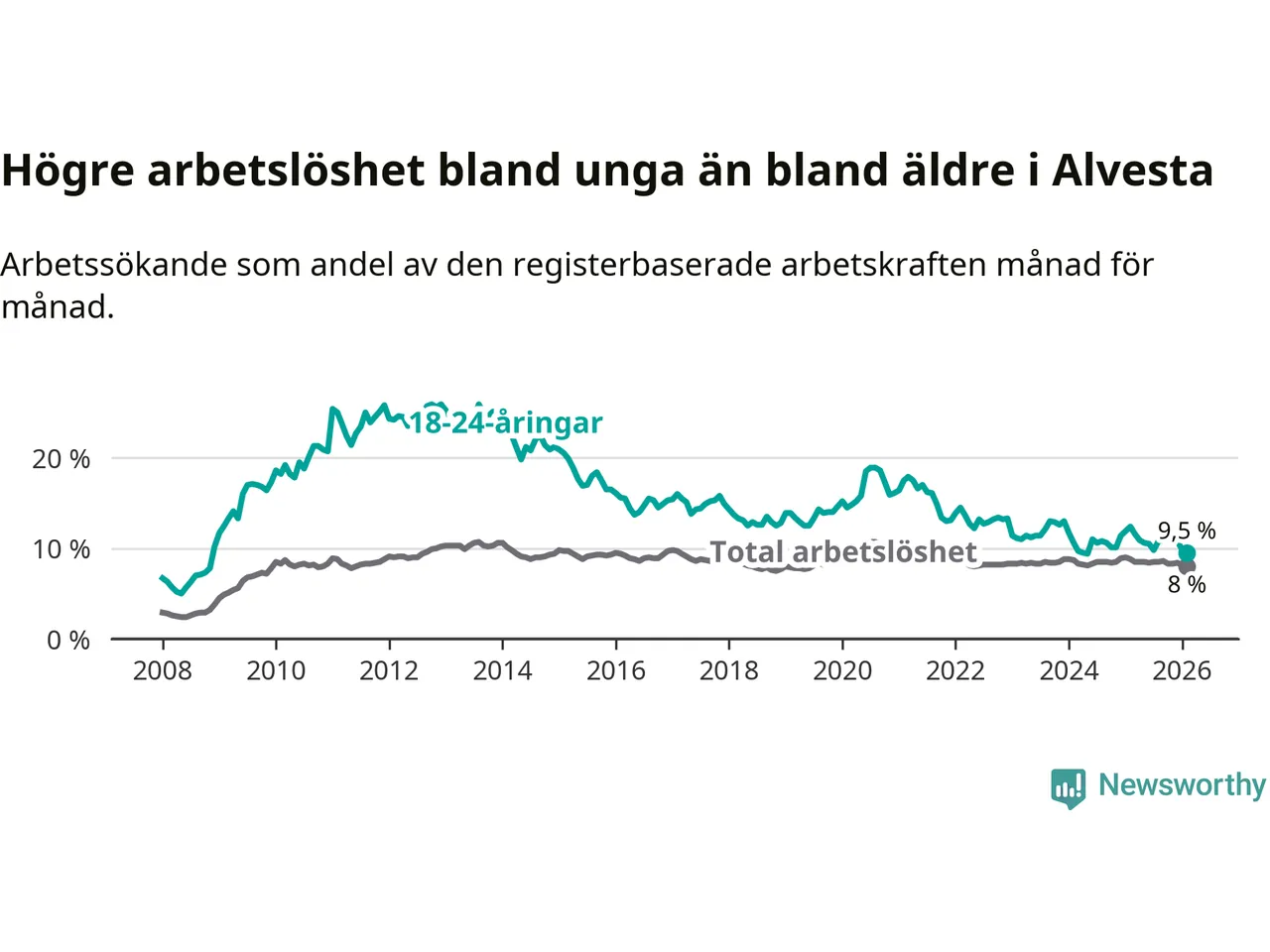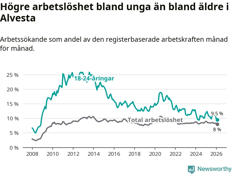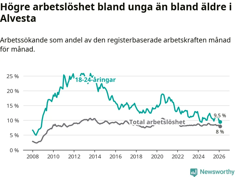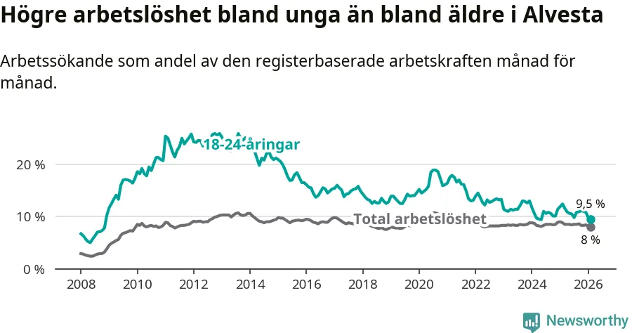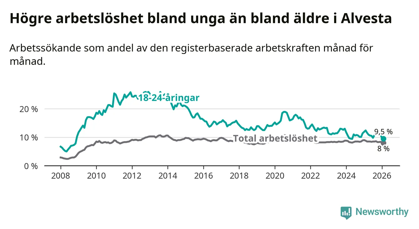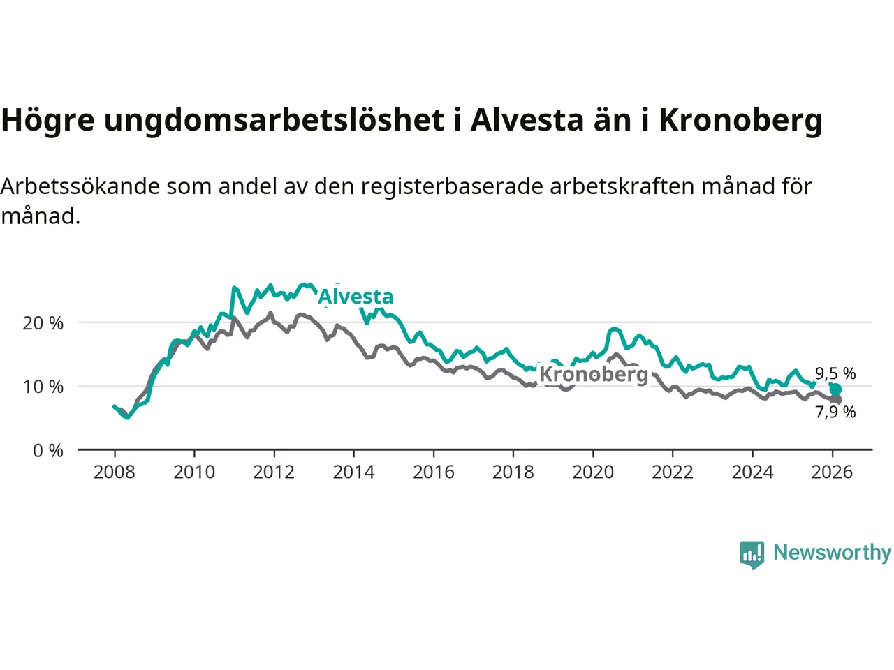 Precis som den totala arbetslösheten ligger ungdomsarbetslösheten i Alvesta högre än i Kronoberg som helhet. Skillnaden mellan kommunen och länet är 1,6 procentenheter.