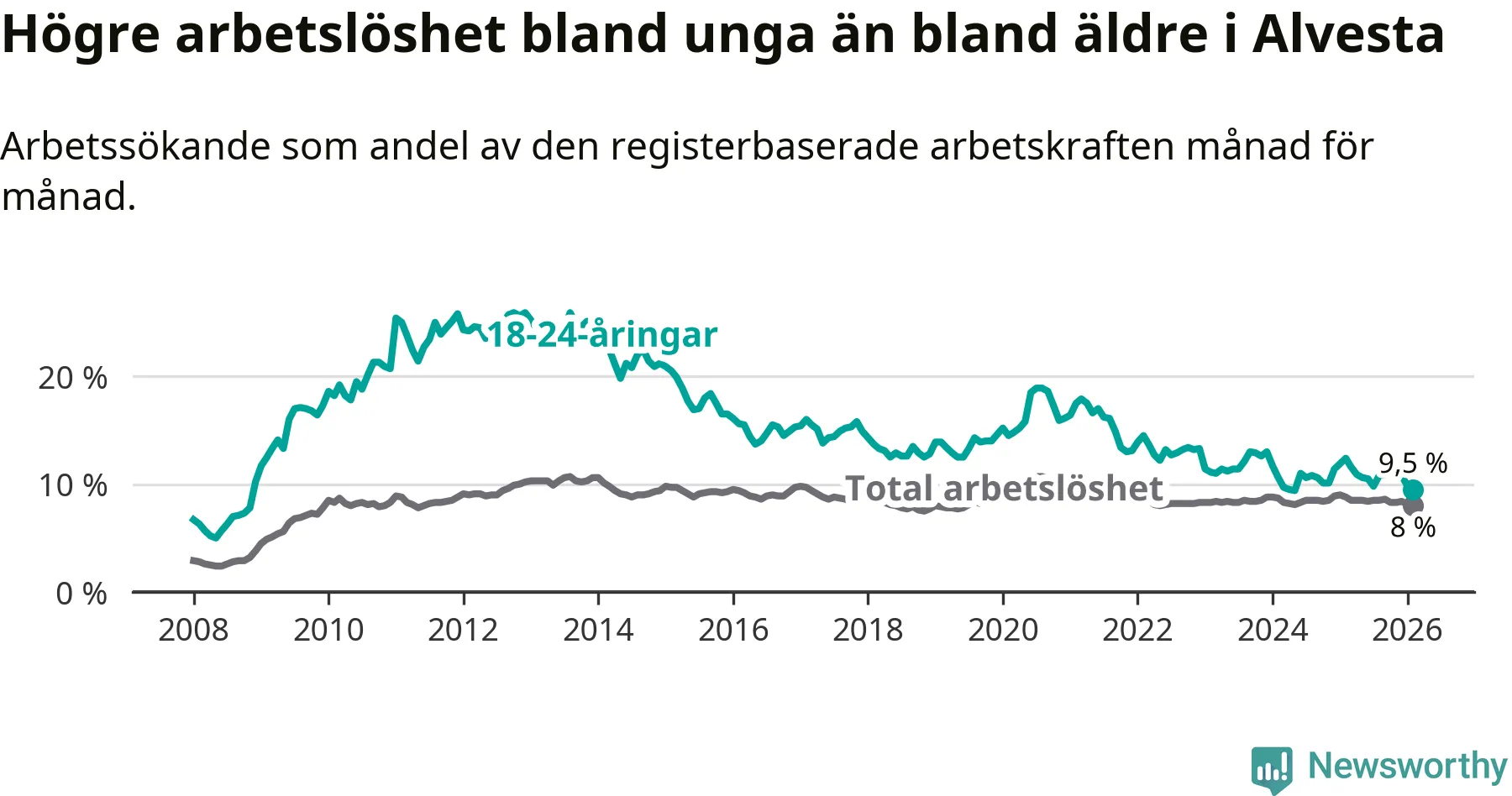 I februari var 9,5 procent av 18–24-åringarna inskrivna som arbetssökande (motsvarande 92 personer). Mäter vi antalet inskrivna ser vi en minskning med 32 personer på ett års sikt.