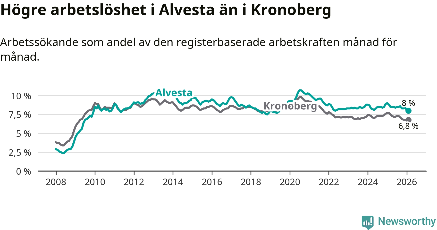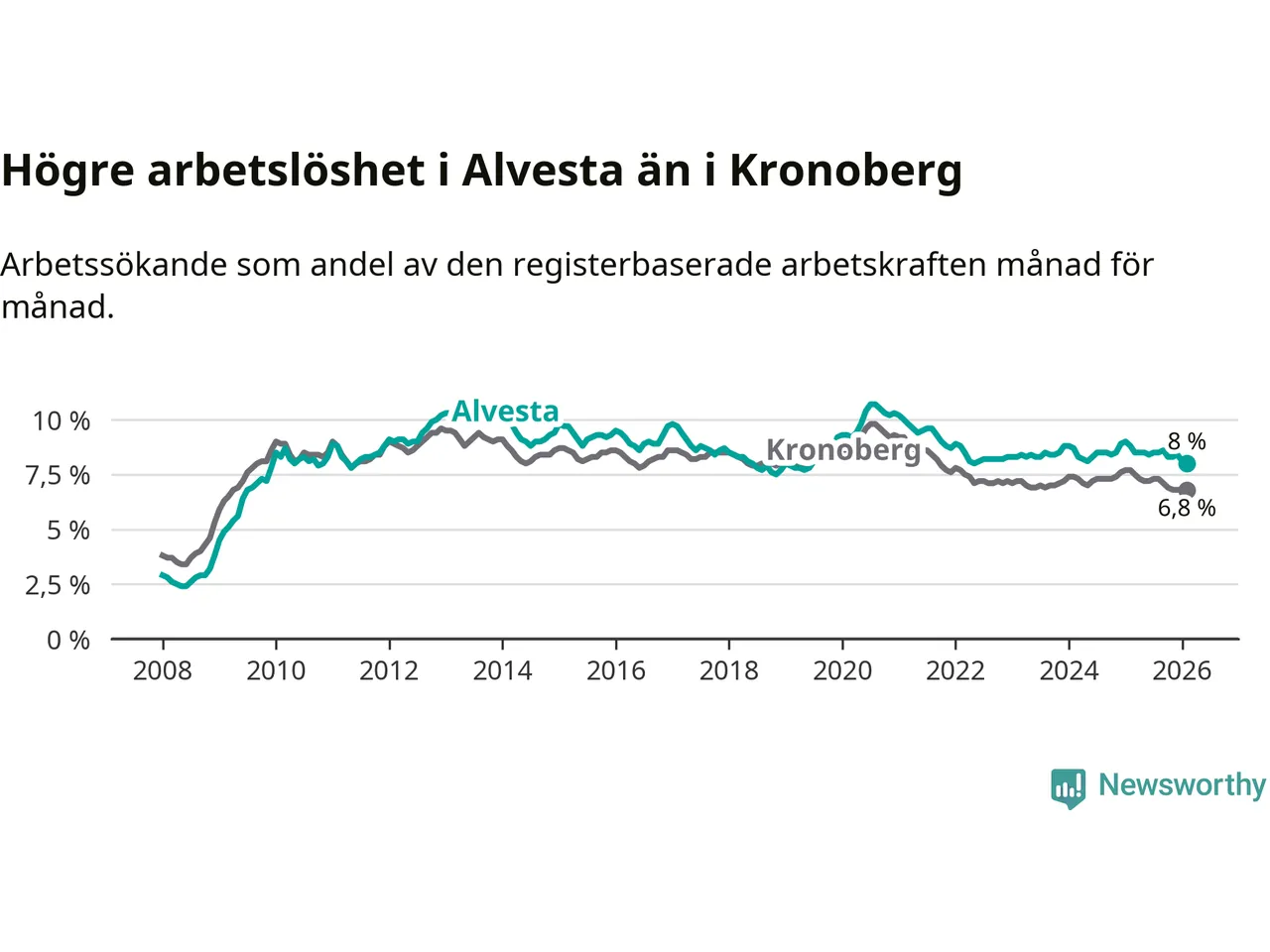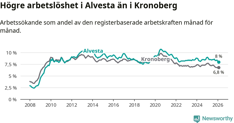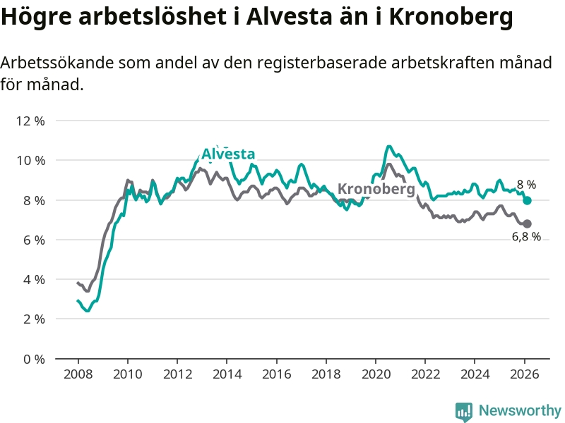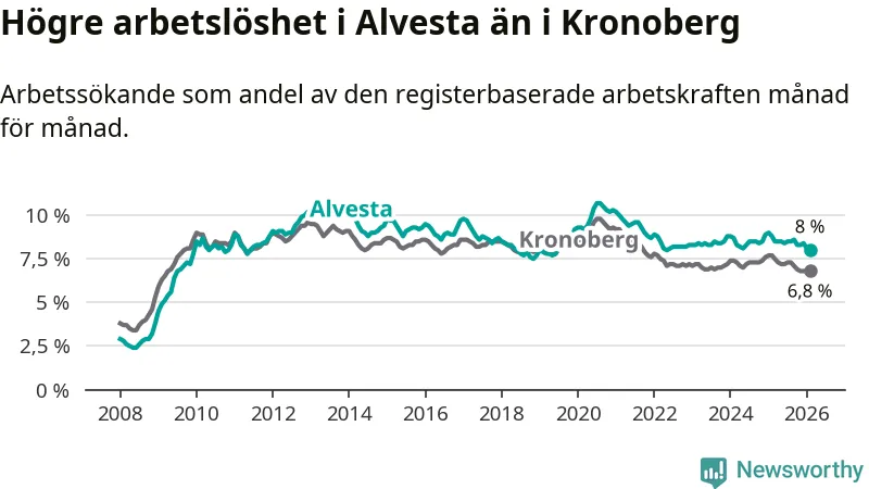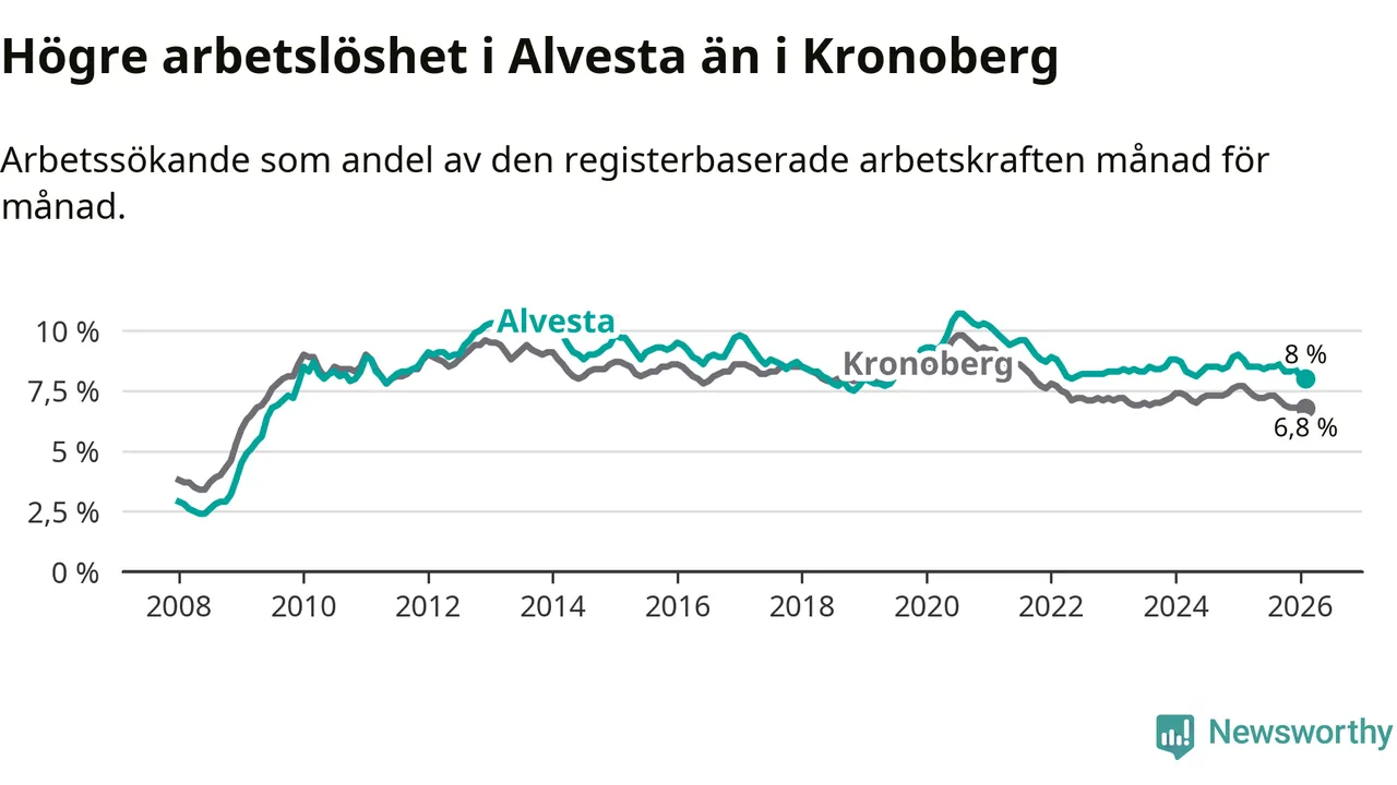 Under februari månad rapporterade Alvesta kommun en total arbetslöshet på 8,0 procent. Det är en minskning jämfört med samma tidpunkt i fjol (−0,8 procentenheter). Även i Kronobergs län sjunker arbetslösheten .