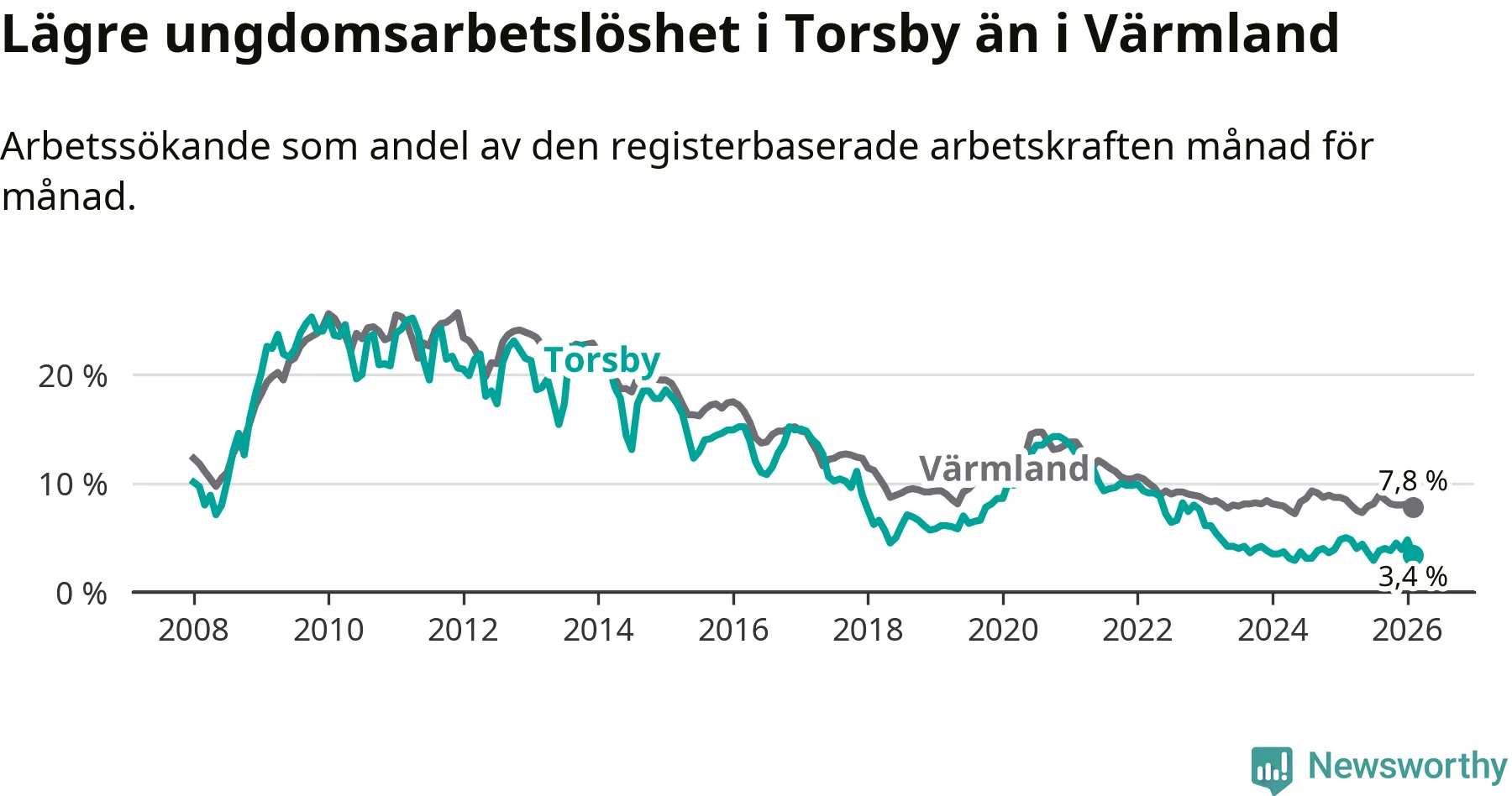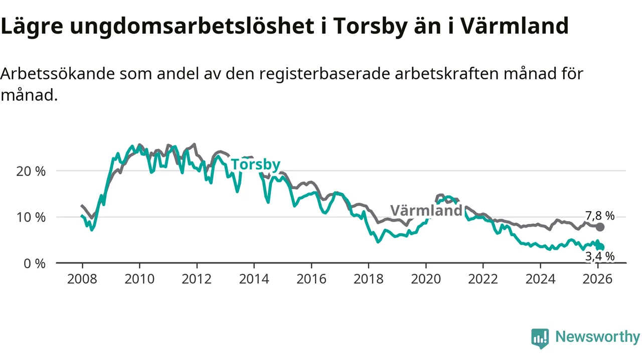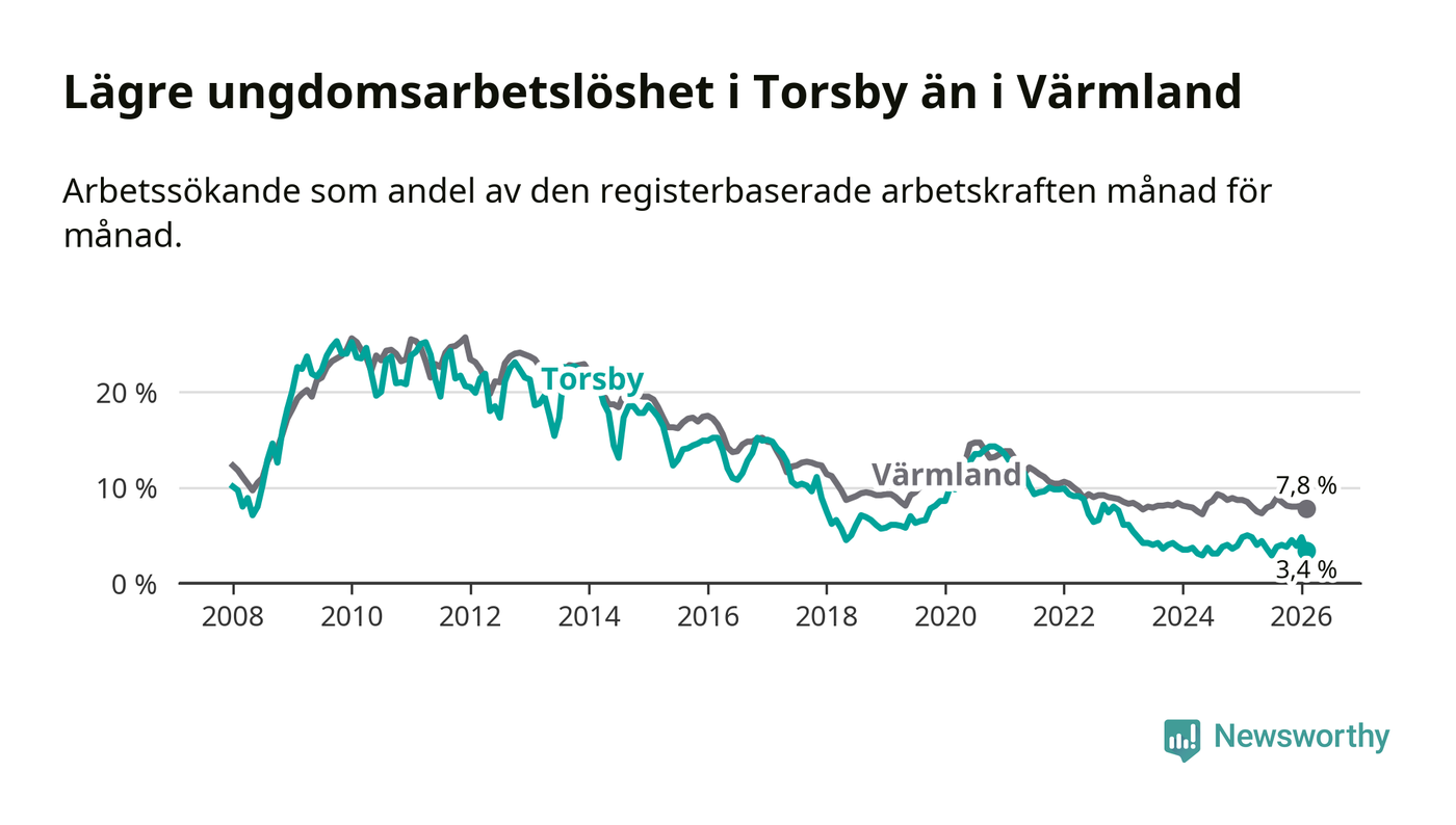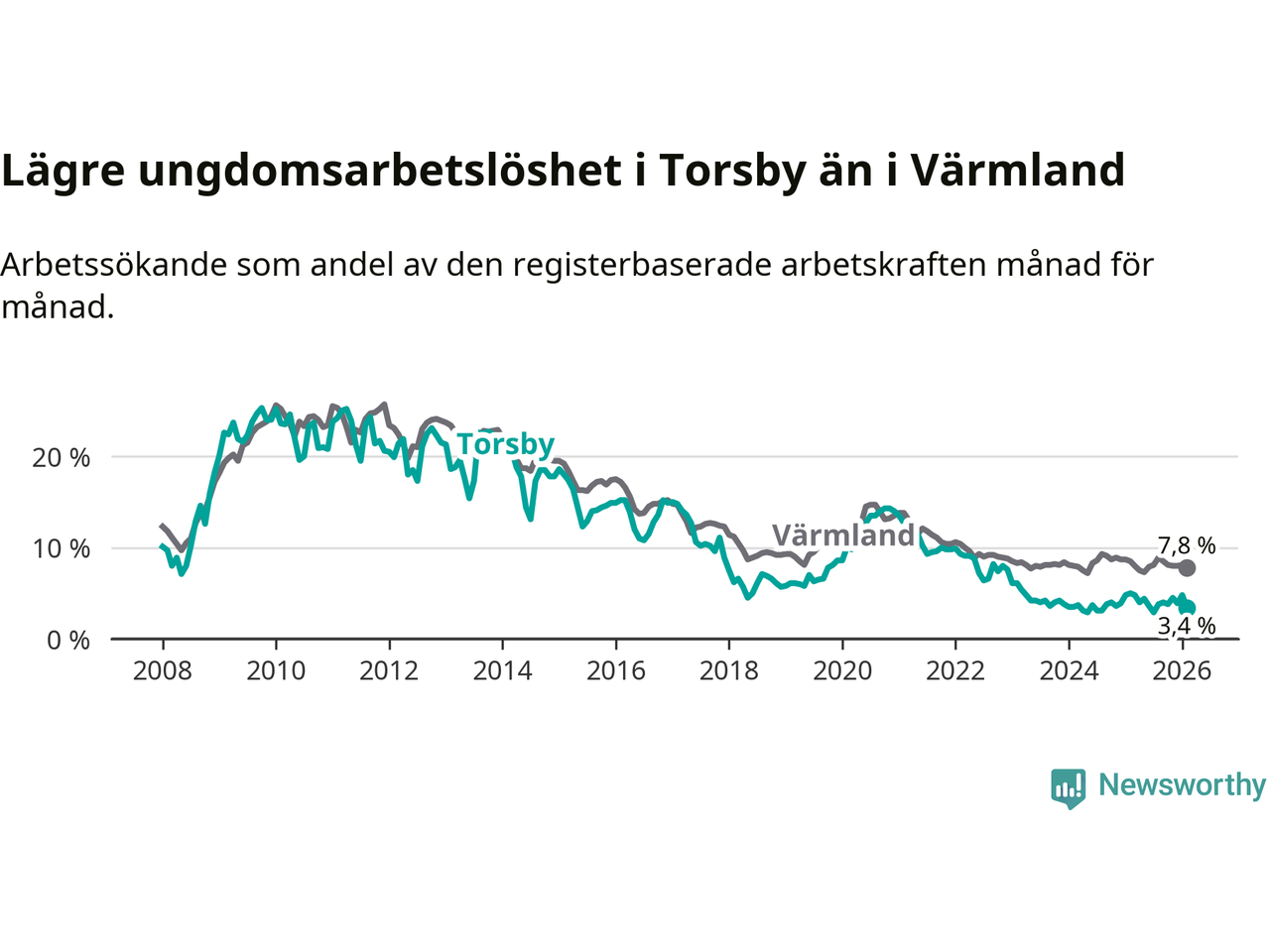 Graf: Arbetslöshet bland unga i Torsby kommun och Värmlands län