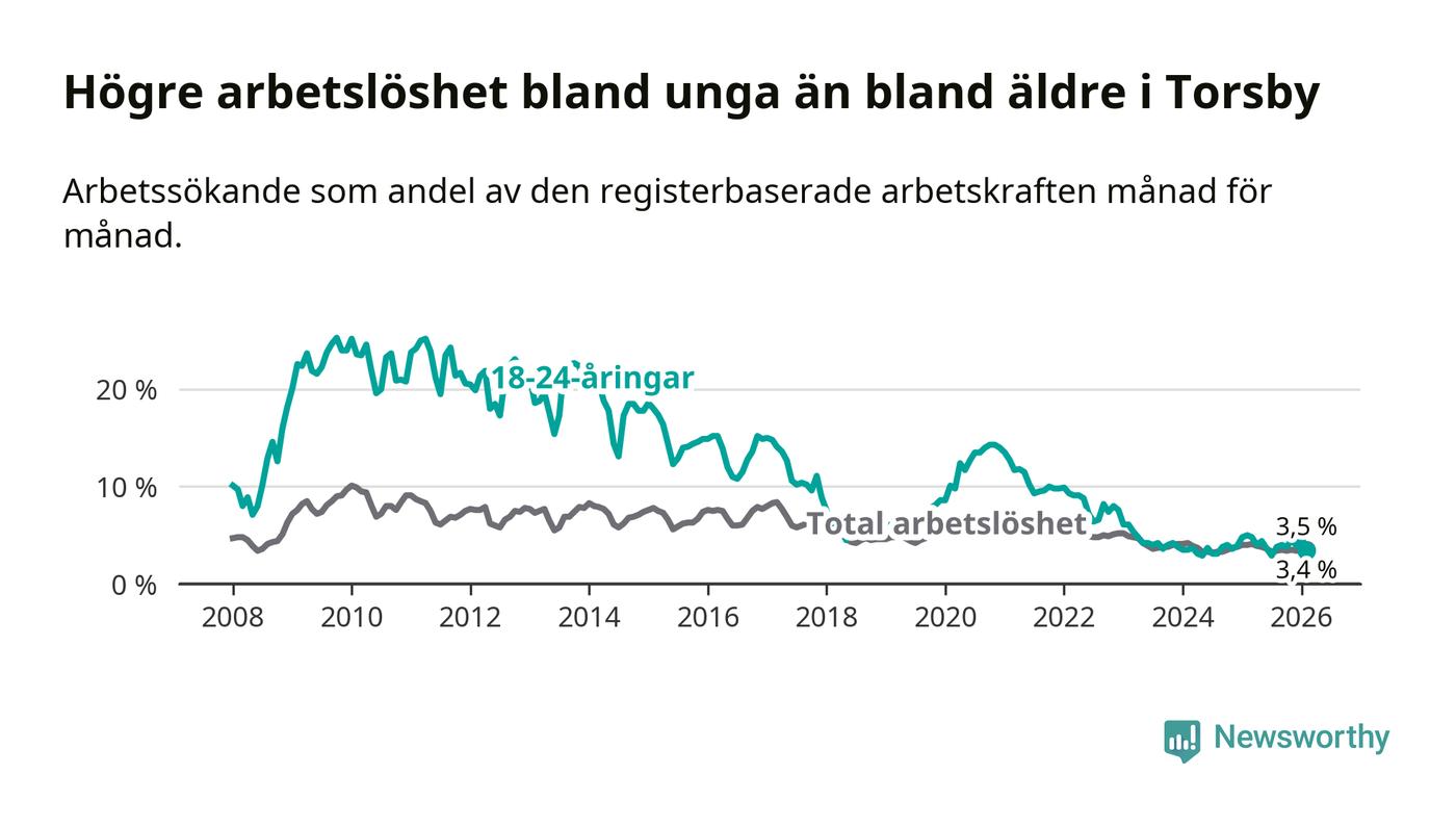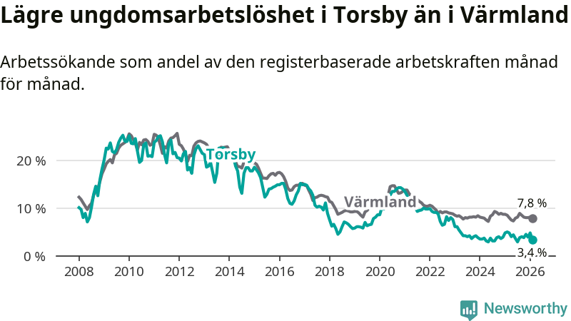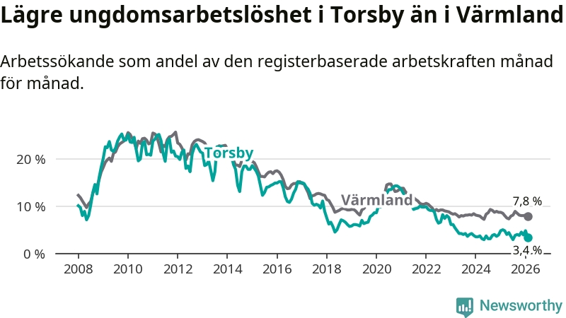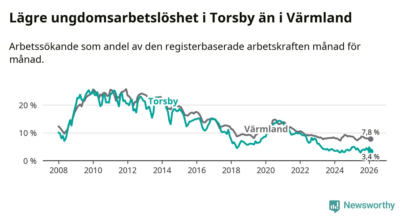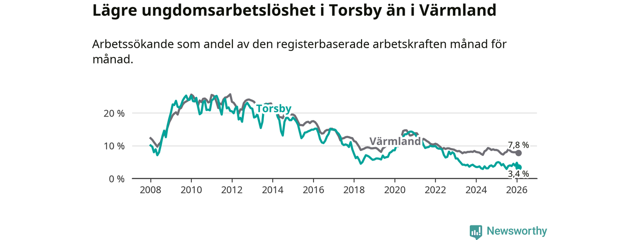 Graf: Arbetslöshet bland unga i Torsby kommun och Värmlands län