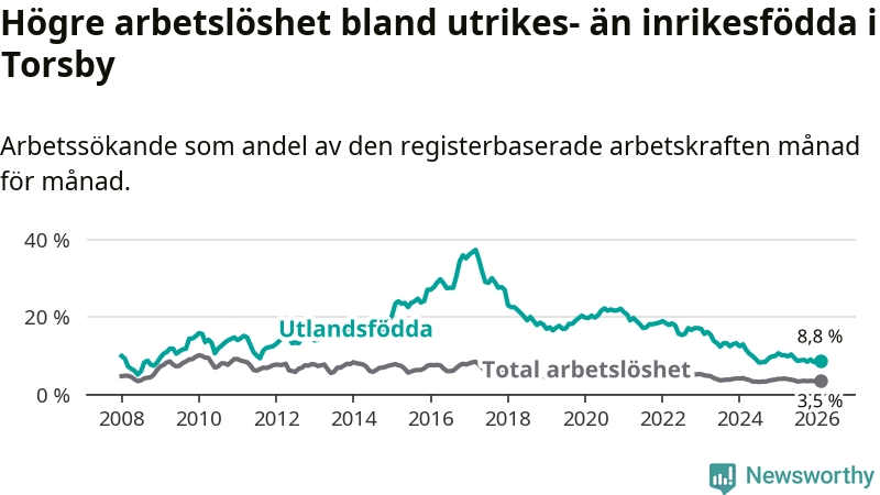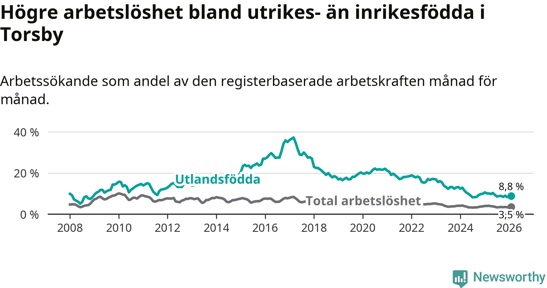 Arbetslösheten bland utlandsfödda var 8,8 procent i Torsby under februari månad, motsvarande 66 av 750 personer. Det är 1,3 procentenheter färre än vid samma tidpunkt i fjol (−7 om man räknar personer).