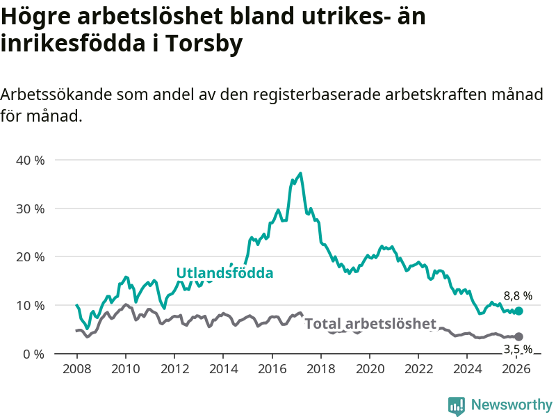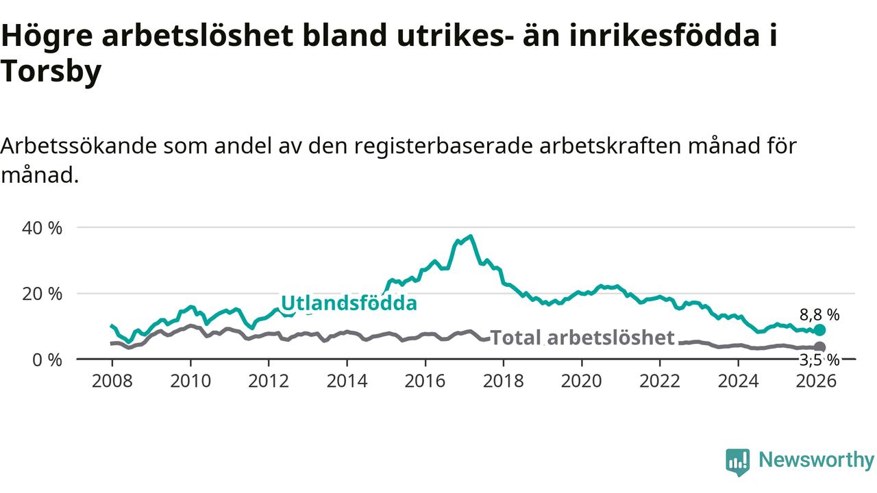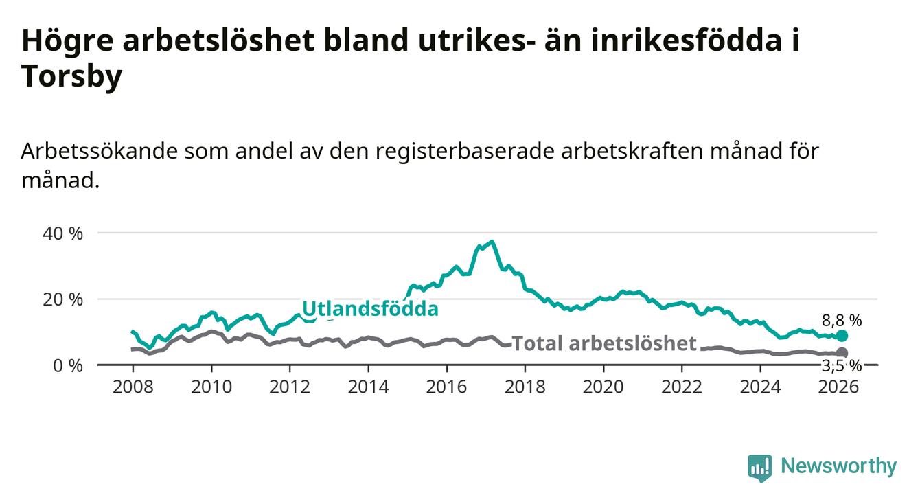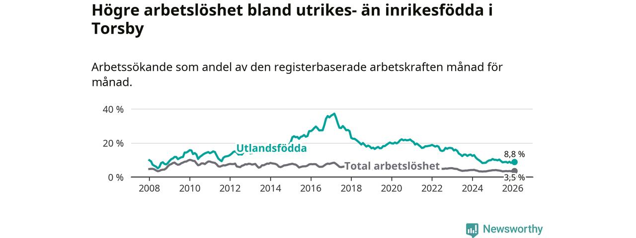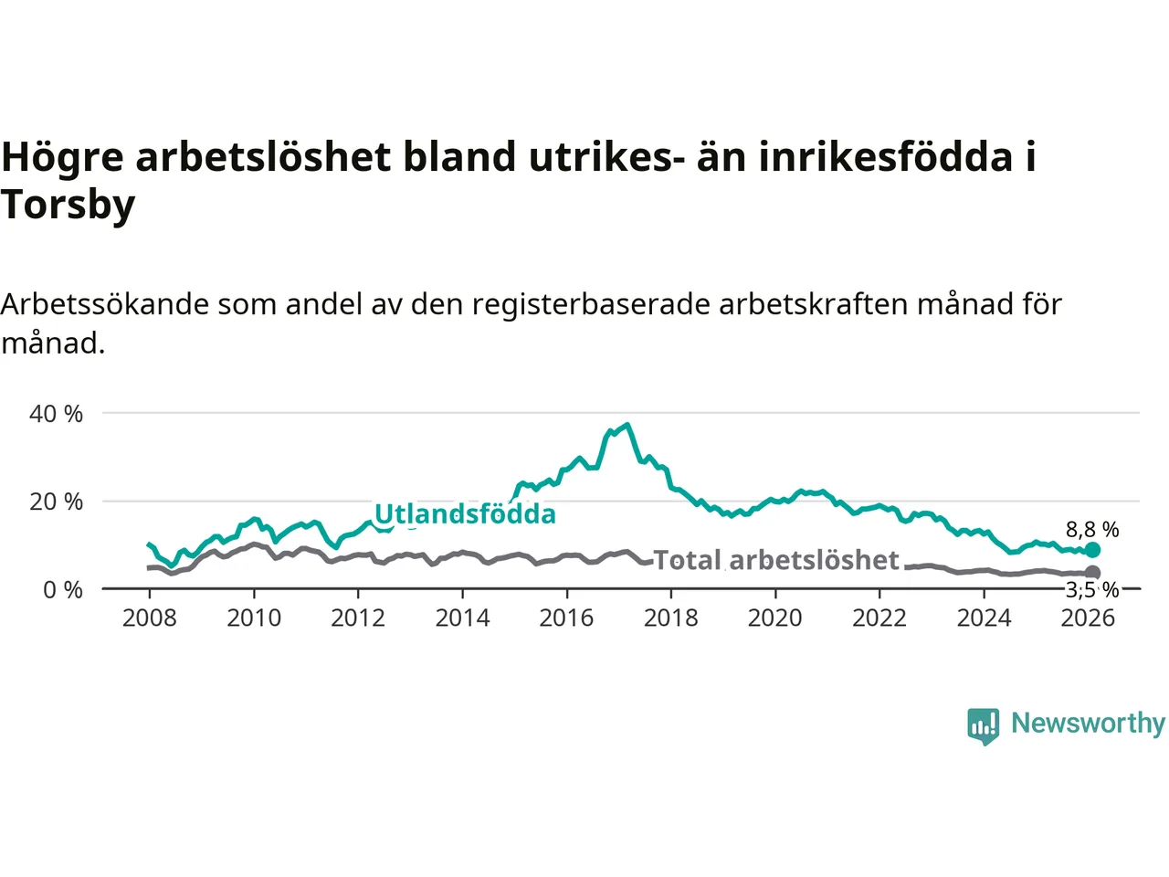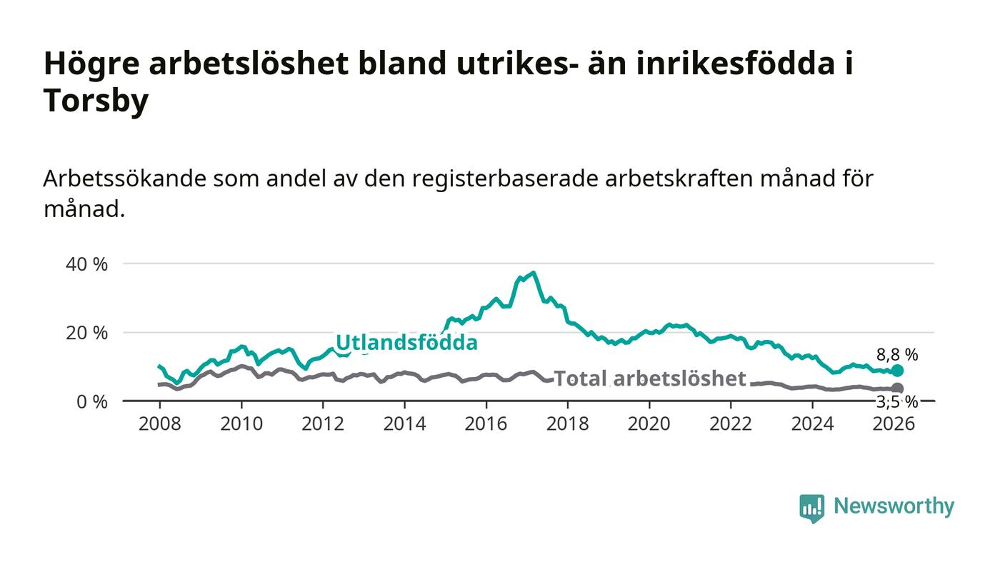 Skillnaden i arbetslöshet mellan utrikesfödda och hela befolkningen är 5,3 procentenheter i Torsby. Det är en mindre skillnad än för ett år sedan (−0,8 procentenheter).
