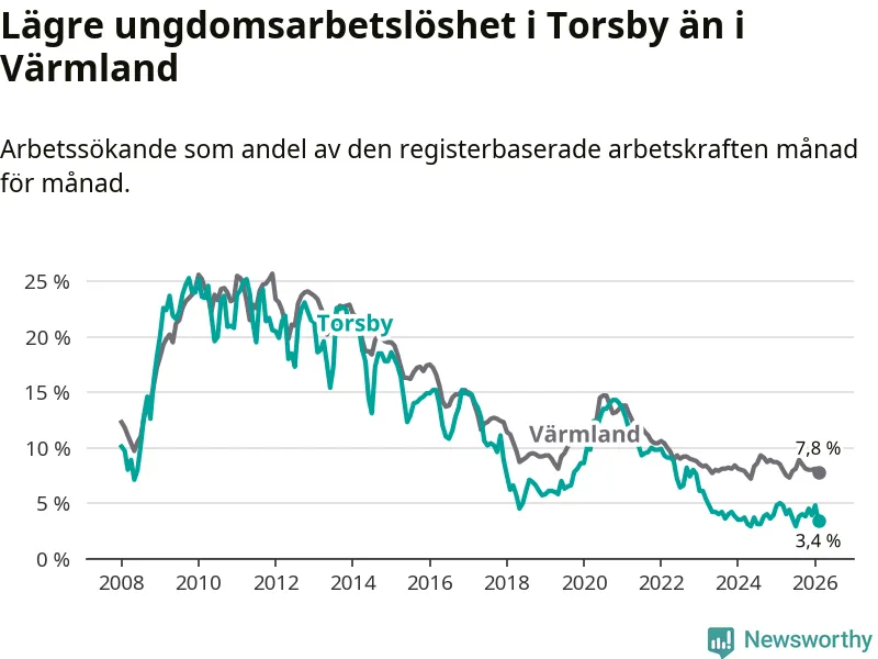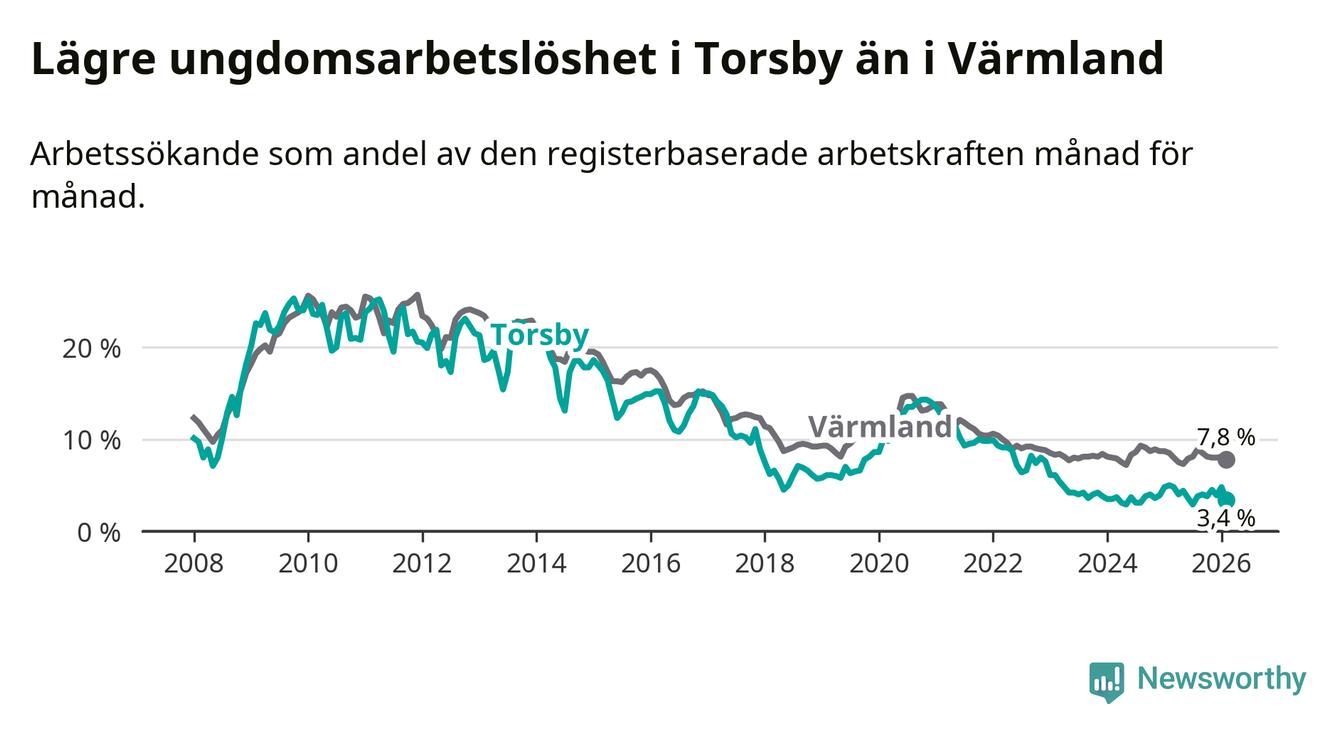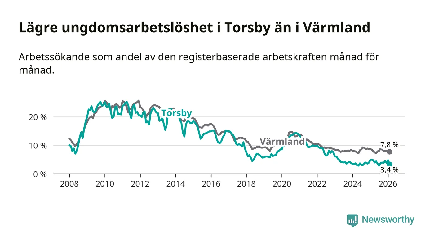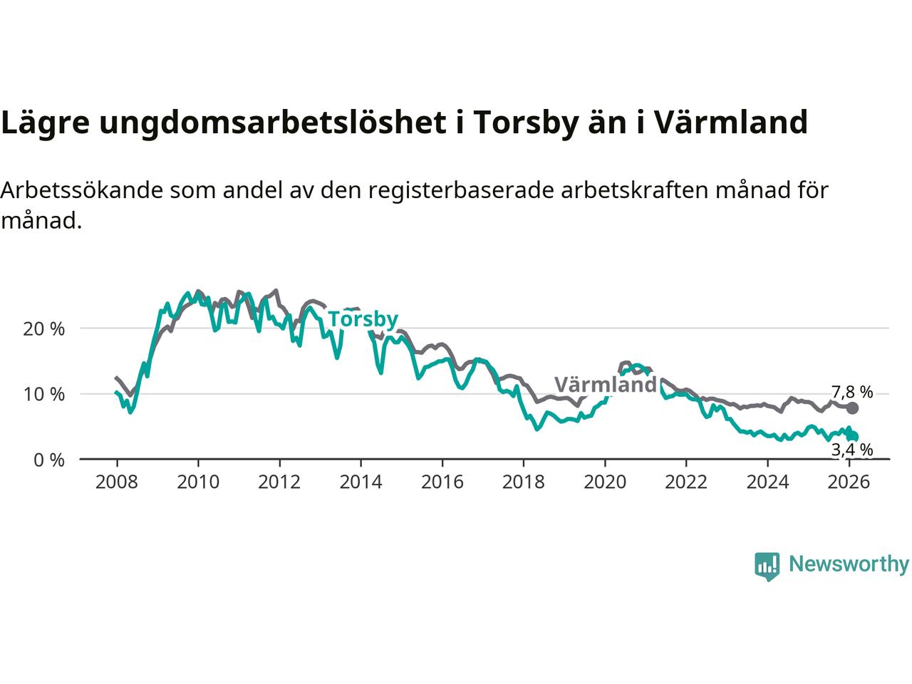 Precis som den totala arbetslösheten ligger ungdomsarbetslösheten i Torsby lägre än i Värmland som helhet. Skillnaden mellan kommunen och länet är 4,4 procentenheter.