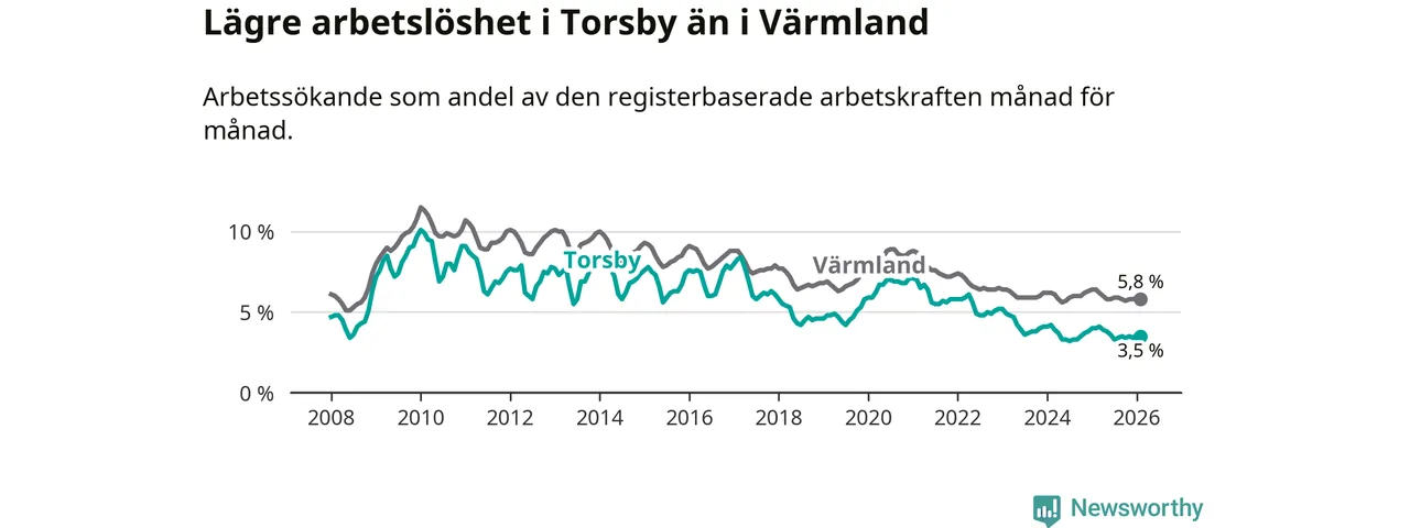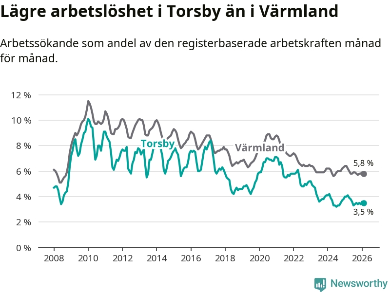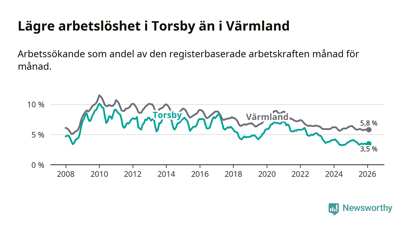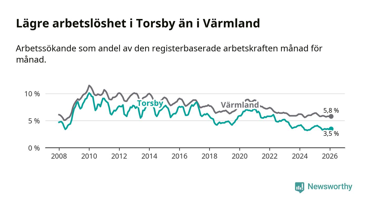 Torsby hade redan tidigare lägre arbetslöshet än snittet i hela Värmlands län och nu växer klyftan (3,5 procent i kommunen, jämfört med 5,8 procent i hela länet). Torsby har därmed även den lägsta arbetslöshetsnivån i länet. Filipstad har den högsta (8,5 procent).