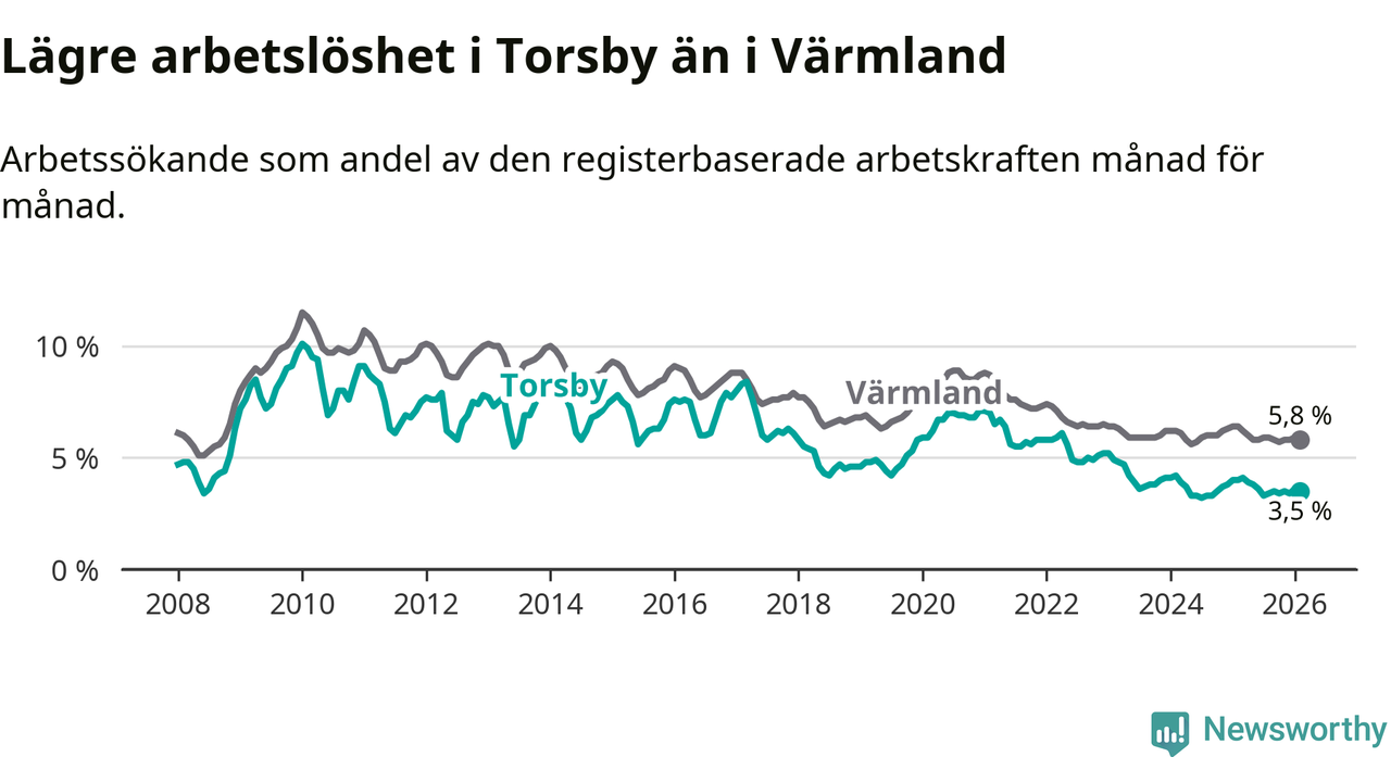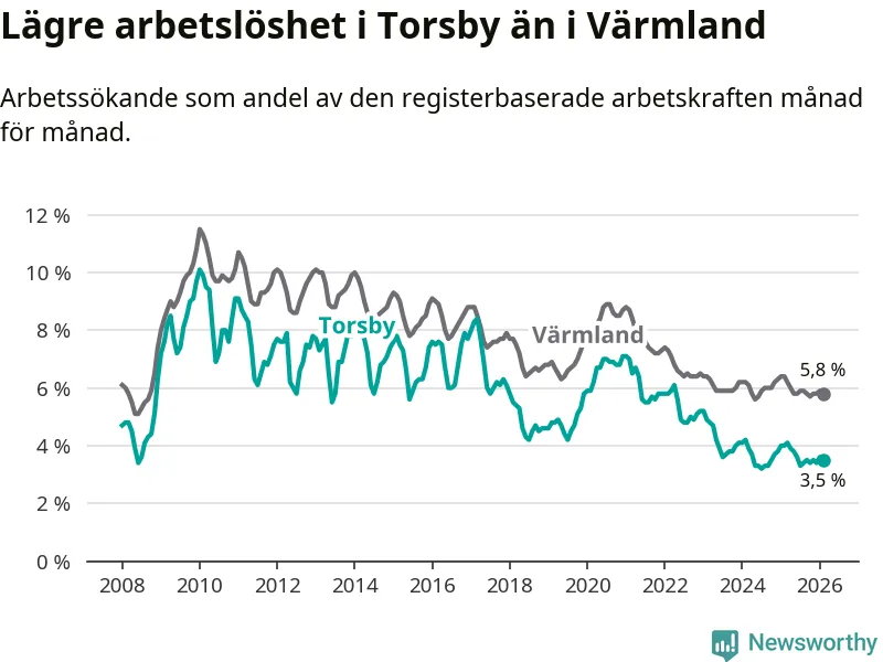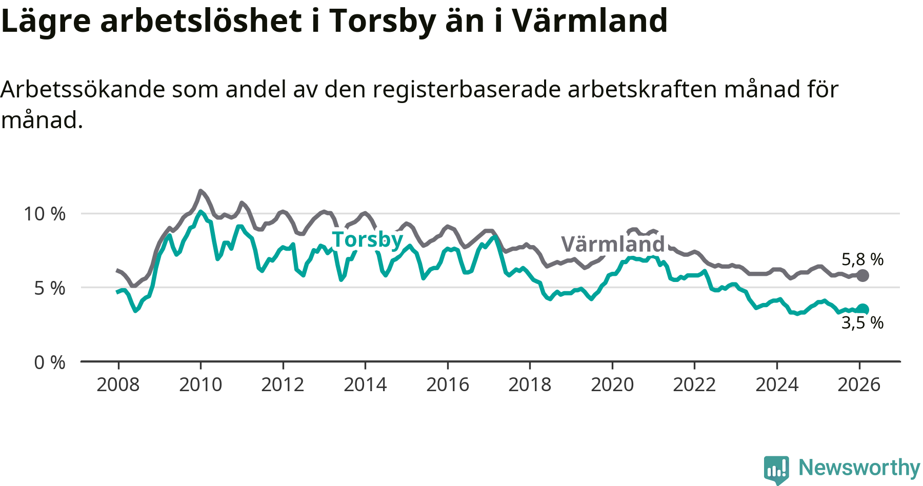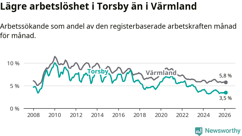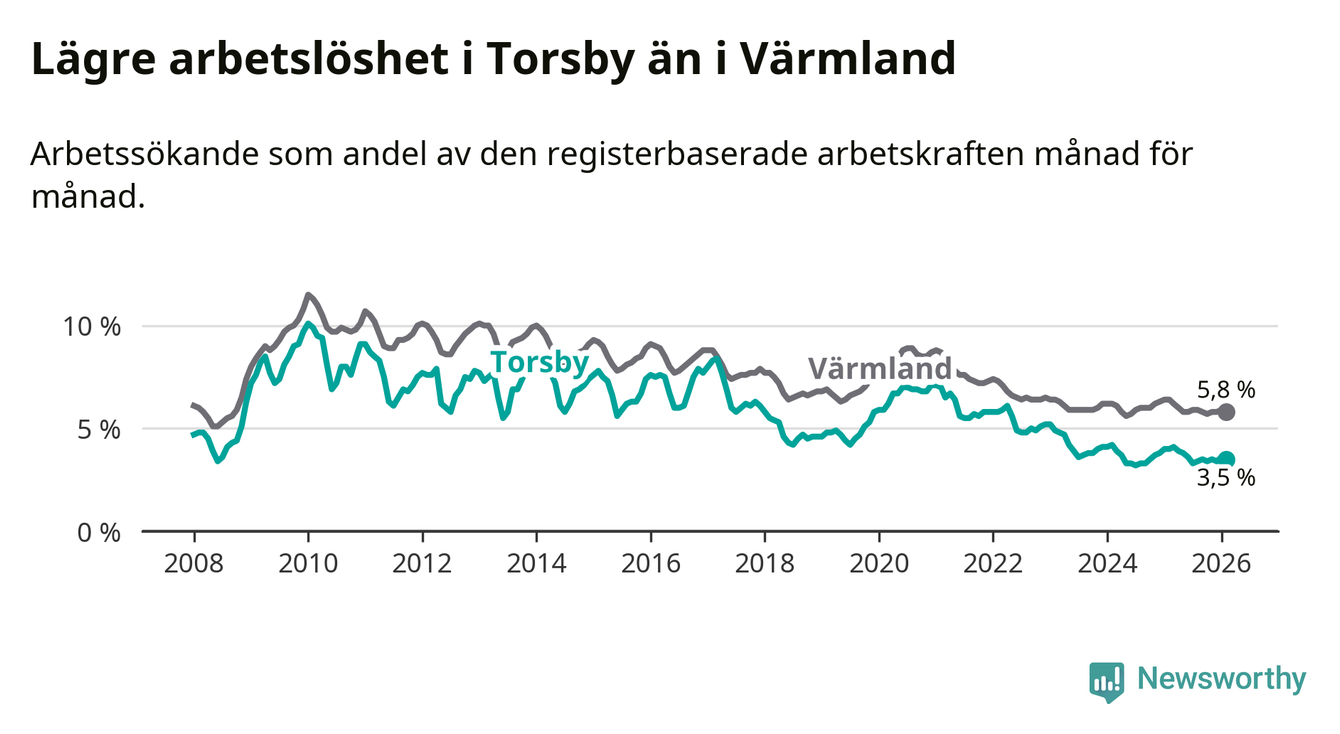 Torsby hade redan tidigare lägre arbetslöshet än snittet i hela Värmlands län och nu växer klyftan (3,5 procent i kommunen, jämfört med 5,8 procent i hela länet). Torsby har därmed även den lägsta arbetslöshetsnivån i länet. Filipstad har den högsta (8,5 procent).