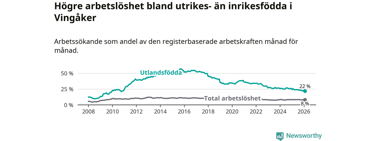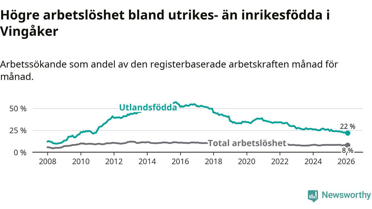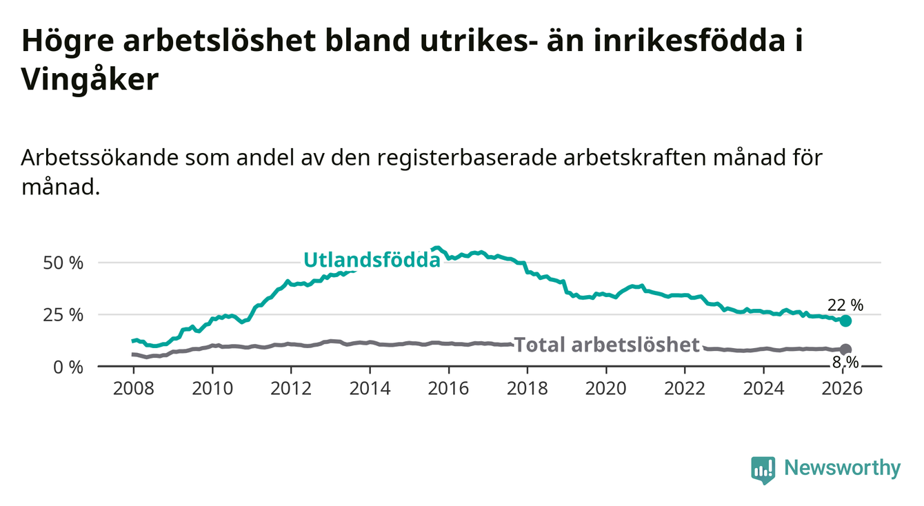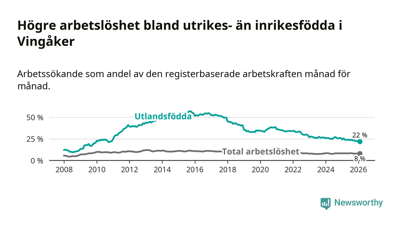 Arbetslösheten bland utlandsfödda var 22,0 procent i Vingåker under februari månad, motsvarande 133 av 605 personer. Det är 3,7 procentenheter färre än vid samma tidpunkt i fjol (−26 om man räknar personer). Därmed är de utlandsföddas arbetslöshet lägre än vid samma tidpunkt i fjol för 19:e månaden i följd. Sedan juli 2024 har arbetslösheten bland utlandsfödda minskat från 26,5 till 22,0 procent. Den nuvarande arbetslöshetsnivån är den lägsta sedan november 2010.