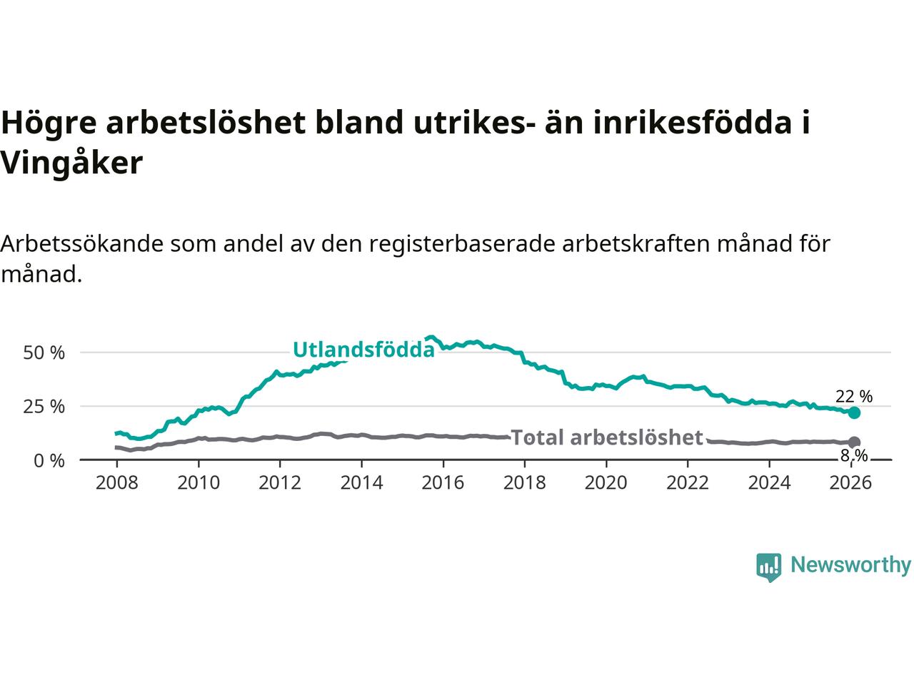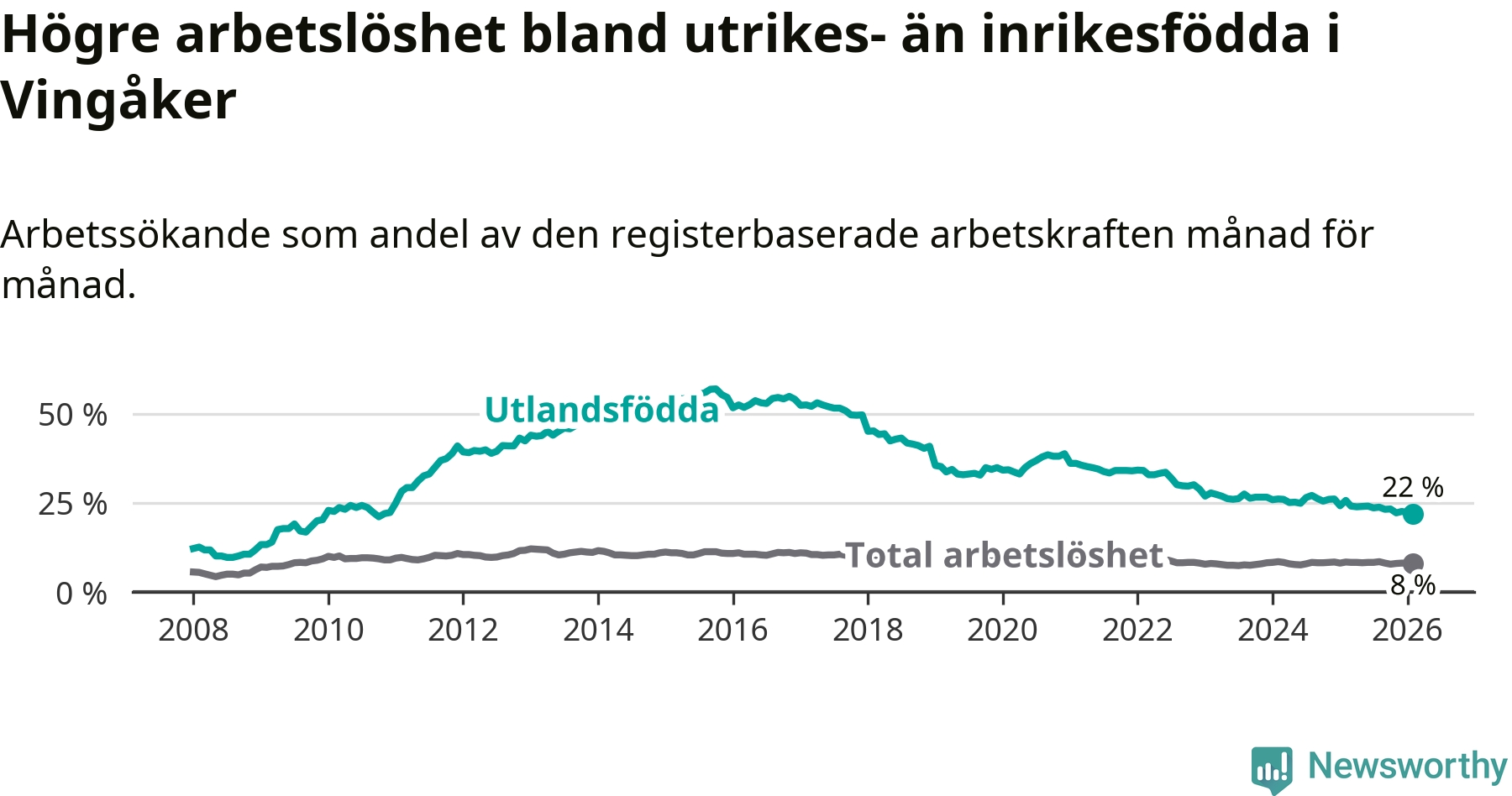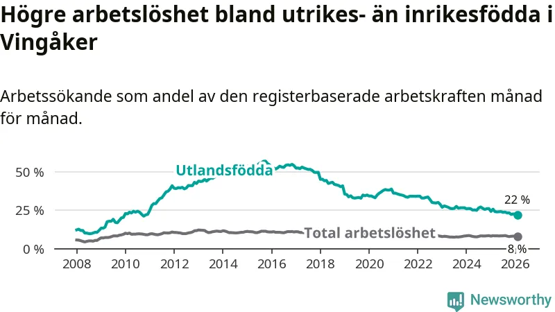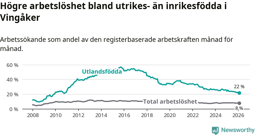 Arbetslösheten bland utlandsfödda var 22,0 procent i Vingåker under februari månad, motsvarande 133 av 605 personer. Det är 3,7 procentenheter färre än vid samma tidpunkt i fjol (−26 om man räknar personer). Därmed är de utlandsföddas arbetslöshet lägre än vid samma tidpunkt i fjol för 19:e månaden i följd. Sedan juli 2024 har arbetslösheten bland utlandsfödda minskat från 26,5 till 22,0 procent. Den nuvarande arbetslöshetsnivån är den lägsta sedan november 2010.