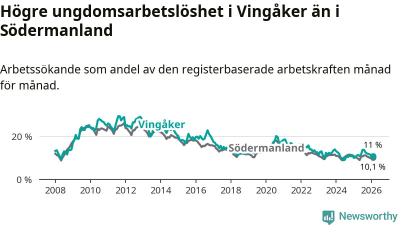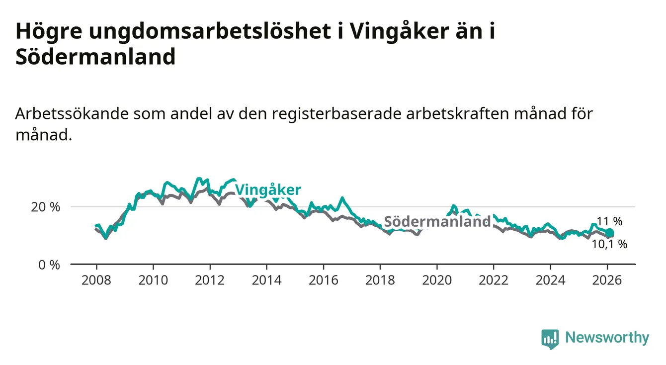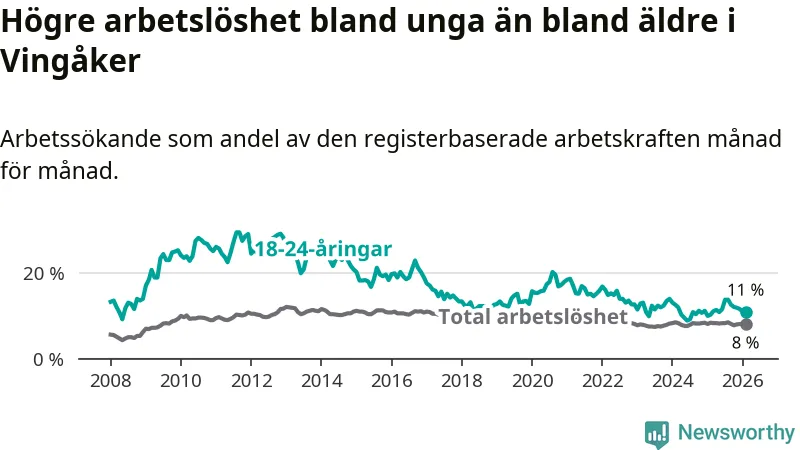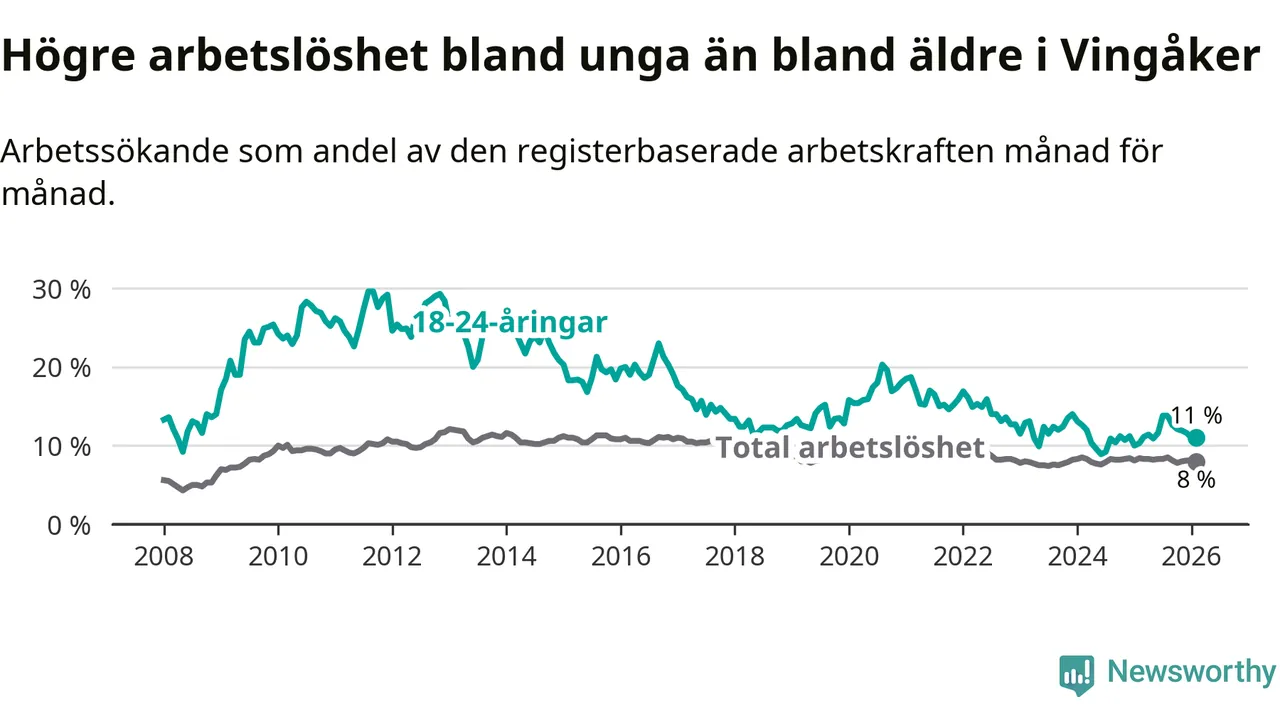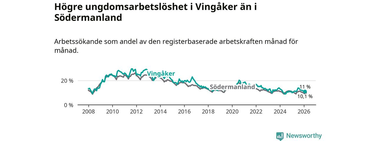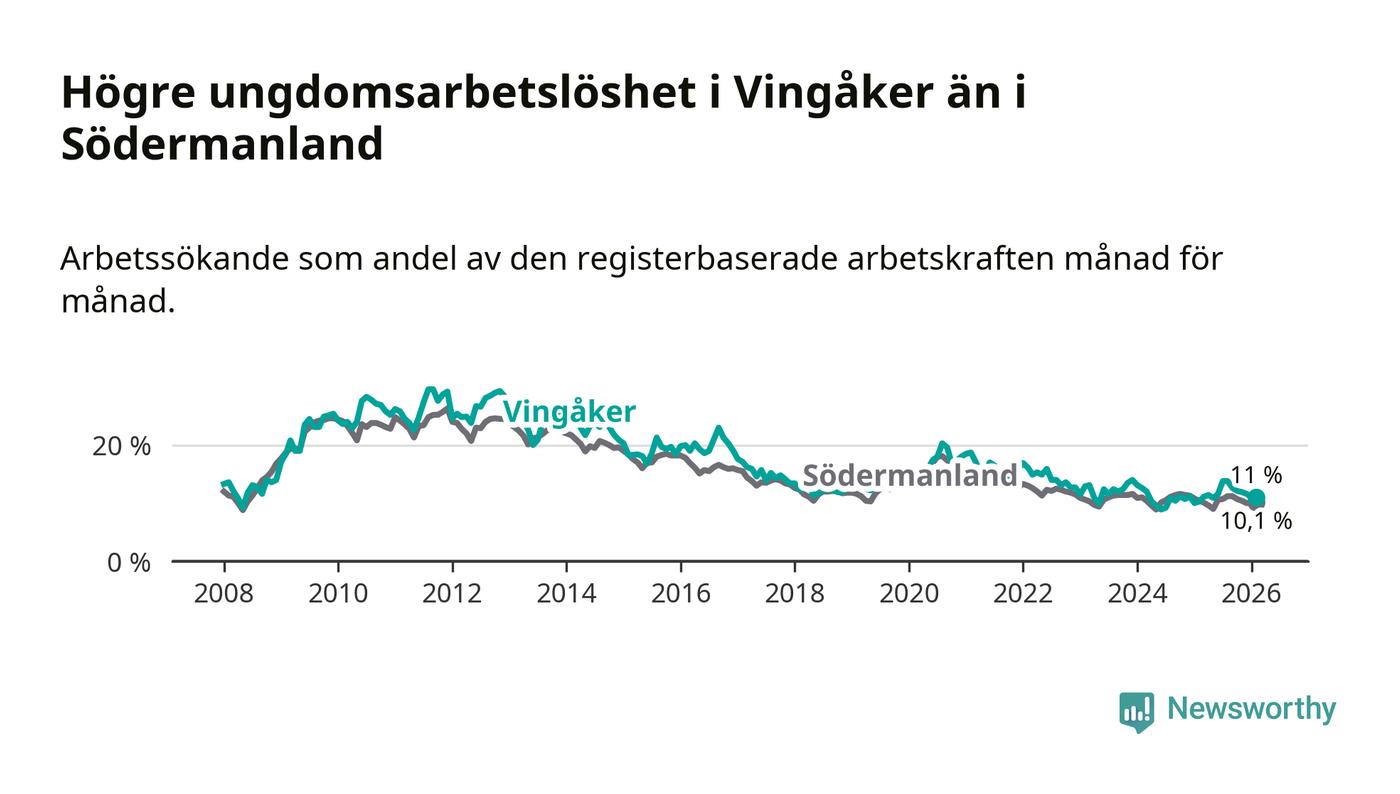 I och med den senaste månadens uppgång har de ungas arbetslöshet i Vingåker stigit elva månader i följd (upp från 11,1 procent i mars 2025 till 11,0 procent nu).