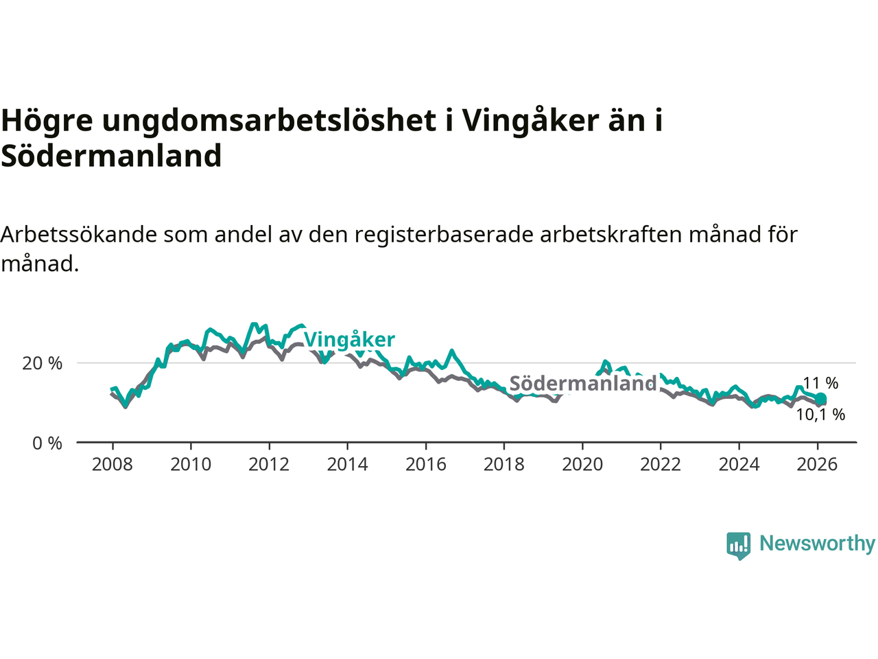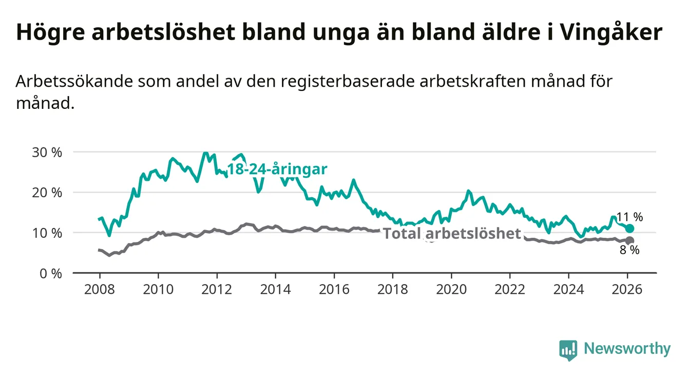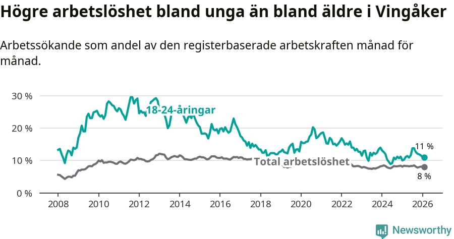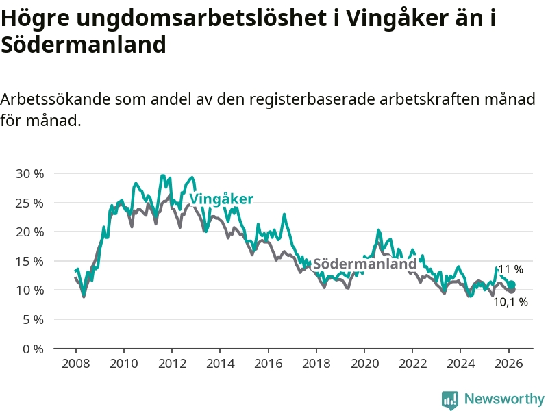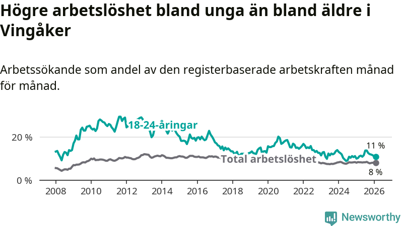 I och med den senaste månadens uppgång har de ungas arbetslöshet i Vingåker stigit elva månader i följd (upp från 11,1 procent i mars 2025 till 11,0 procent nu).