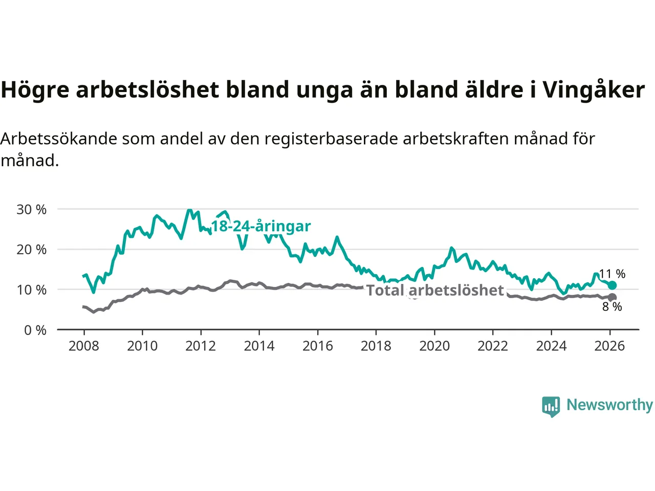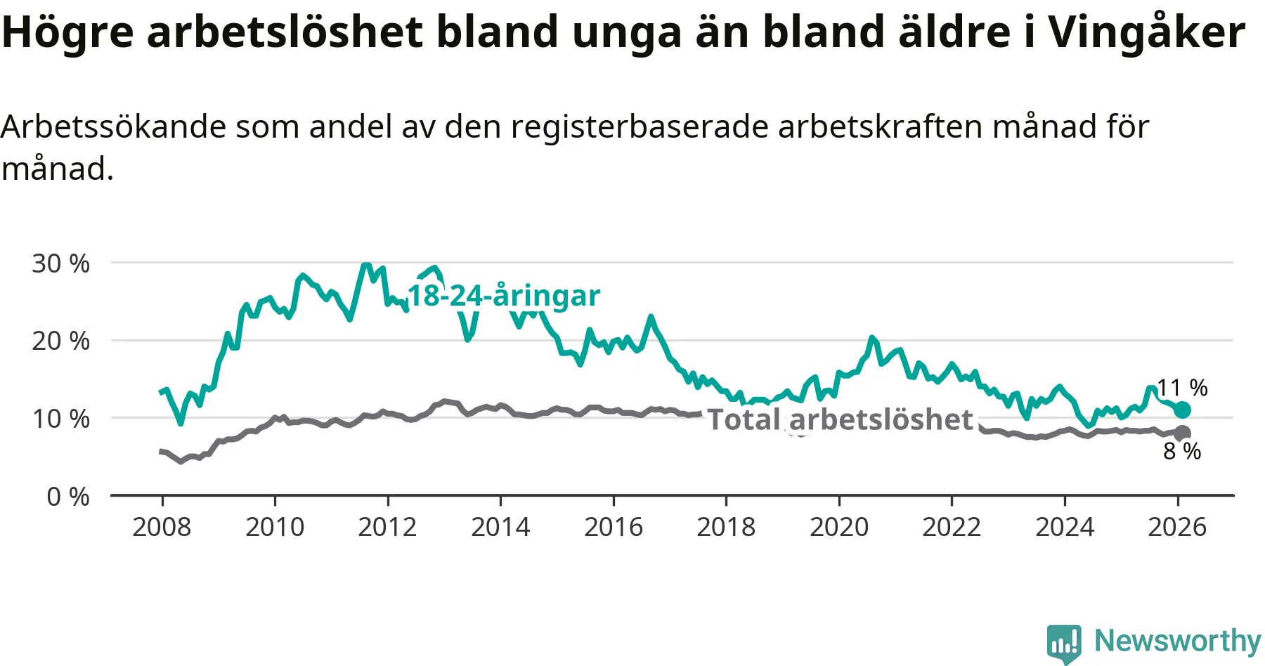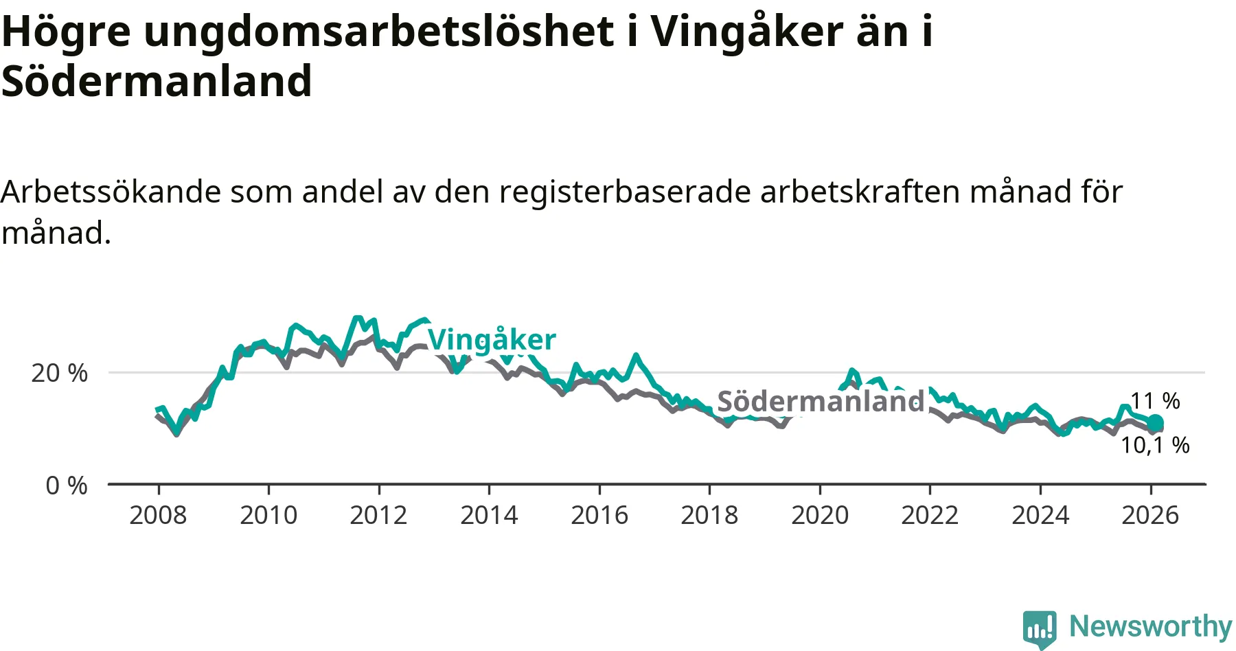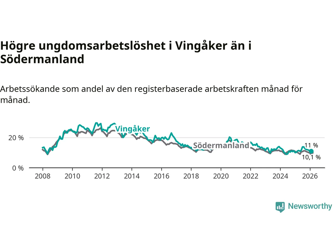I och med den senaste månadens uppgång har de ungas arbetslöshet i Vingåker stigit elva månader i följd (upp från 11,1 procent i mars 2025 till 11,0 procent nu).
