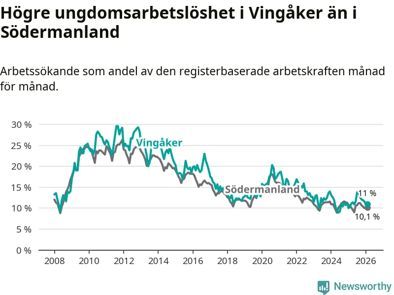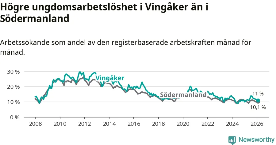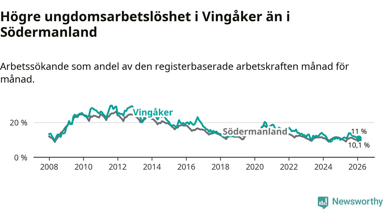 Medan Vingåker har lägre total arbetslöshet än Södermanland, ligger ungdomsarbetslösheten 0,9 procentenheter högre i Vingåker.