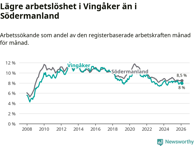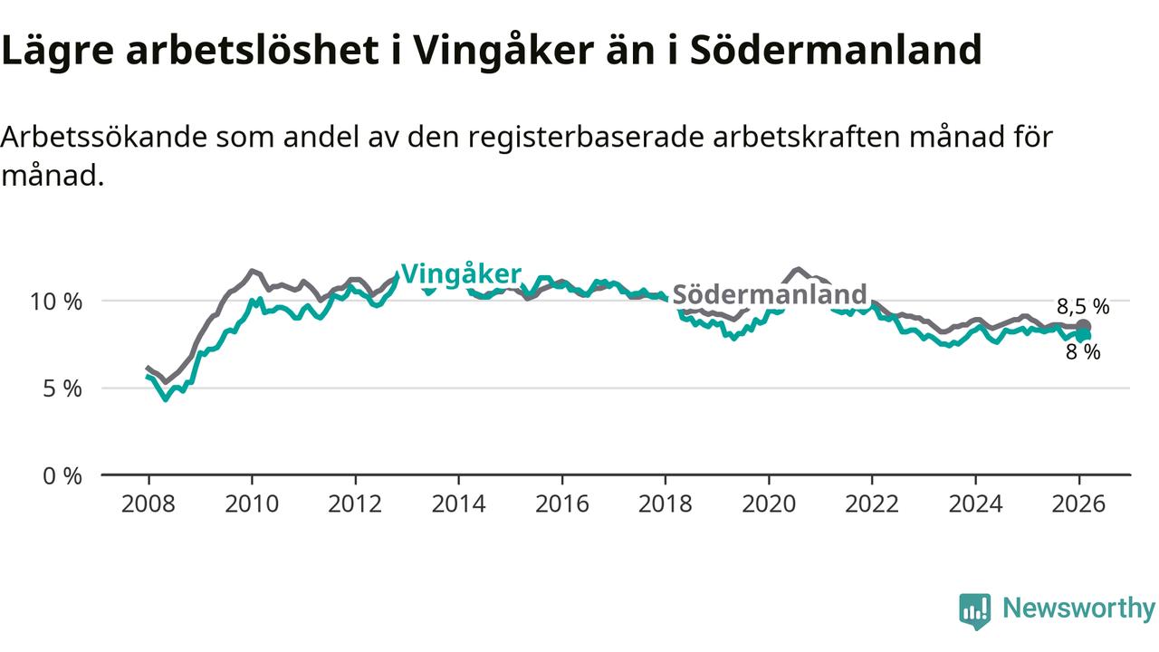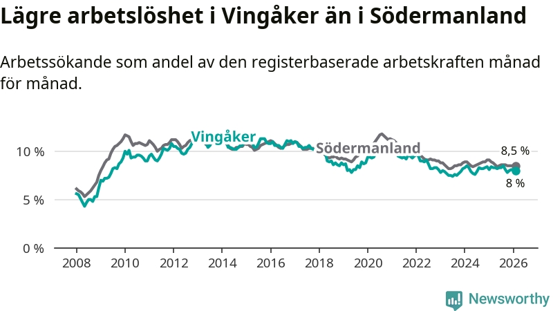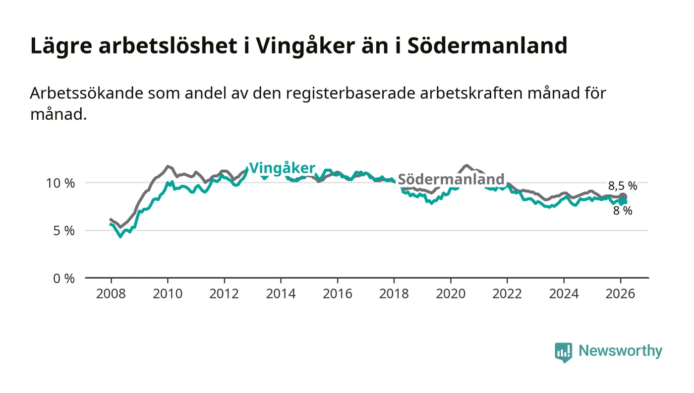 Vingåker hade redan tidigare lägre arbetslöshet än snittet i hela Södermanlands län och nu växer klyftan (8,0 procent i kommunen, jämfört med 8,5 procent i hela länet). Trosa har den lägsta arbetslösheten i länet (3,5 procent), medan Eskilstuna har den högsta (10,7 procent). För att Vingåker skulle komma ner i samma arbetslöshetsnivå som Trosa skulle 177 personer behöva sysselsättas.