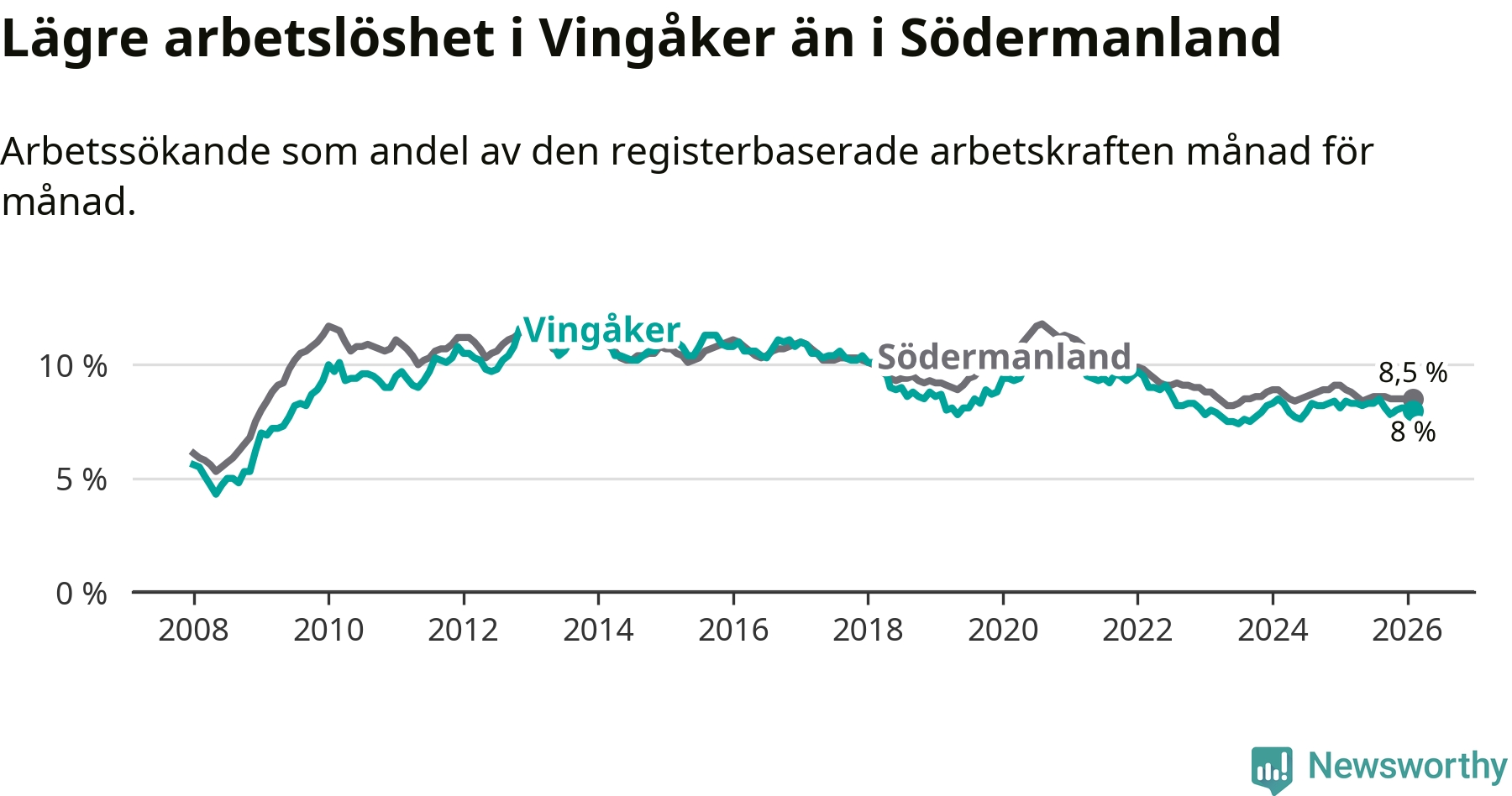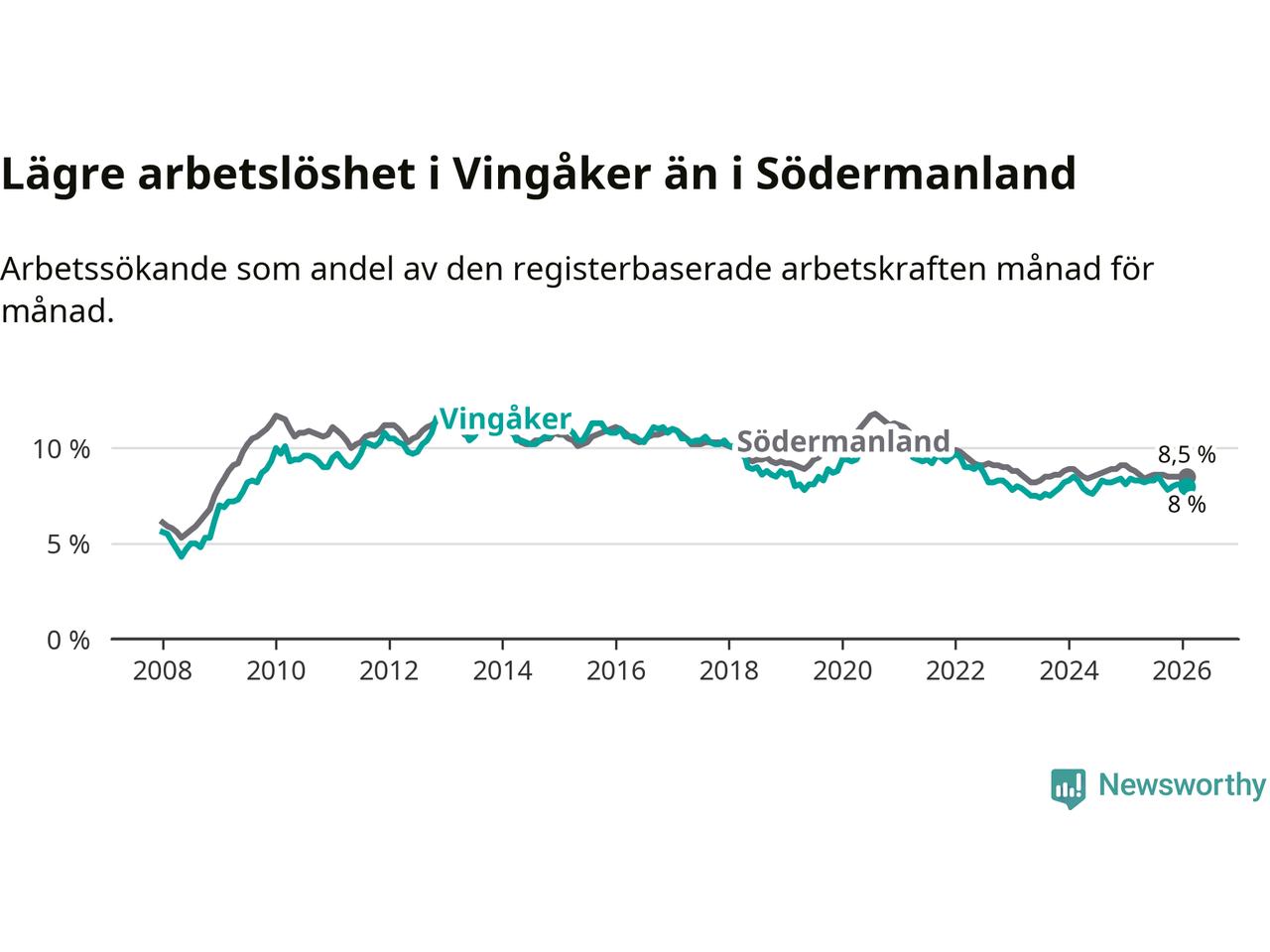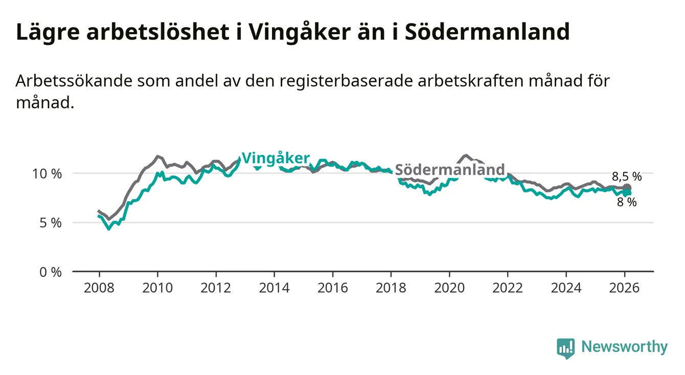 Vingåker hade redan tidigare lägre arbetslöshet än snittet i hela Södermanlands län och nu växer klyftan (8,0 procent i kommunen, jämfört med 8,5 procent i hela länet). Trosa har den lägsta arbetslösheten i länet (3,5 procent), medan Eskilstuna har den högsta (10,7 procent). För att Vingåker skulle komma ner i samma arbetslöshetsnivå som Trosa skulle 177 personer behöva sysselsättas.