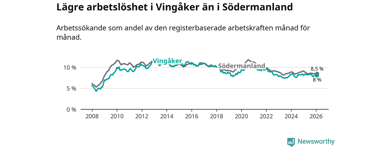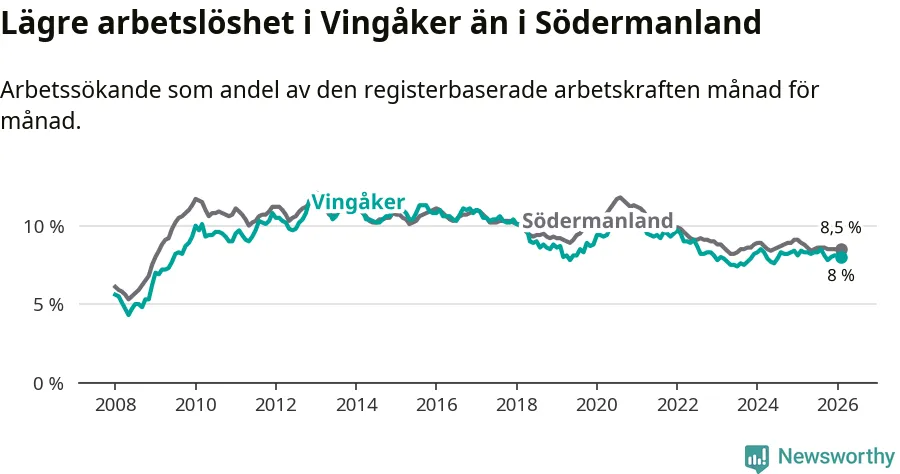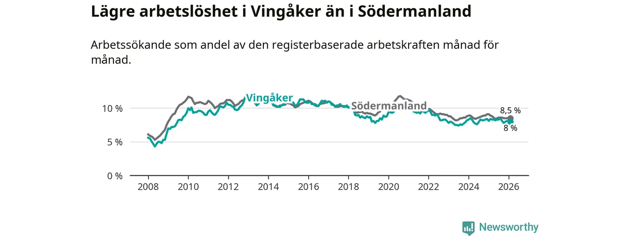 Under februari månad rapporterade Vingåkers kommun en total arbetslöshet på 8,0 procent. Det är en minskning jämfört med samma tidpunkt i fjol (−0,4 procentenheter). Även i Södermanlands län sjunker arbetslösheten .