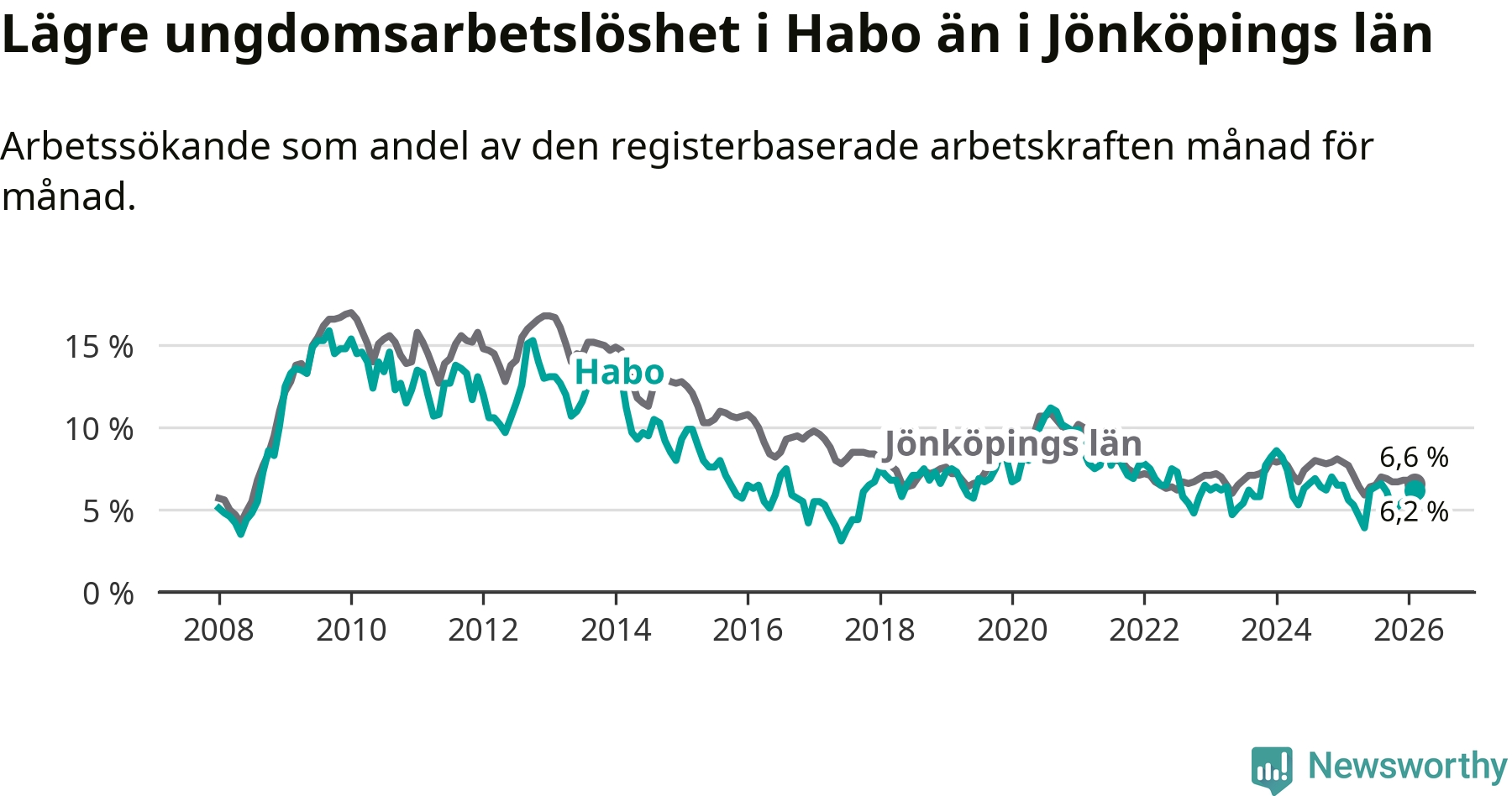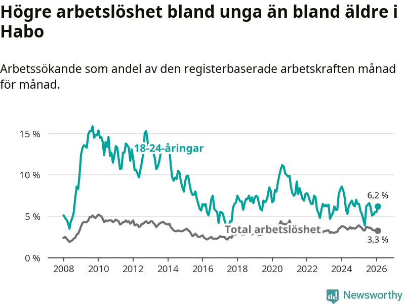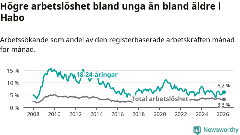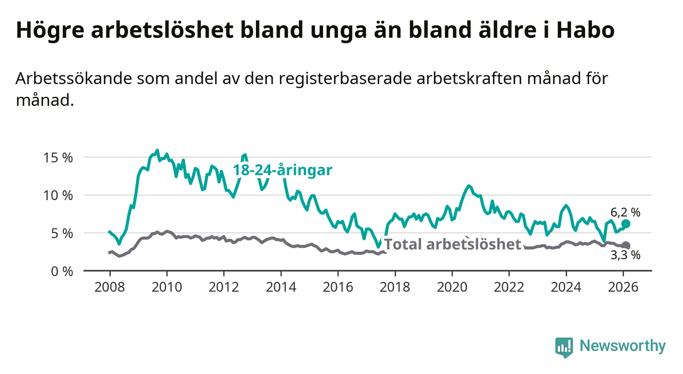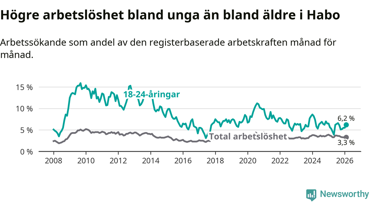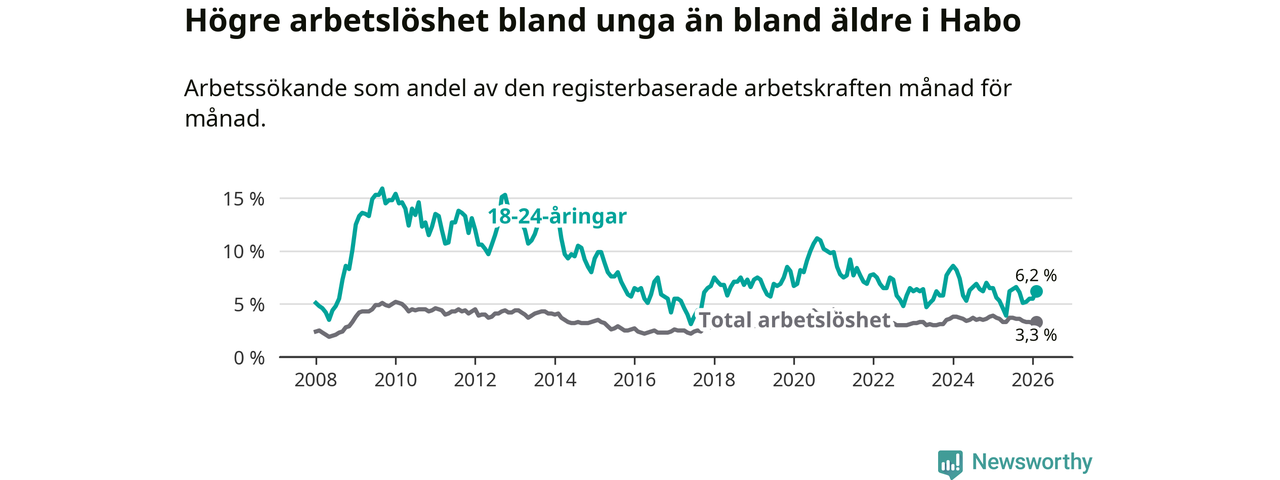 Den senaste månadsstatistiken från Arbetsförmedlingen visar på en uppgång i ungdomsarbetslöshet i Habo kommun med 0,6 procentenheter. Arbetslösheten bland personer i åldern 18–24 år låg i februari på 6,2 procent.