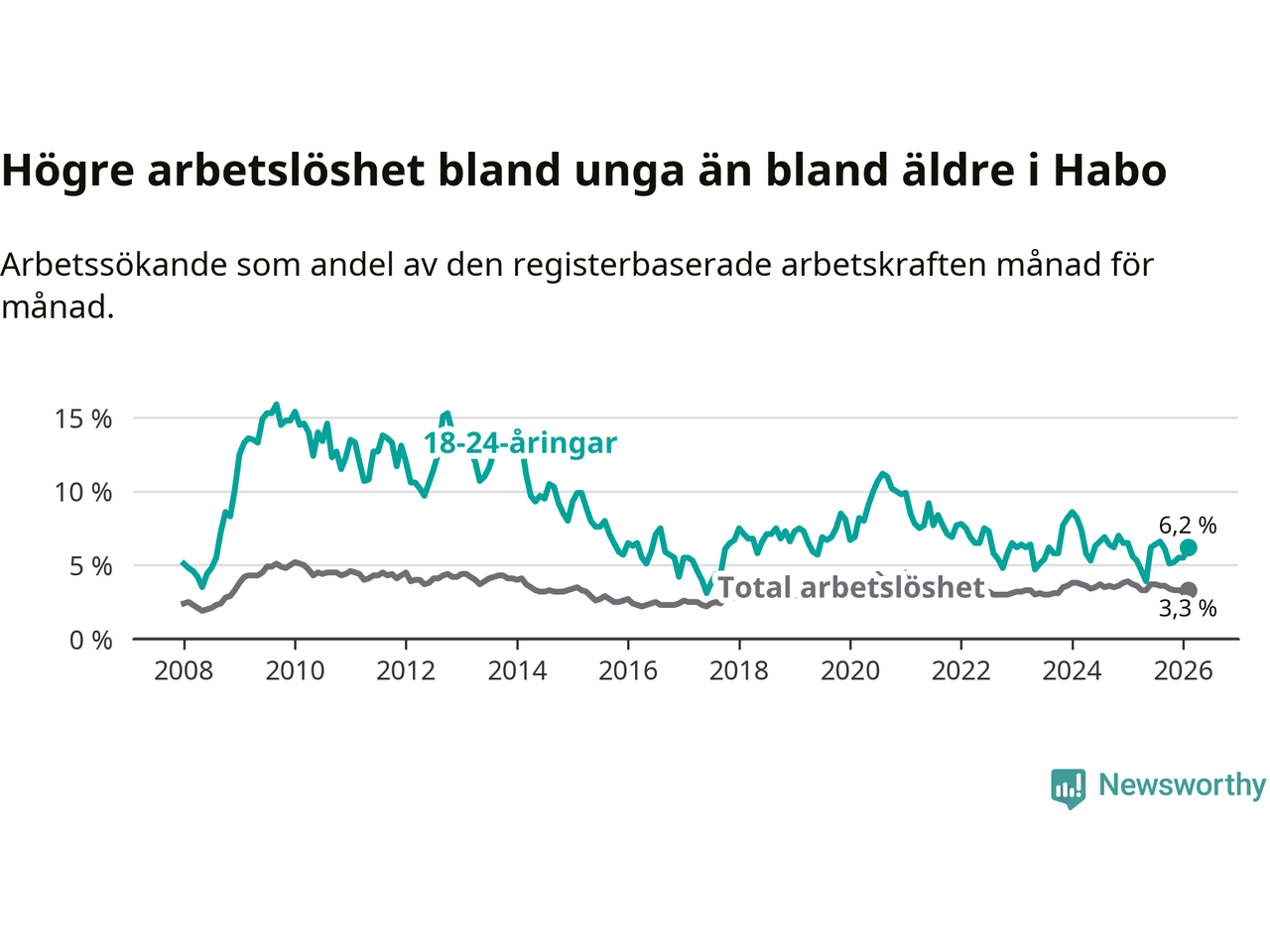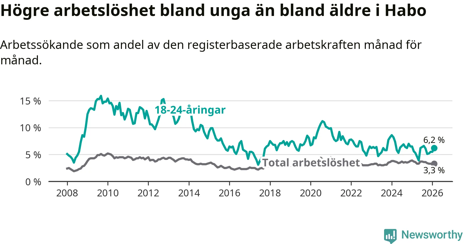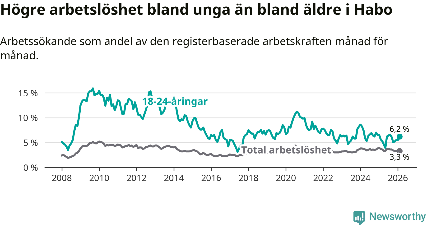 Den senaste månadsstatistiken från Arbetsförmedlingen visar på en uppgång i ungdomsarbetslöshet i Habo kommun med 0,6 procentenheter. Arbetslösheten bland personer i åldern 18–24 år låg i februari på 6,2 procent.