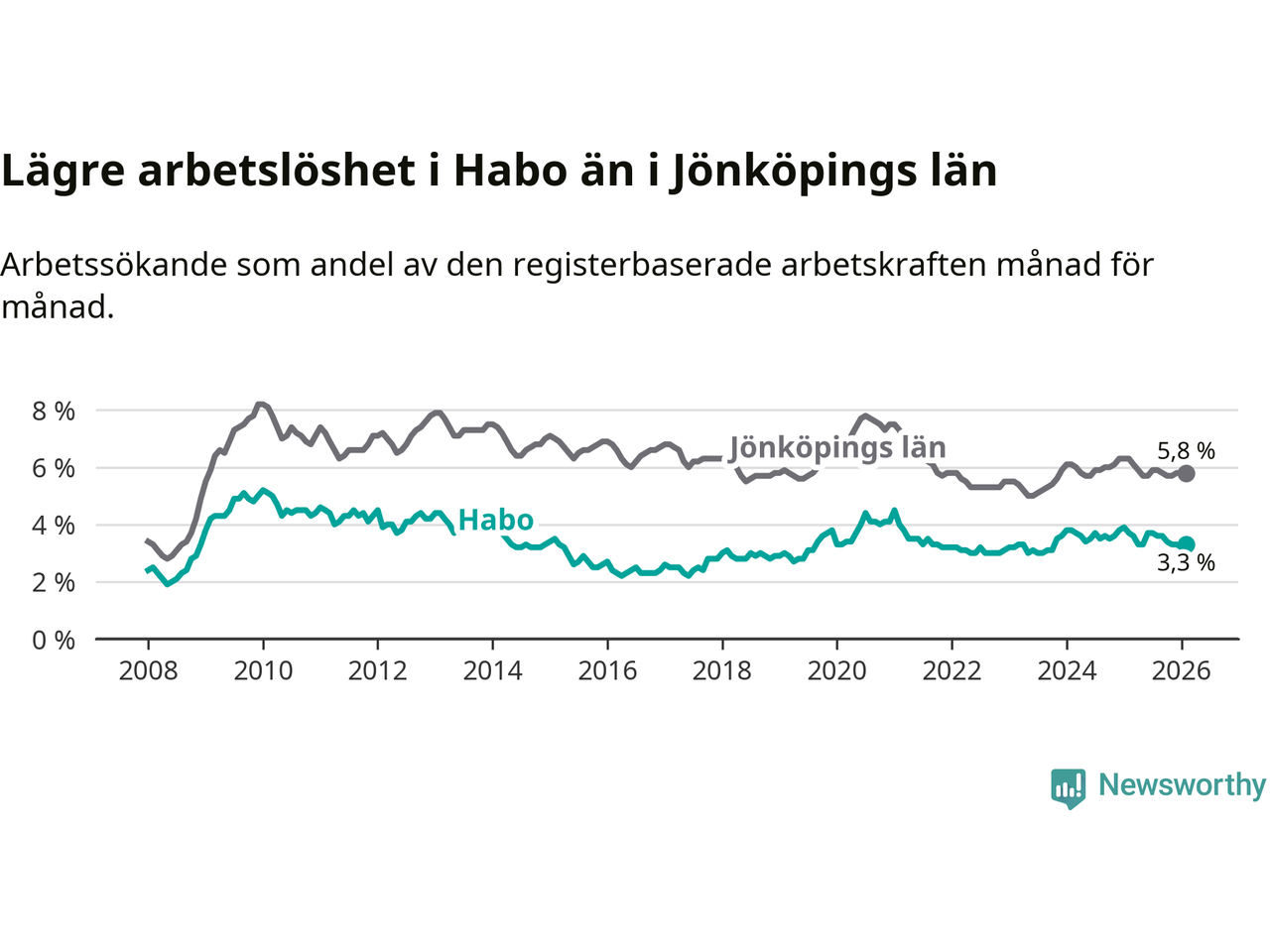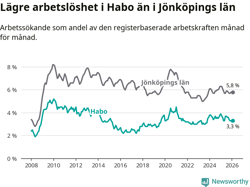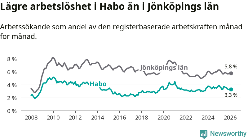 Habo hade redan tidigare lägre arbetslöshet än snittet i hela Jönköpings län och nu växer klyftan (3,3 procent i kommunen, jämfört med 5,8 procent i hela länet). Habo har därmed även den lägsta arbetslöshetsnivån i länet. Nässjö och Sävsjö har den högsta (7,5 procent).