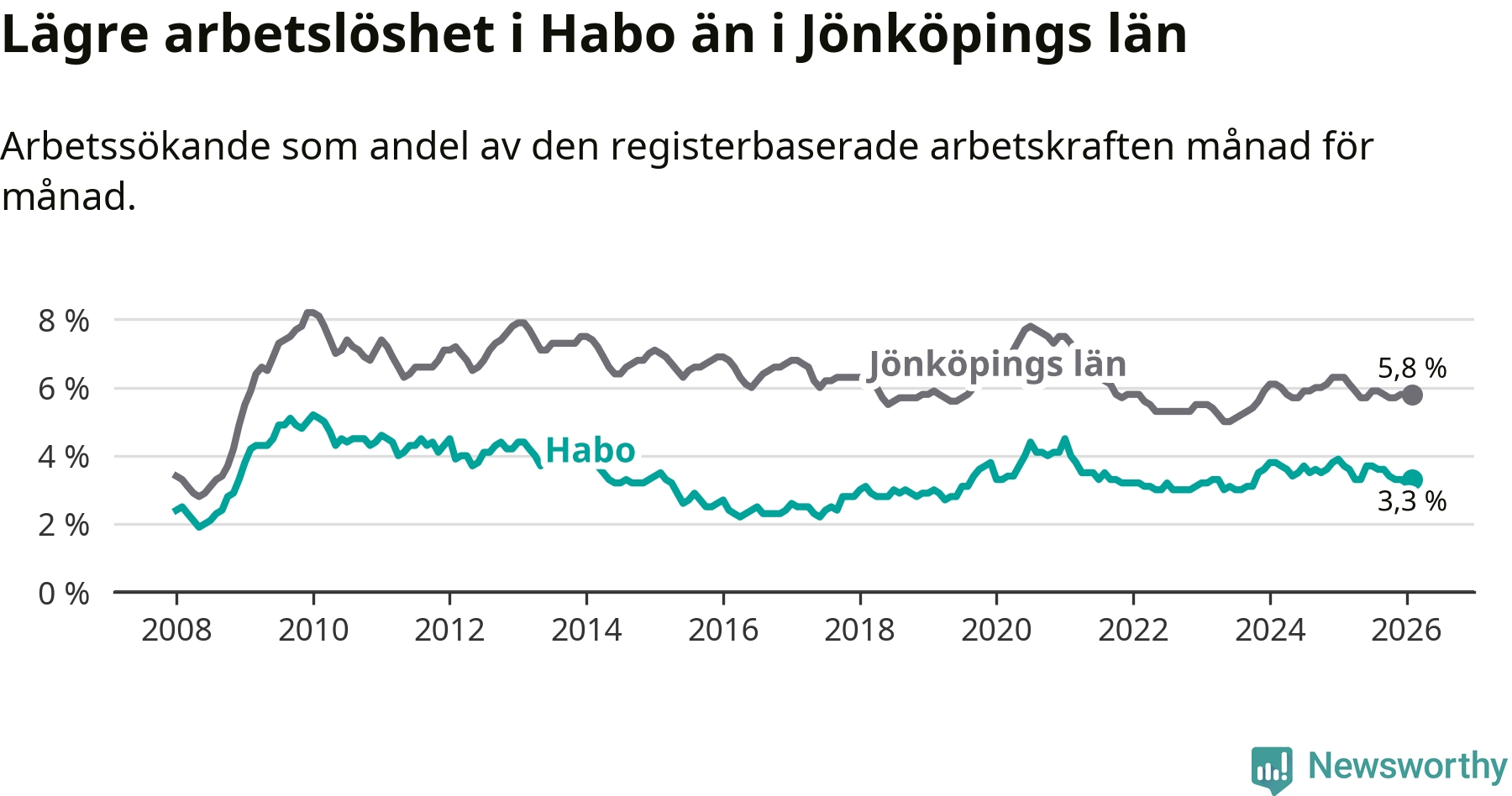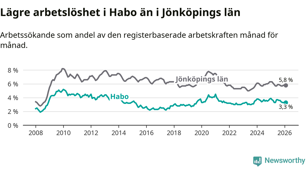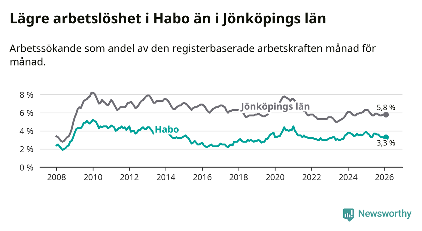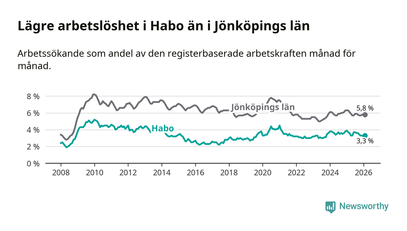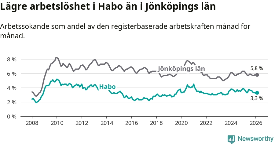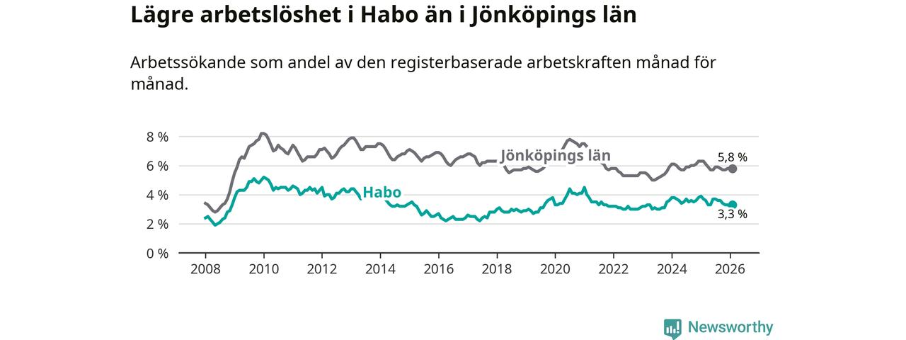Under februari månad rapporterade Habo kommun en total arbetslöshet på 3,3 procent. Det är en minskning jämfört med samma tidpunkt i fjol (−0,4 procentenheter). Även i Jönköpings län sjunker arbetslösheten .