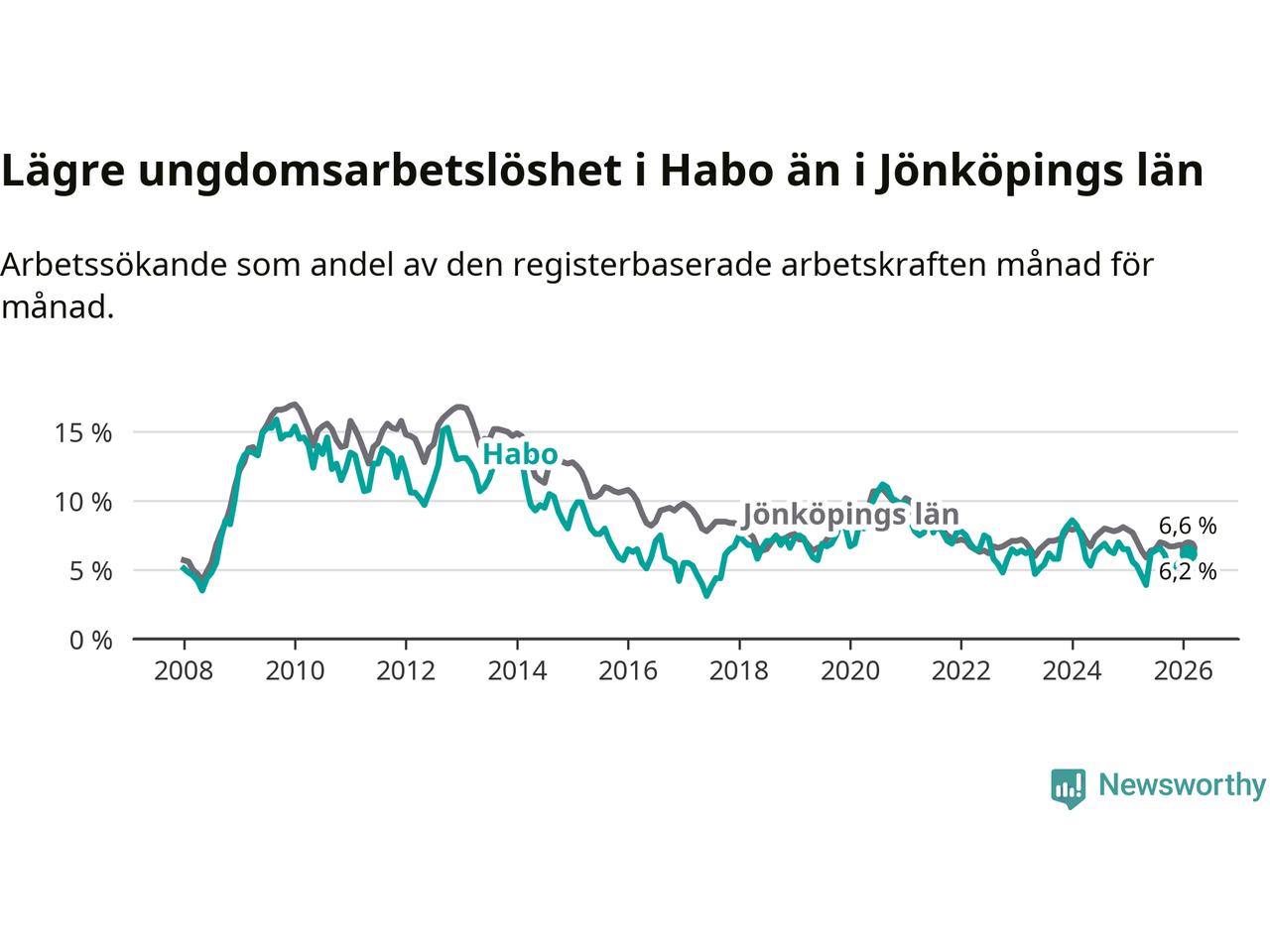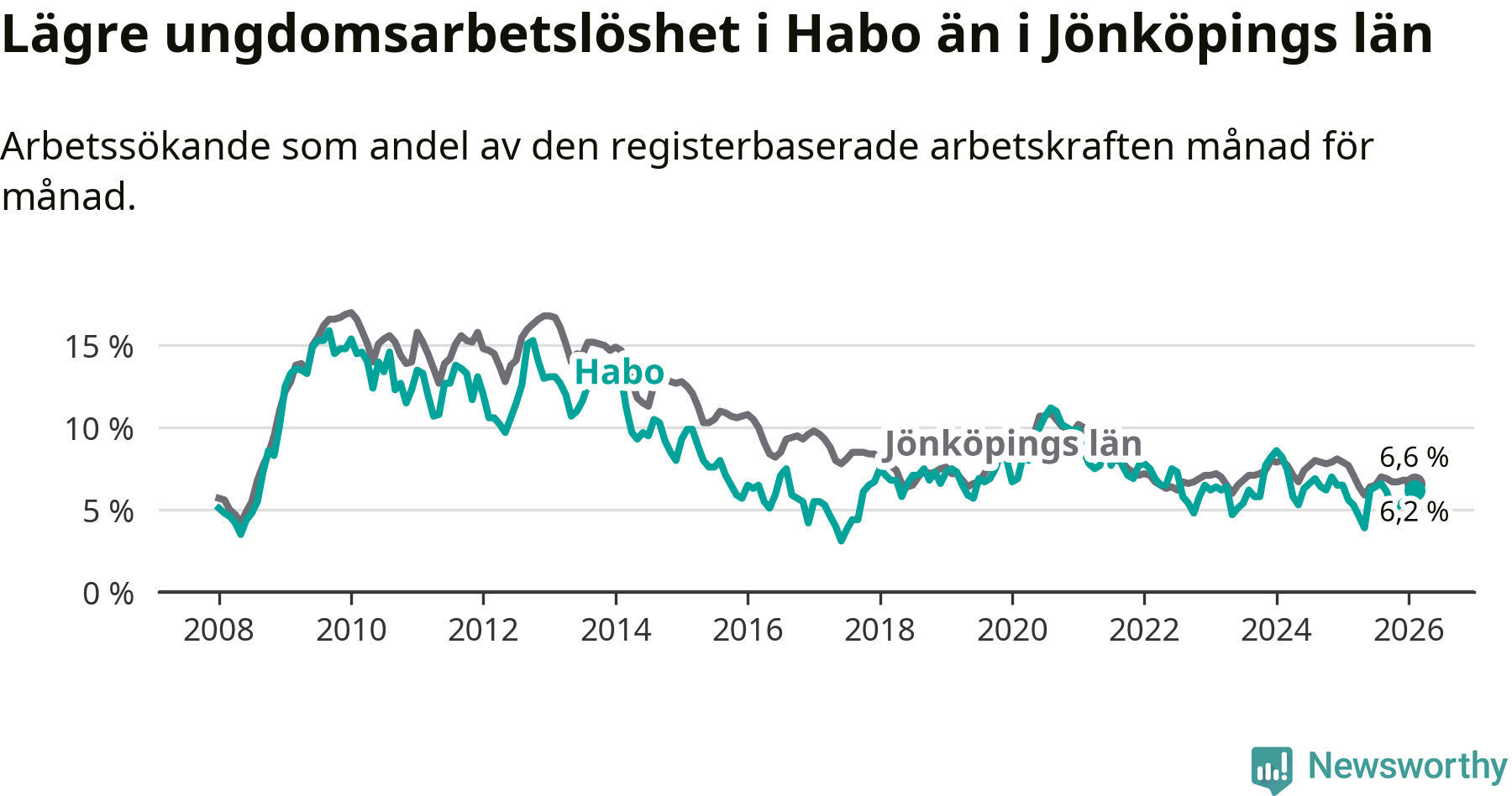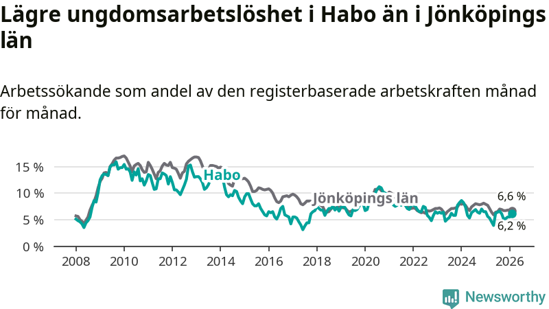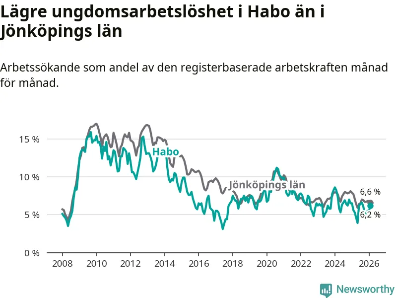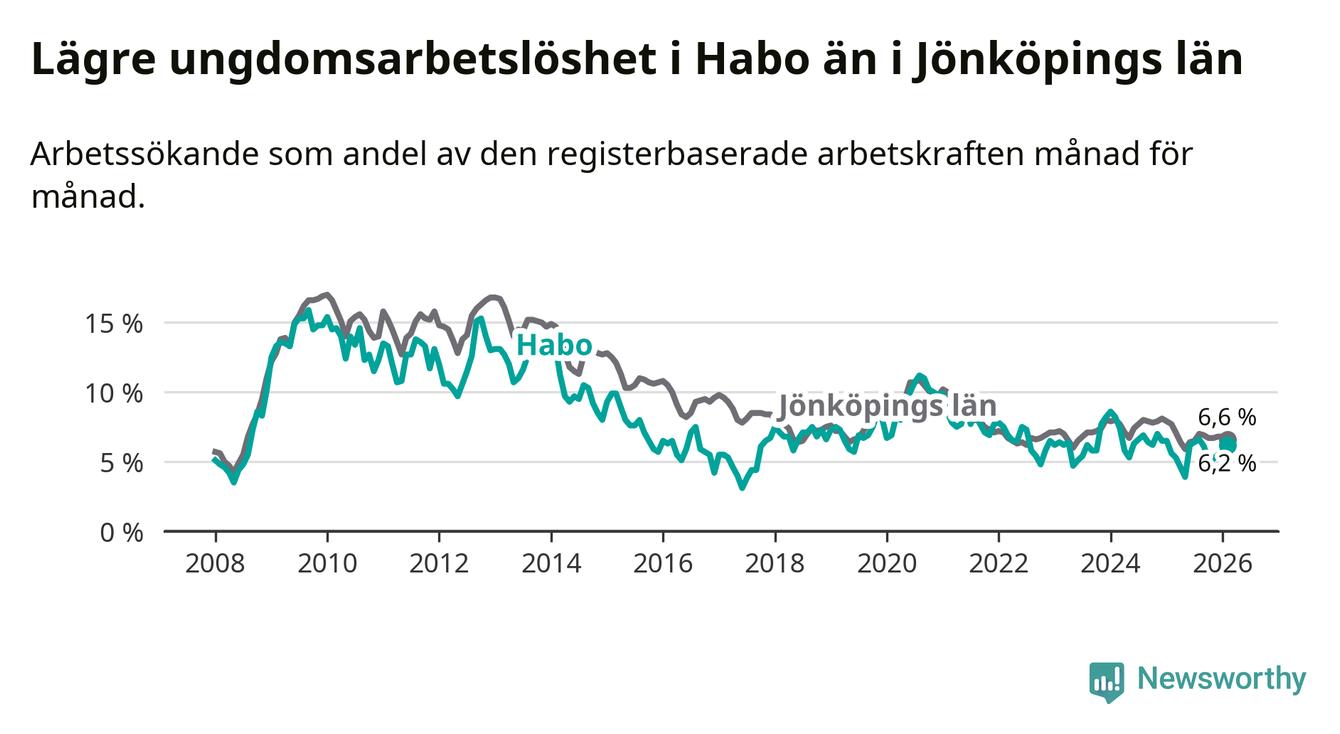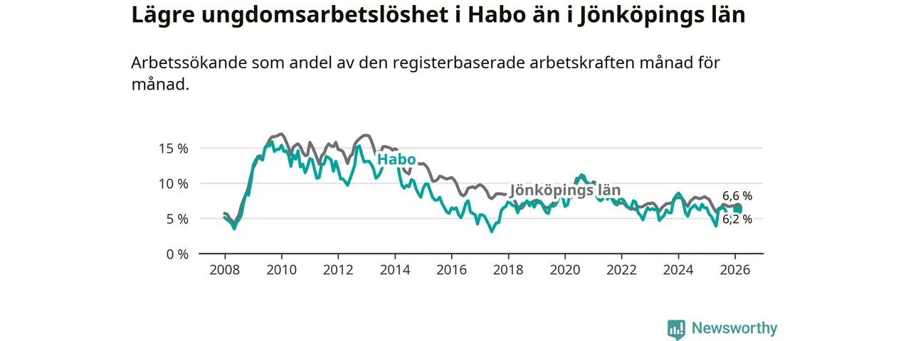 Sedan oktober 2024 har ungdomsarbetslösheten i Habo kommun minskat, men i februari vände utvecklingen då andelen arbetslösa steg jämfört med året innan.