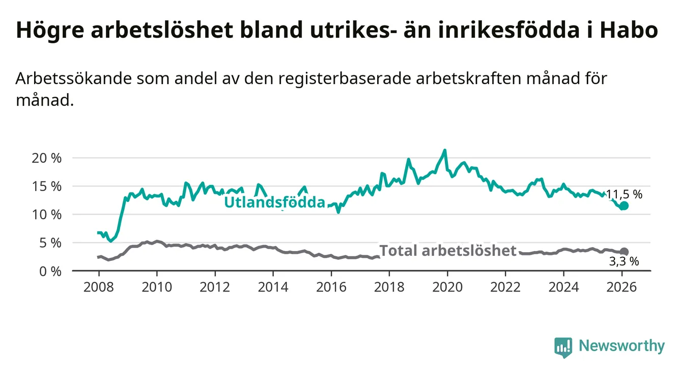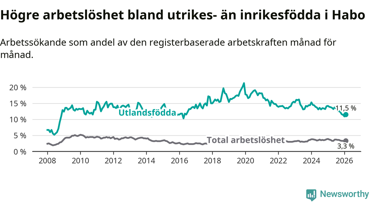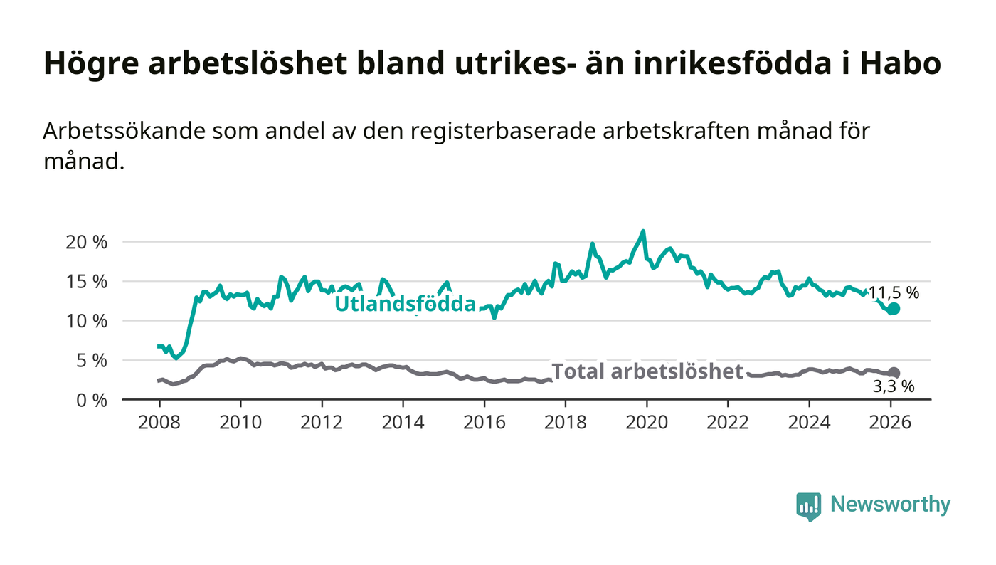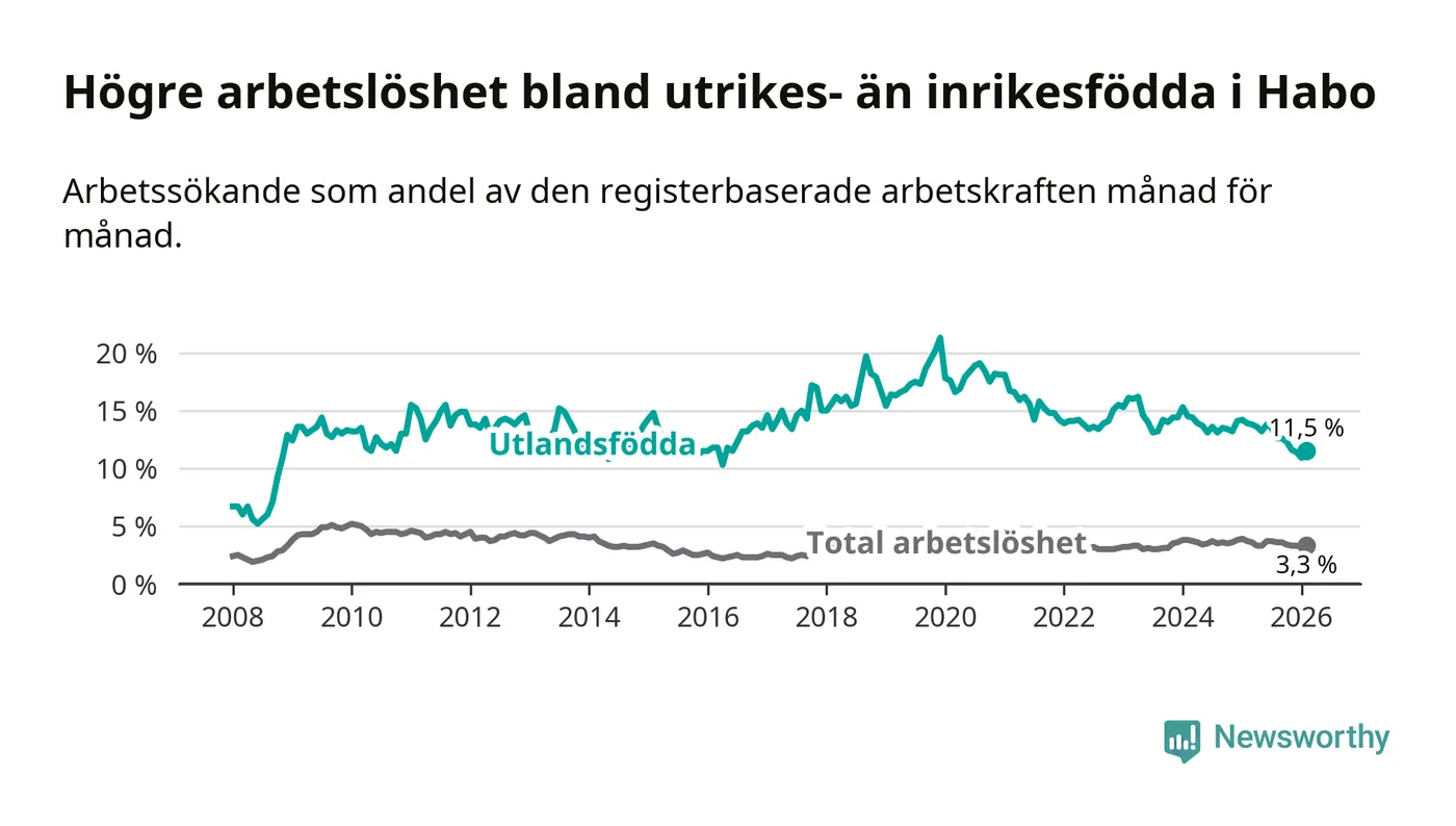 Arbetslösheten bland utlandsfödda var 11,5 procent i Habo under februari månad, motsvarande 78 av 678 personer. Det är 2,4 procentenheter färre än vid samma tidpunkt i fjol (−16 om man räknar personer). Därmed är de utlandsföddas arbetslöshet lägre än vid samma tidpunkt i fjol för åttonde månaden i följd. Sedan juni 2025 har arbetslösheten bland utlandsfödda minskat från 13,8 till 11,5 procent.