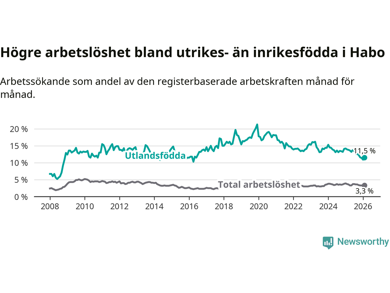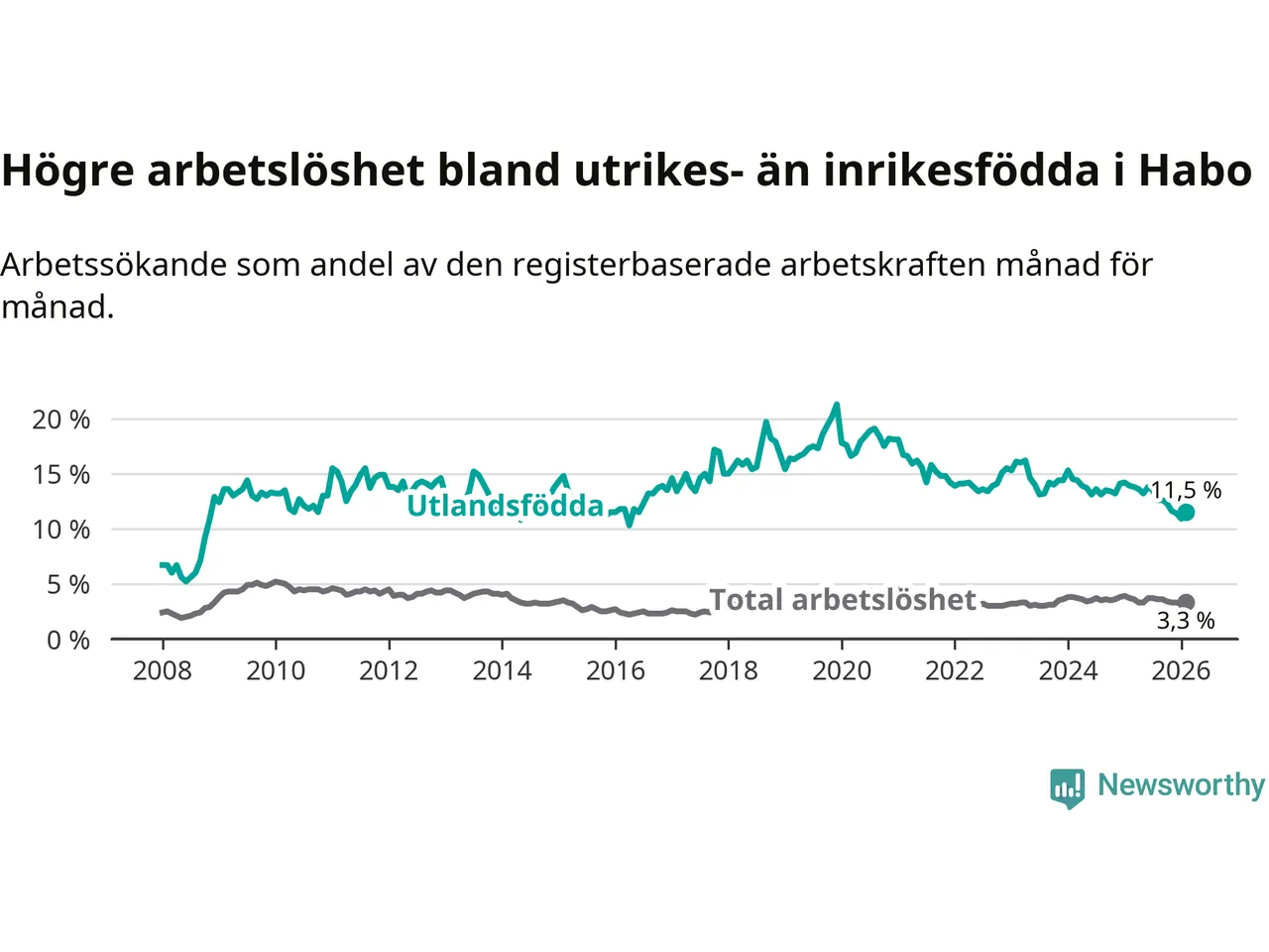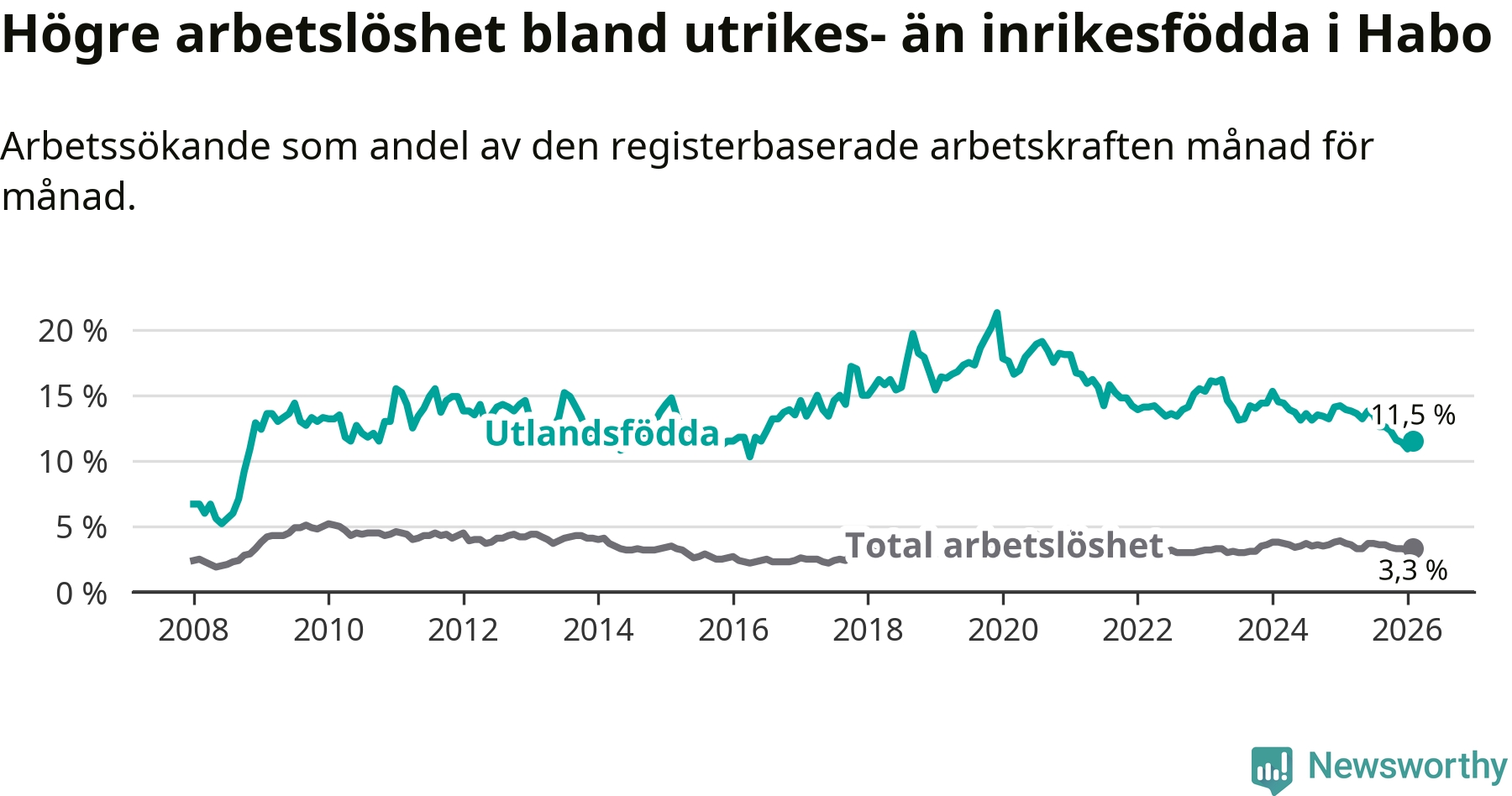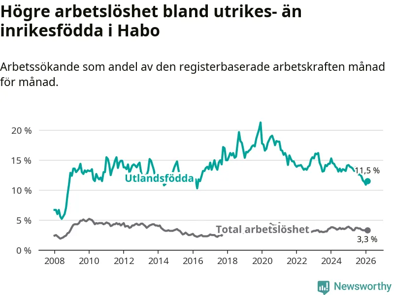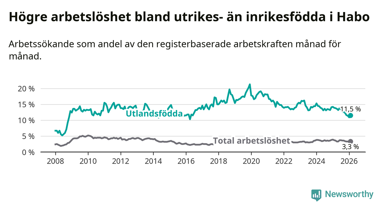 Arbetslösheten bland utlandsfödda var 11,5 procent i Habo under februari månad, motsvarande 78 av 678 personer. Det är 2,4 procentenheter färre än vid samma tidpunkt i fjol (−16 om man räknar personer). Därmed är de utlandsföddas arbetslöshet lägre än vid samma tidpunkt i fjol för åttonde månaden i följd. Sedan juni 2025 har arbetslösheten bland utlandsfödda minskat från 13,8 till 11,5 procent.