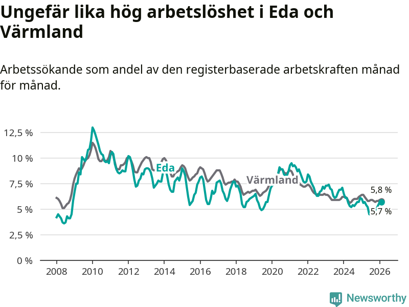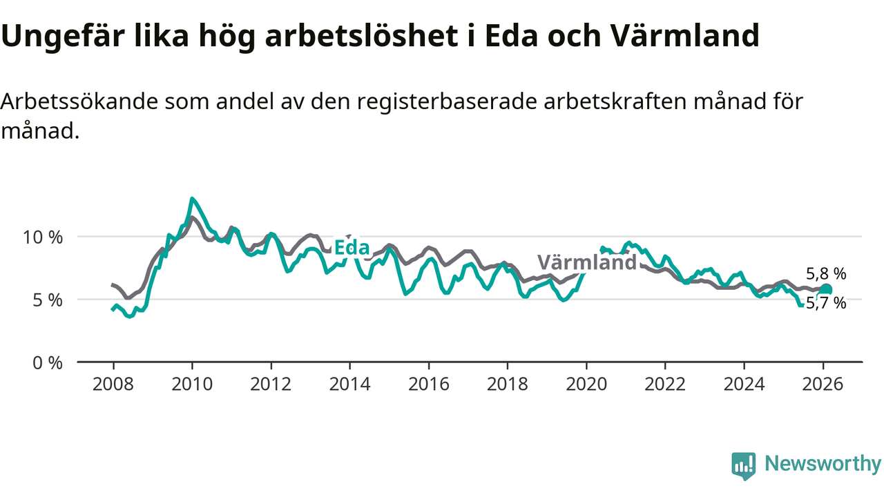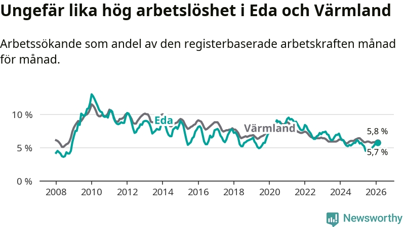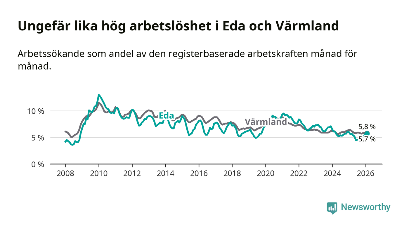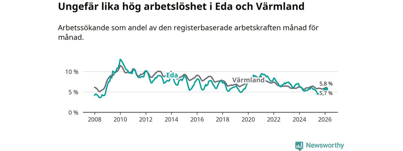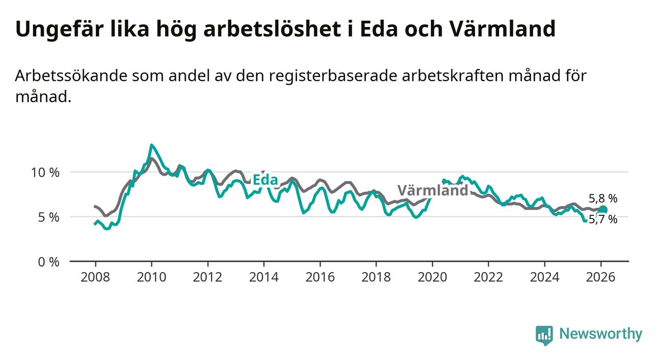 Under februari månad rapporterade Eda kommun en total arbetslöshet på 5,7 procent. Det är en ökning jämfört med samma tidpunkt i fjol (+0,1 procentenheter). I Värmlands län däremot sjunker arbetslösheten .