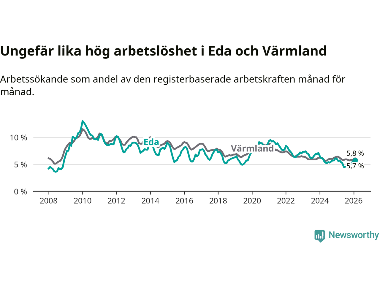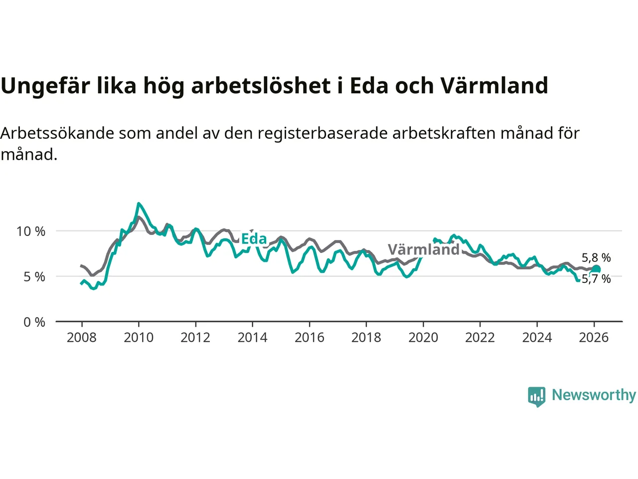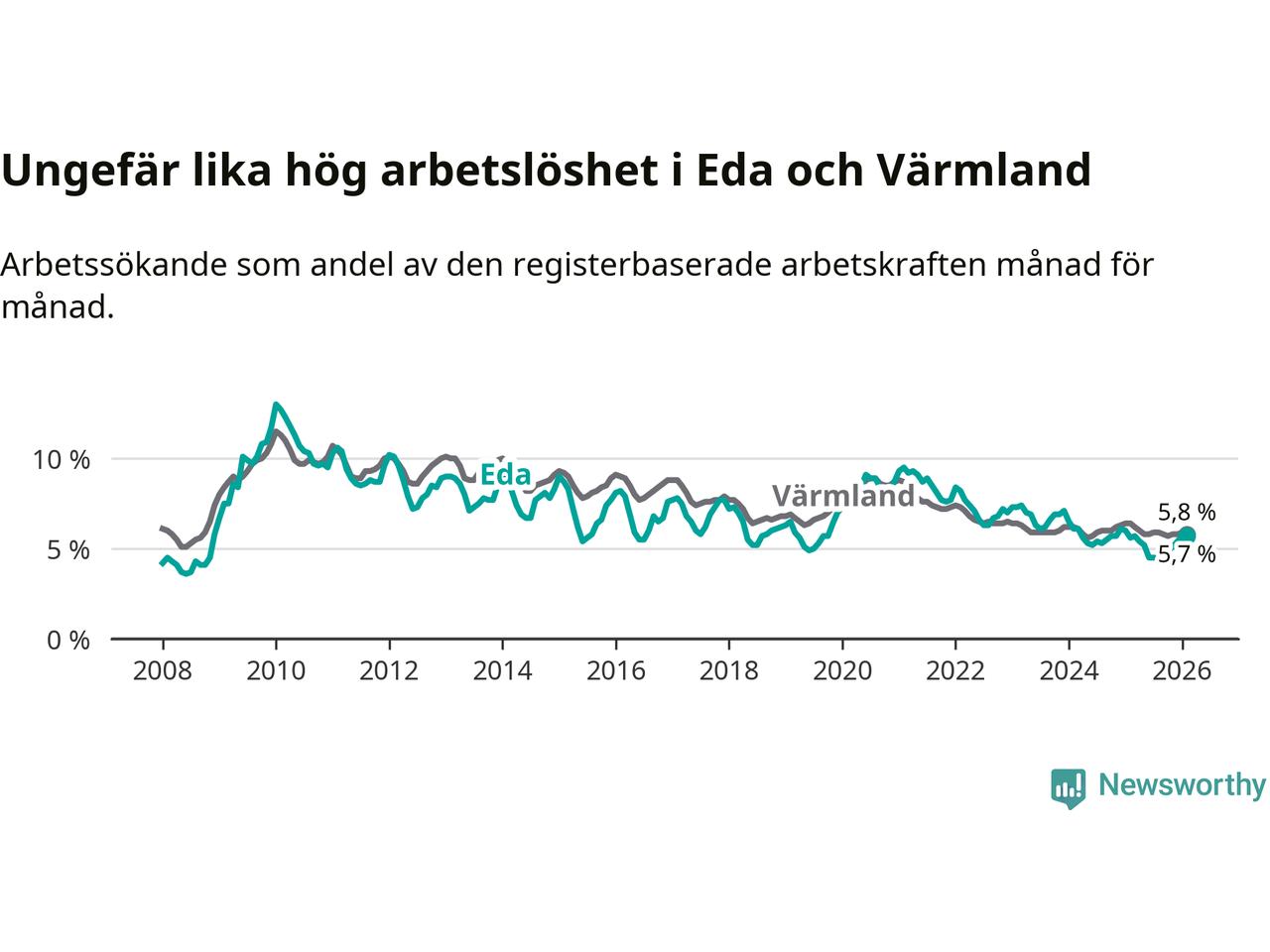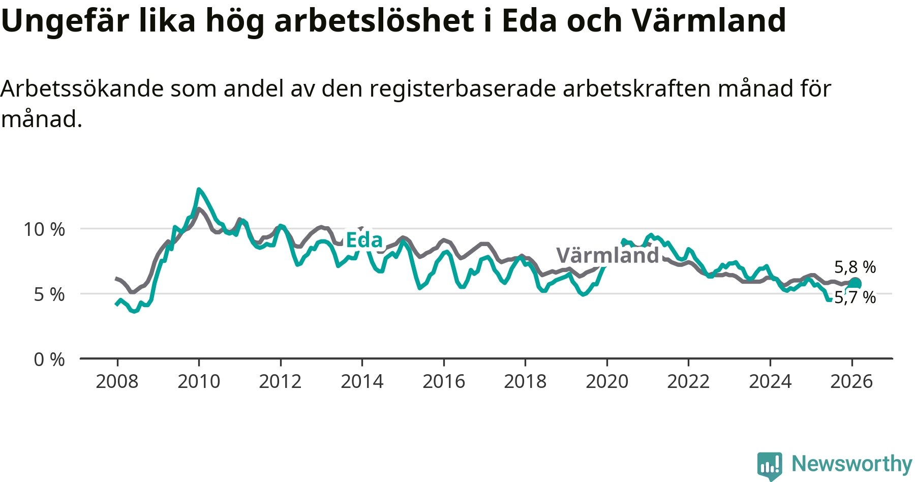 Under februari månad rapporterade Eda kommun en total arbetslöshet på 5,7 procent. Det är en ökning jämfört med samma tidpunkt i fjol (+0,1 procentenheter). I Värmlands län däremot sjunker arbetslösheten .