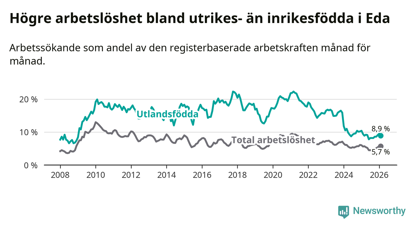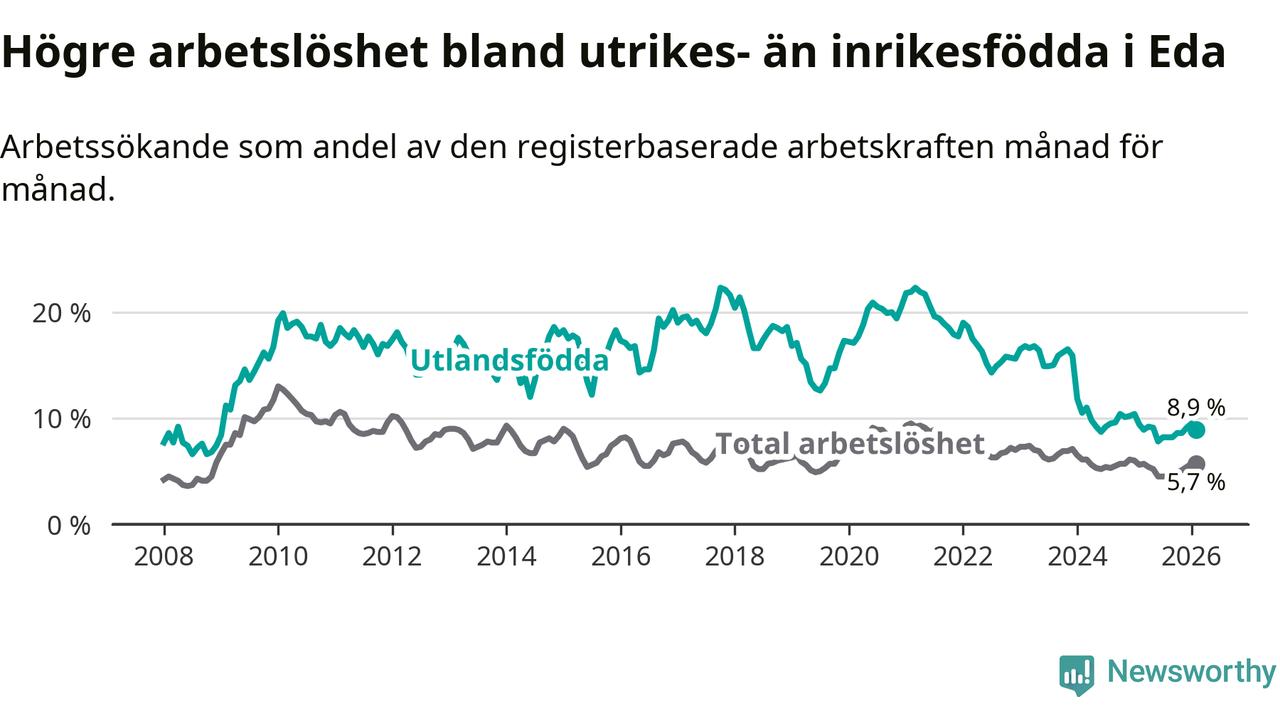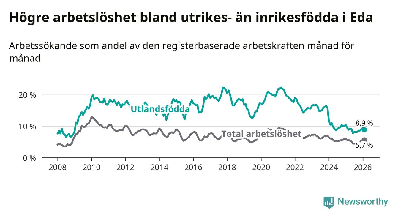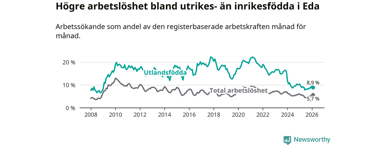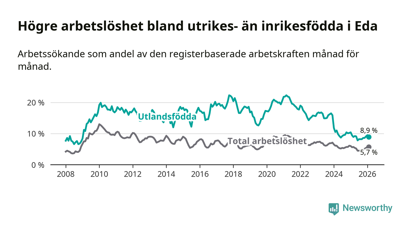 Arbetslösheten bland utlandsfödda var 8,9 procent i Eda under februari månad, motsvarande 97 av 1 090 personer. Det är 0,5 procentenheter färre än vid samma tidpunkt i fjol (−8 om man räknar personer). Därmed har de utlandsföddas arbetslöshet varit lägre än vid samma tidpunkt i fjol i över två år i sträck. Sedan december 2023 har arbetslösheten bland utlandsfödda minskat från 15,9 till 8,9 procent.