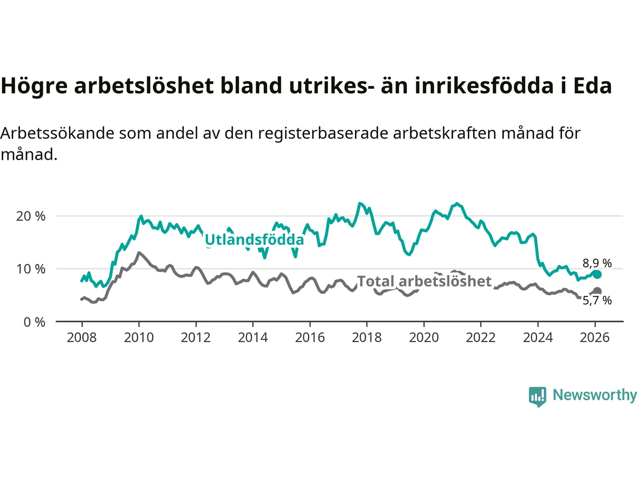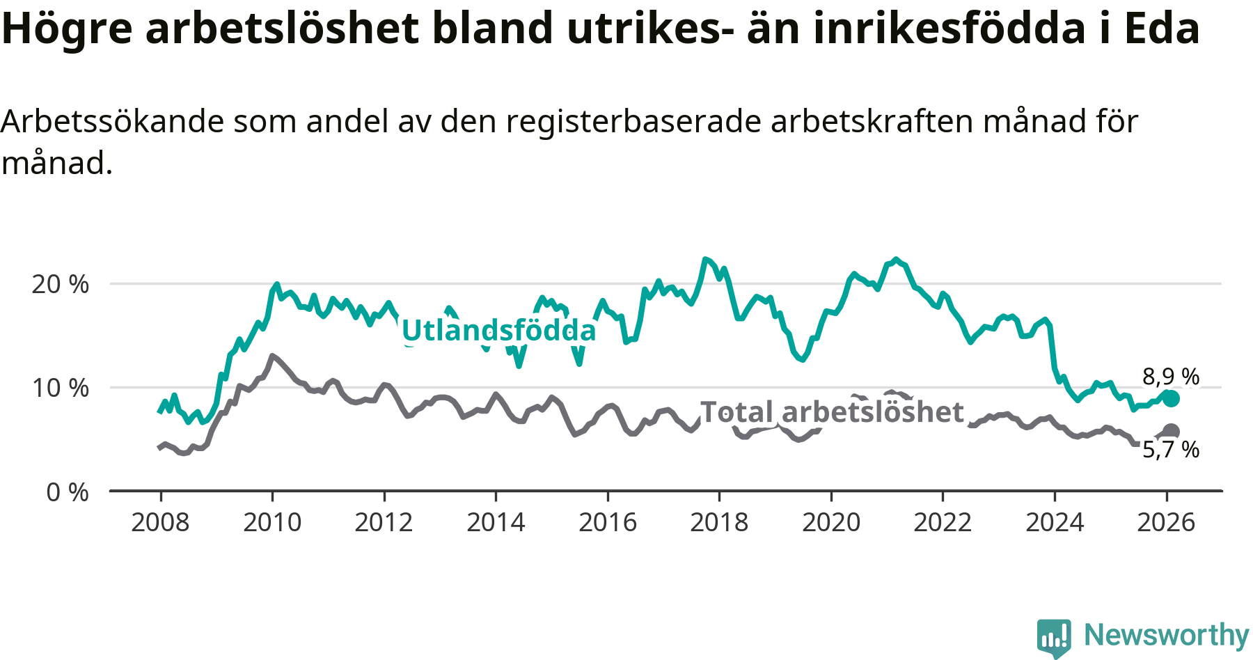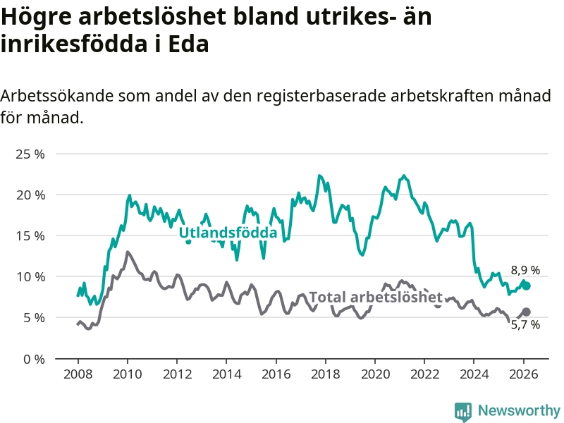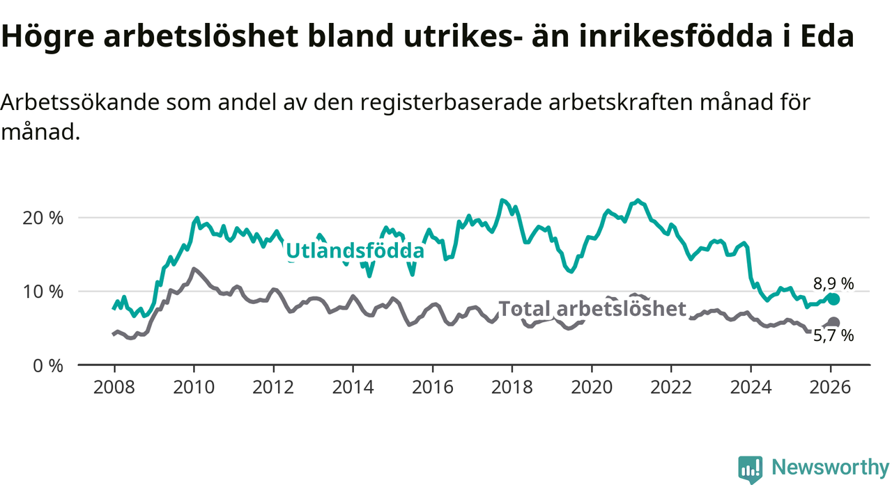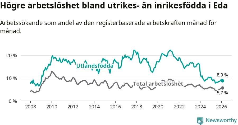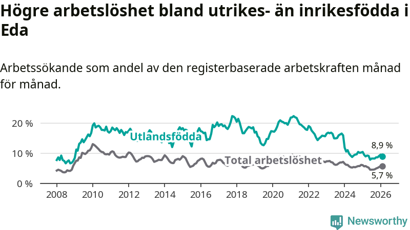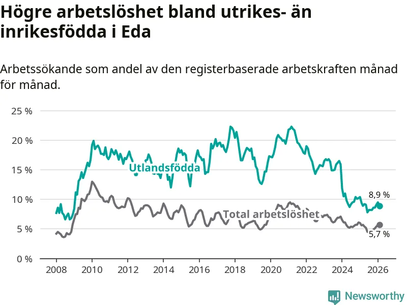 Arbetslösheten bland utlandsfödda var 8,9 procent i Eda under februari månad, motsvarande 97 av 1 090 personer. Det är 0,5 procentenheter färre än vid samma tidpunkt i fjol (−8 om man räknar personer). Därmed har de utlandsföddas arbetslöshet varit lägre än vid samma tidpunkt i fjol i över två år i sträck. Sedan december 2023 har arbetslösheten bland utlandsfödda minskat från 15,9 till 8,9 procent.