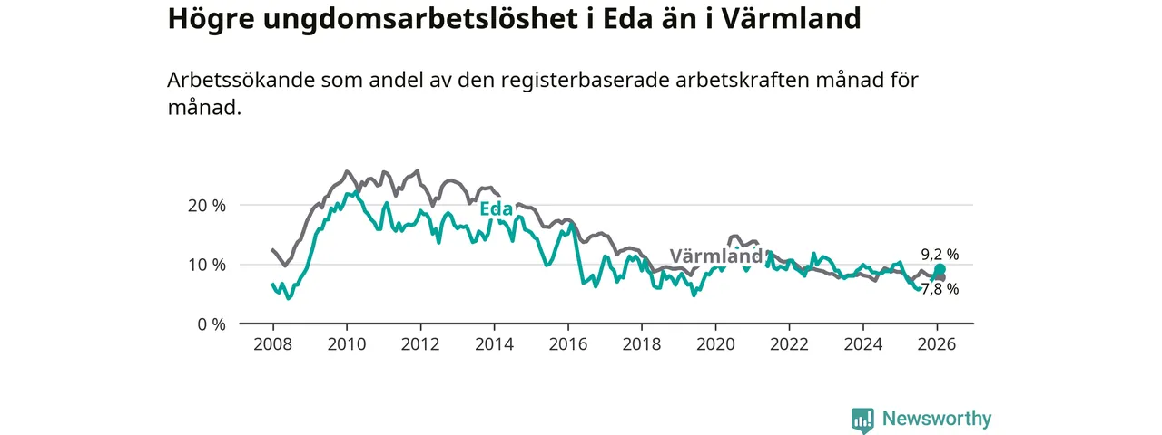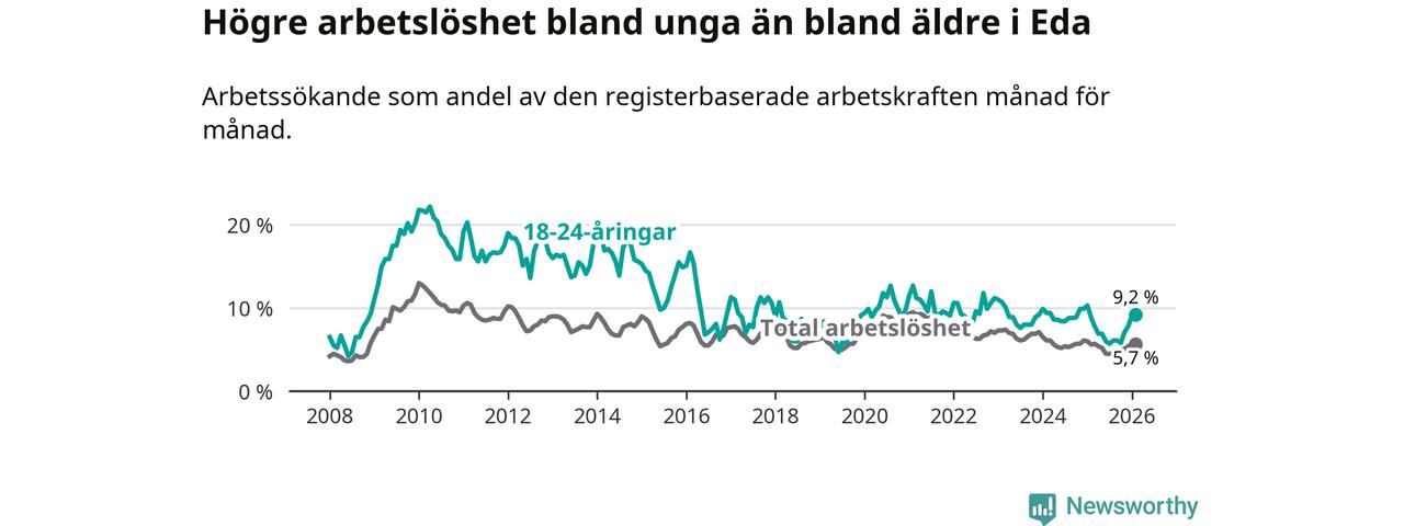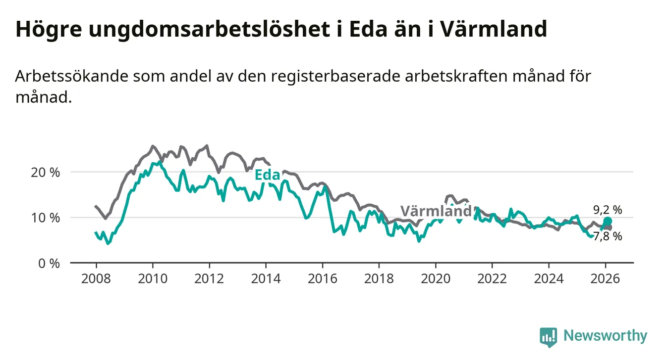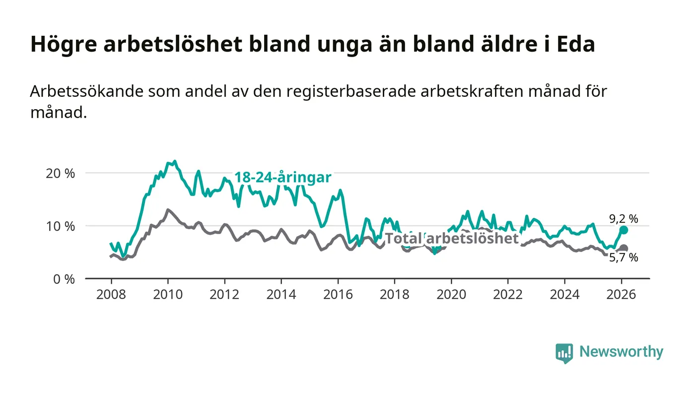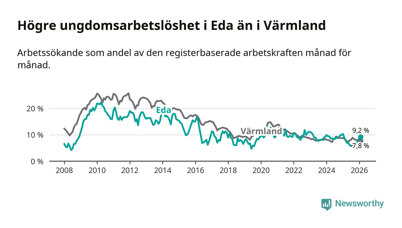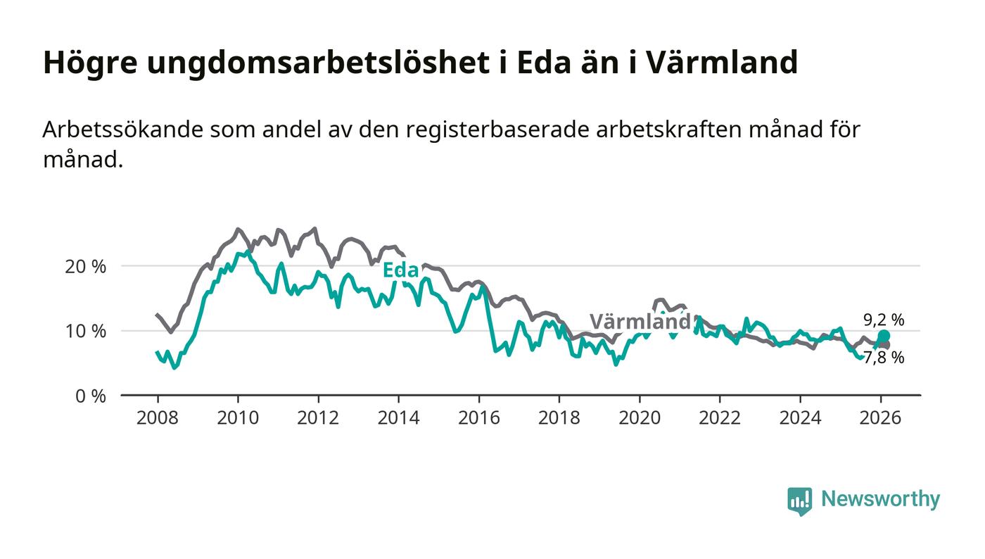 Medan Eda har ungefär samma total arbetslöshet som Värmland, ligger ungdomsarbetslösheten 1,4 procentenheter högre i Eda.