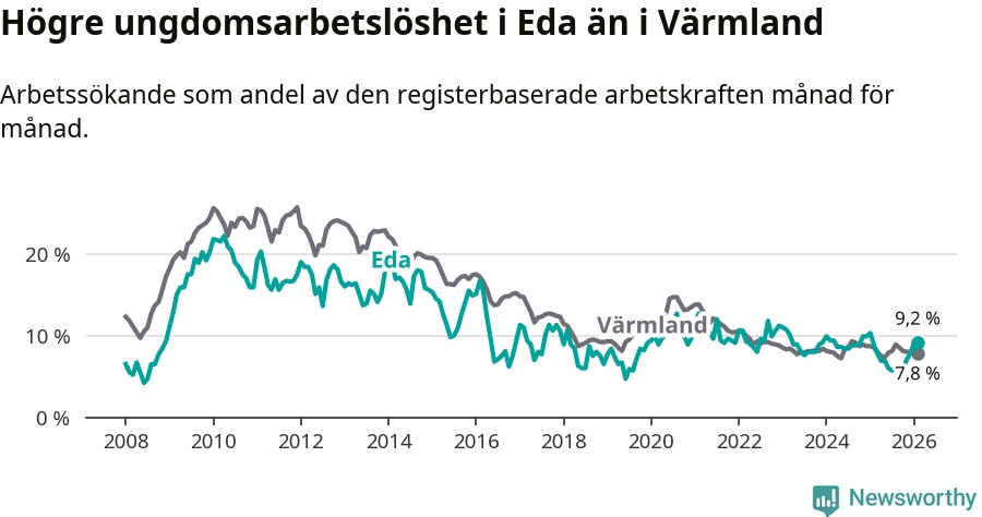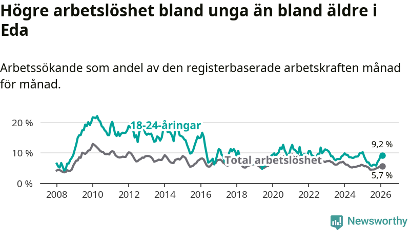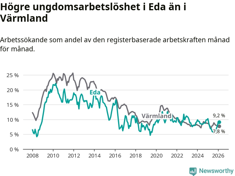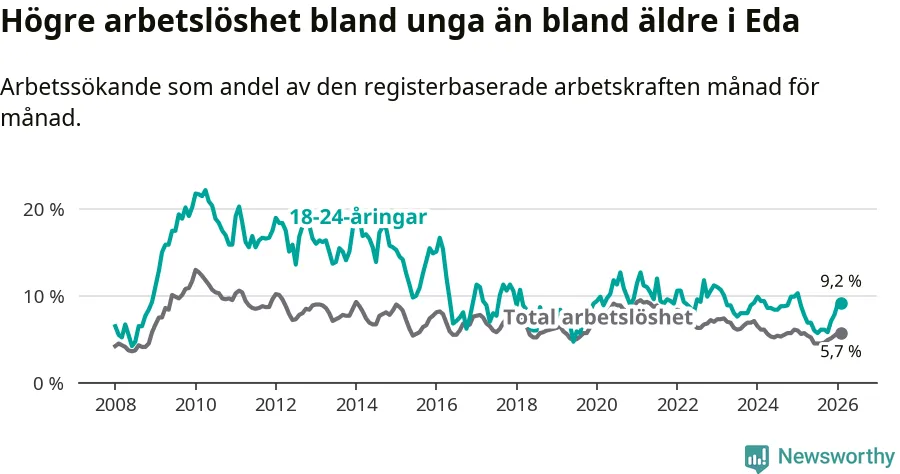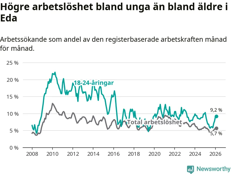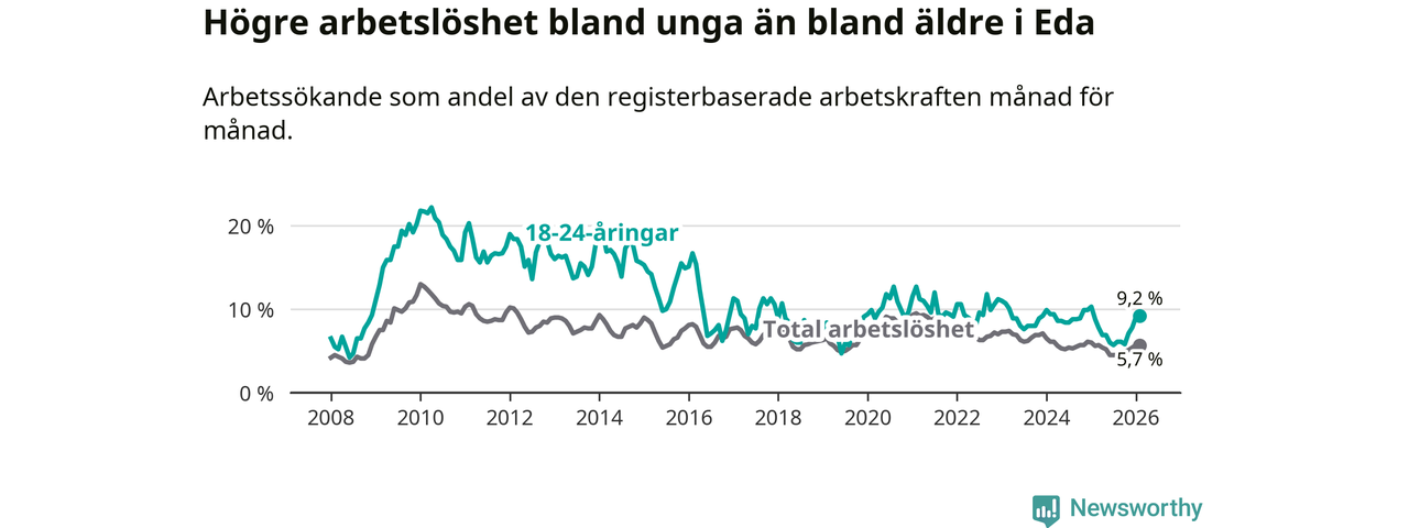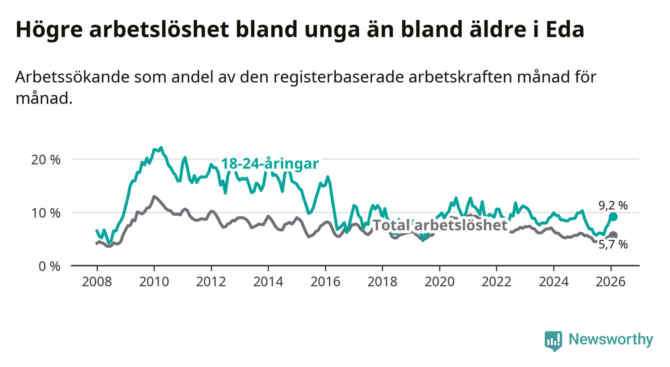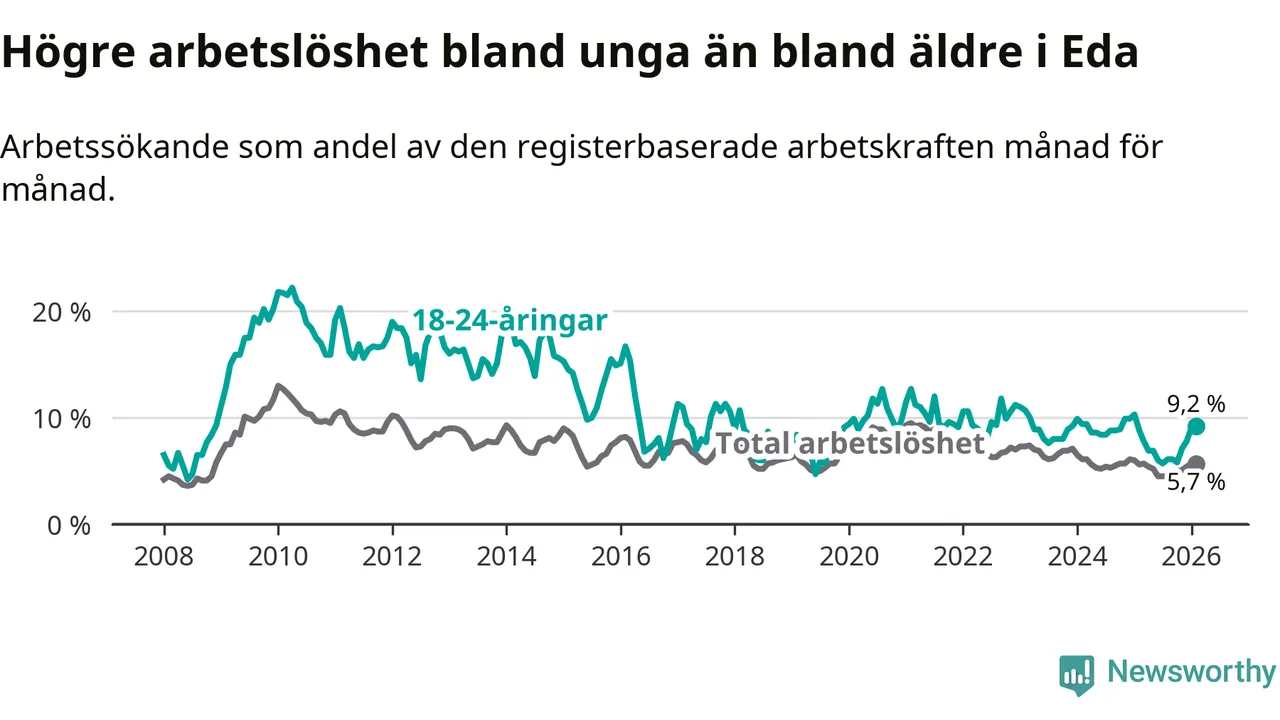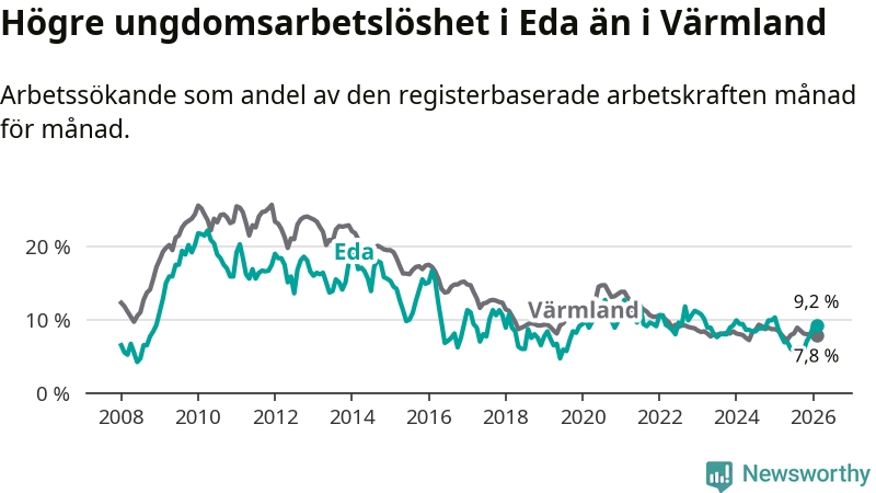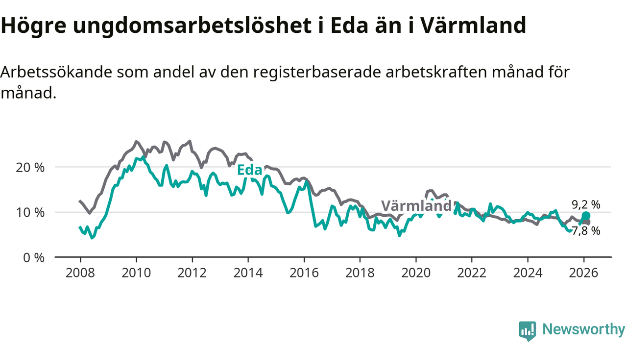 Medan Eda har ungefär samma total arbetslöshet som Värmland, ligger ungdomsarbetslösheten 1,4 procentenheter högre i Eda.